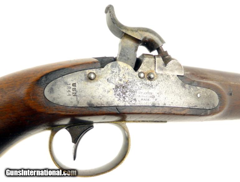 U.S. 1842 Navy Box Lock pistol. By N.P. Ames of Springfield, Massachusettes. Dated 1844 and USN on tail of lock. Cartouche on stock. Lock has a light to medium pit on the lock. Barrel has very good inpector marks and no pits. Stock is very good. Gun is very good overall.