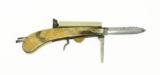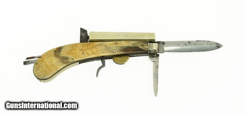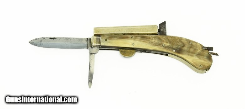 Unwin & Rodgers Knife Pistol Unmarked. Percussion variation, 3 3/8” barrel. 2 blades in very good condition. Action works perfectly. Grip panels are horn and are excellent. Butt trap door works and snaps shut correctly. Tweezers and pricker for touch hole in the grips. Very good plus to excellent condition. Very fine oddity pistol!