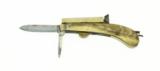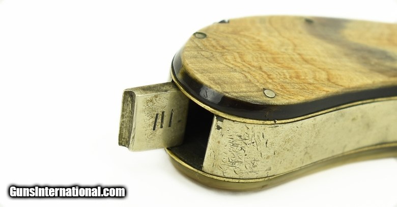 Description: Unwin & Rodgers Knife Pistol Unmarked. Percussion variation, 3 3/8” barrel. 2 blades in very good condition. Action works perfectly. Grip panels are horn and are excellent. Butt trap door works and snaps shut correctly. Tweezers and pricker for touch hole in the grips. Very good plus to excellent condition. Very fine oddity pistol! SOLD Antique: Yes |