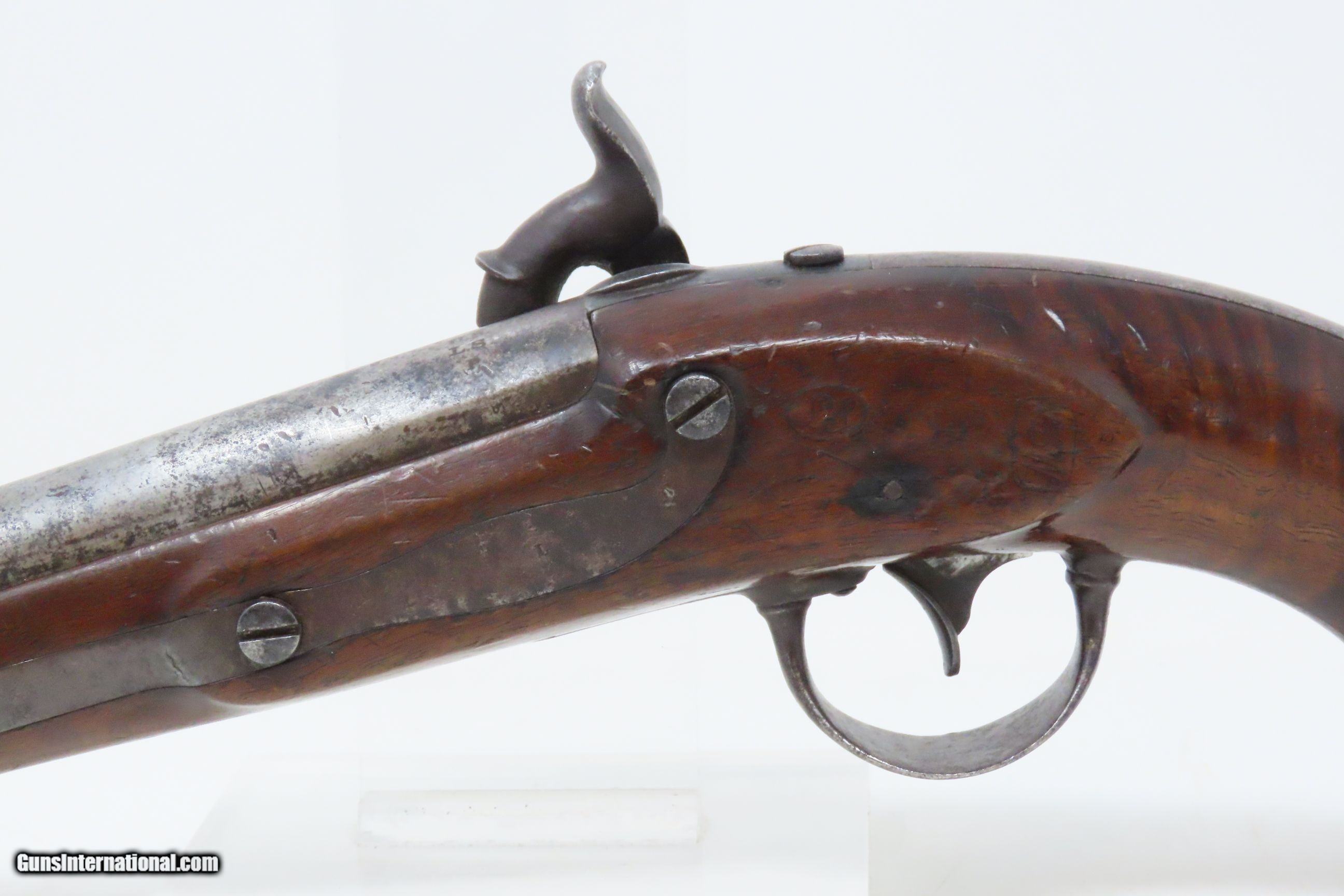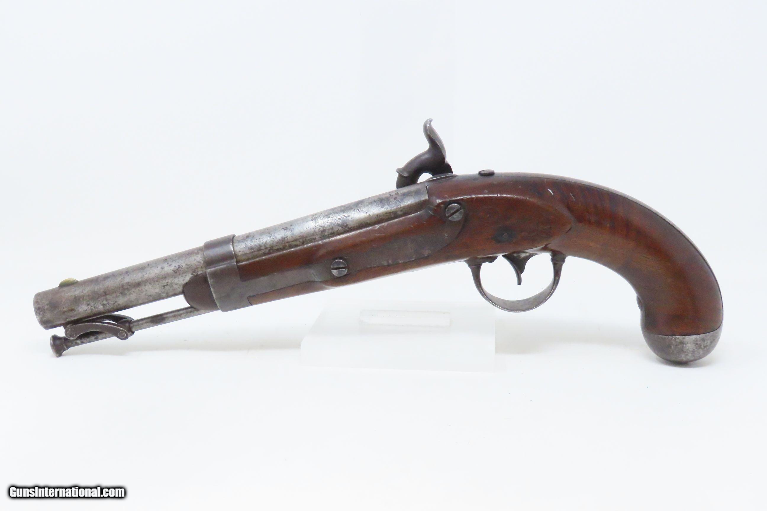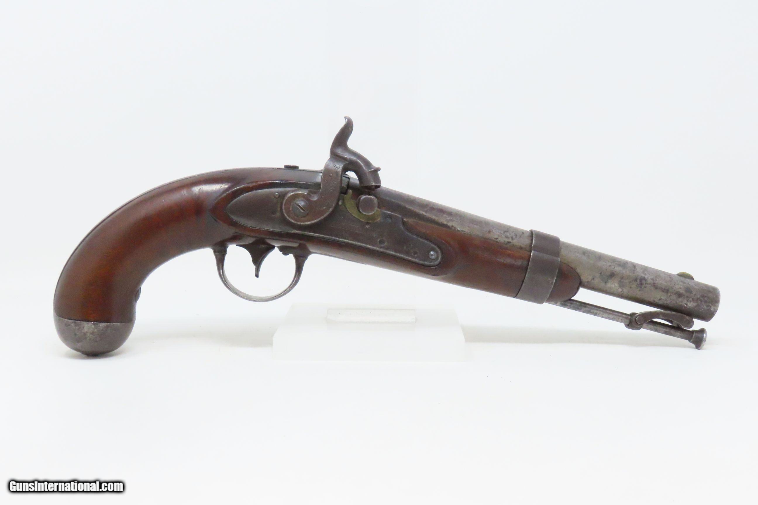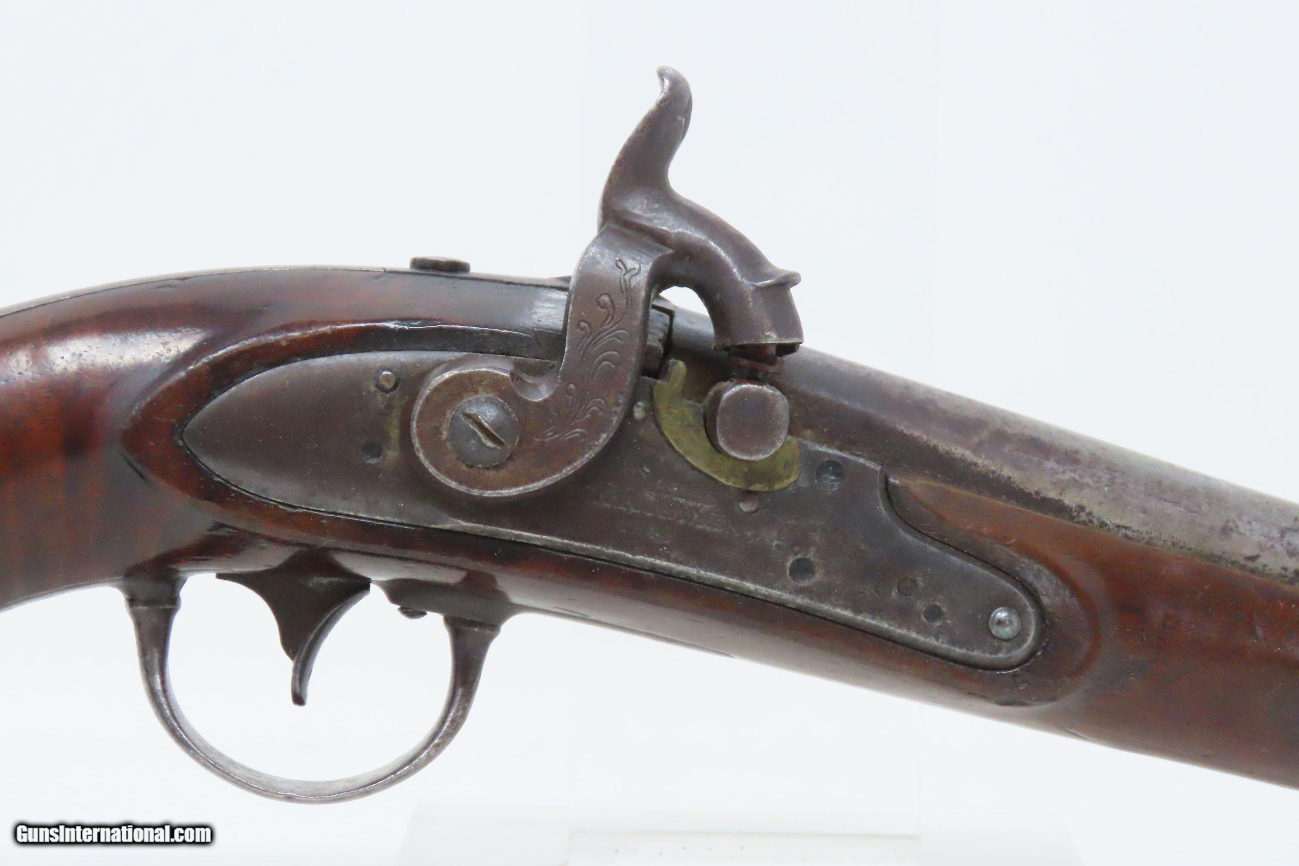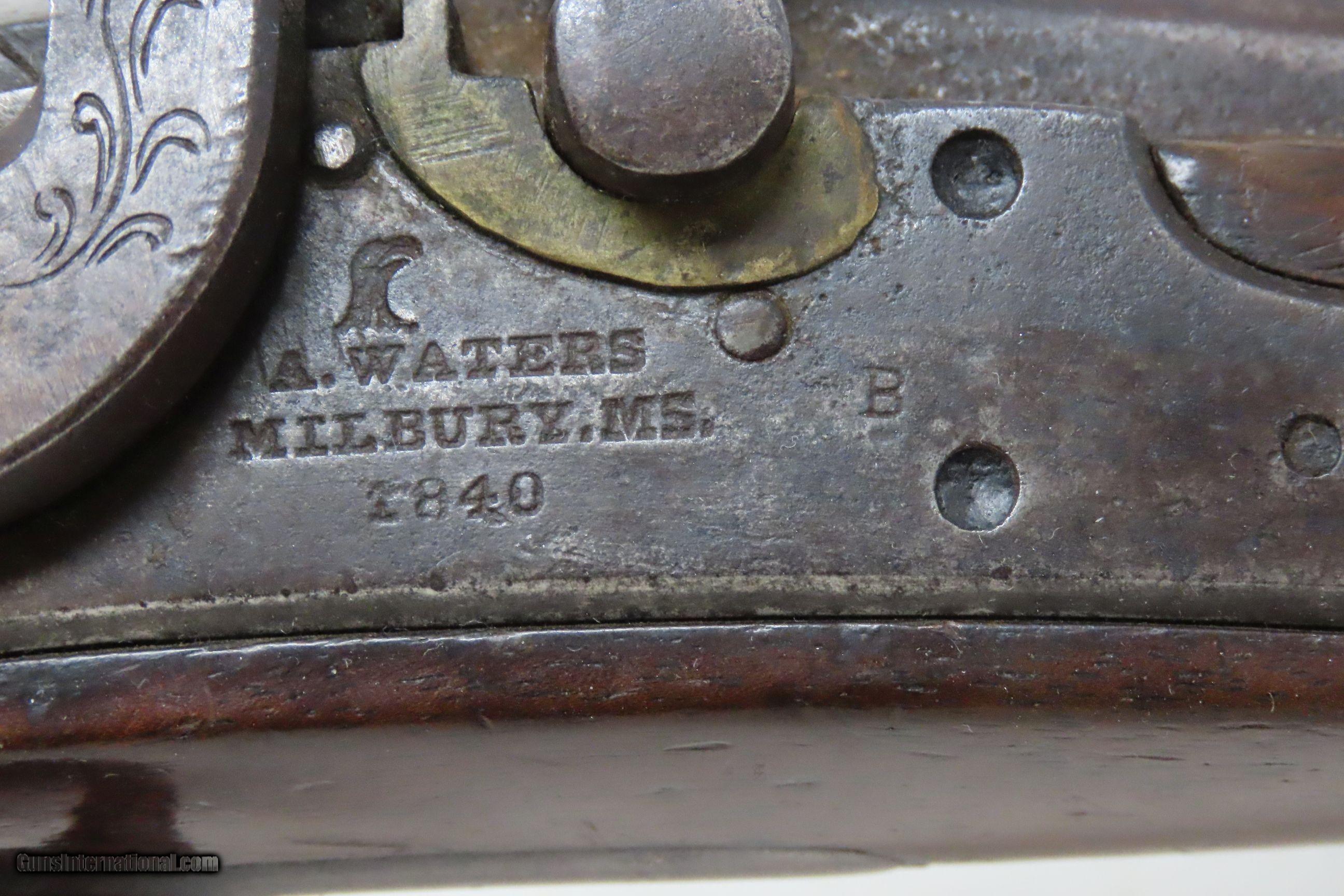 Description: 1840 WATERS US Model 1836 DRAGOON Pistol .54 CIVIL WAR Confederate Antique Made During the Mexican-American War & Used in the ACW Here we present an antique Asa H. Waters U.S. Model 1836 Pistol, made in 1840. This pistol would have started out life as a flintlock and had a period conversion as the new percussion technology developed. There were actually two manufacturers of these guns: Asa Waters and Robert Johnson. Combined, the production totals were 41,000 guns. This was the last U.S. martial pistol to use the flintlock system, and many consider this the best of all U.S. flint guns due to its craftsmanship and aesthetic appeal. The gun is historically significant as this was the primary issue pistol during the Mexican American War (1846-1848) and was even significantly used during the American Civil War (1861-1865), especially in this percussion converted format. This one is a commercial conversion prevalent in the Confederacy as these flintlocks were in local militias and armories in the South when the American Civil War began. This one has a commercial hammer with some modest engraving to replace the original cock, the flash pan was ground just enough to get this bolster drum installed, and the frizzen assembly was simply removed. The lock plate is roll-stamped with an eagle head above "A. WATERS/MILBURY. MS./1840" in three lines. There is a single letter “B” inspection mark also on the lock. The overall condition is good. The action is strong. The bore is patinated and smooth. The stock is solid with some superior grain structure in the top portion. Own the original! This is a legitimate antique and not a reproduction. Barrel is 8-1/2 inches. Caliber: .54 Percussion Overall condition as seen in photos. Very Fast. Very Safe. FREE SHIPPING WORLDWIDE. Delivered directly to your door by express mail! Guaranteed AUTHENTIC & Includes CERTIFICATE OF AUTHENTICITY. ancestryguns $1700 #230033 SOLD Antique: Yes |