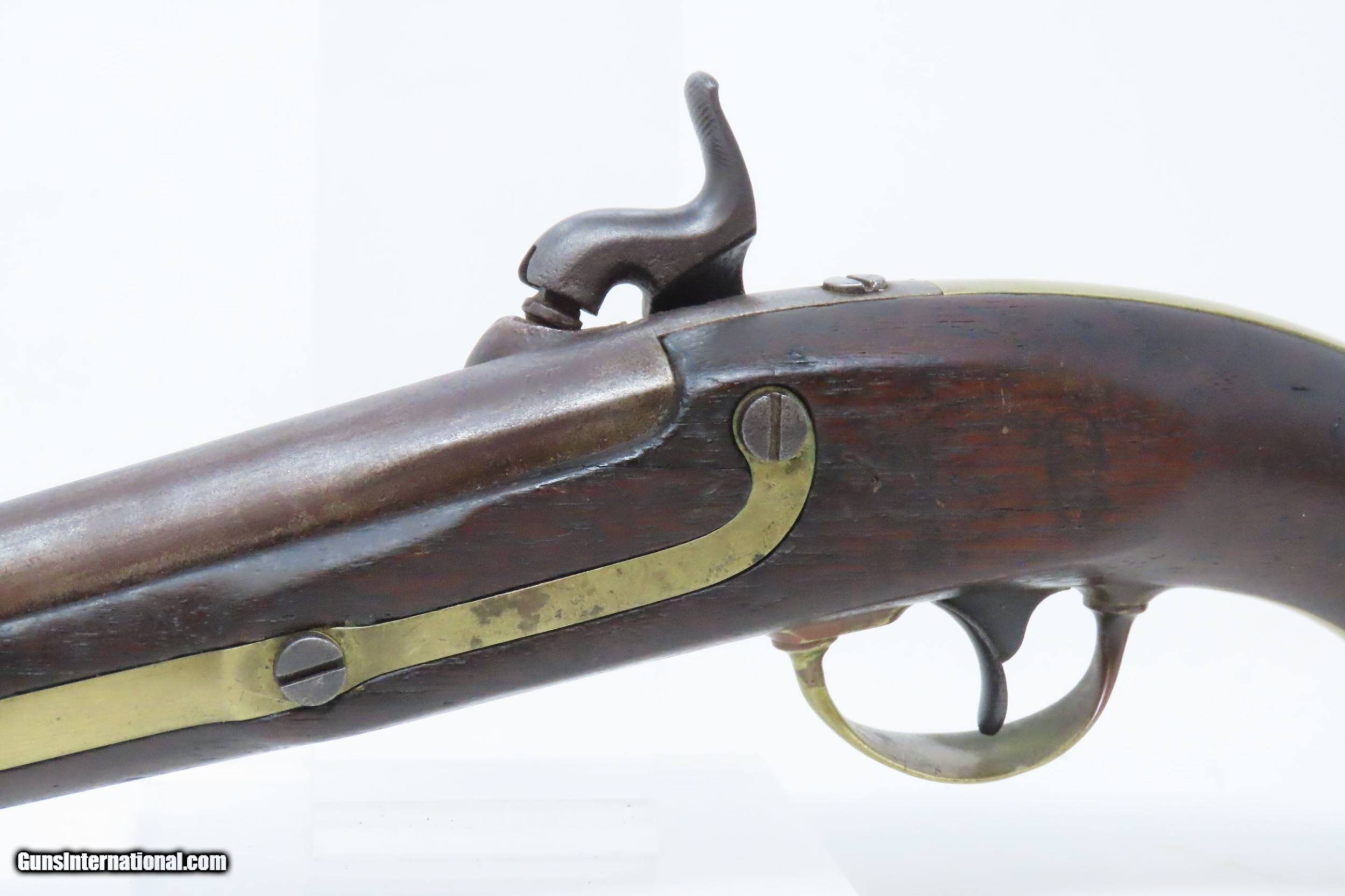 Description: 1851 HENRY ASTON US Contract Model 1842 DRAGOON .54 Cal. Smoothbore Pistol Antebellum Percussion U.S. Military Contract Pistol Here we present an antique Henry Aston U.S. Contract Model 1842 Dragoon’s Percussion Pistol, made in 1851 in Middletown, Connecticut. Henry Aston was a gunmaker from Middletown who received a government contract to produce 24,000 Model 1842 pistols in his first contract for the firearm that spanned from 1846-1851. Between 1851 and 1852, he received a second contract for an additional 6,000 units. Because of the overlapping 1851 dates, it is unclear if this example is from the first 24,000 or from the second 6,000. The Model 1842 saw service during a time of great change and increasing tension, as well as firearms innovation. The Mexican-American War (1846-1848), the numerous conflicts with Native Americans, annexing of new territory, the rising blood-pressure over slavery, and a quick 36% population increase that all culminated in the blood-letting of the American Civil War. This was the first official percussion pistol to be adopted by the U.S. and simultaneously the last large smooth bore single shot pistol. By 1845 it was the primary issued weapon to the First and Second Regiment of Dragoons, replacing many of their Model 1836 flintlocks, just in time for the Mexican-American War. The Model 1842 was the last single shot smoothbore pistol issued by the U.S. Army. The 1842 features sturdy construction with lots of brass for support. This was important during a time when one would expend their shots and still have a fight on their hands. Striking your opponent with the pommel of your gun was quite effective. The ramrod is captive, so that it would not be lost in the heat of battle on top of a horse. Many of these were used, especially initially, by both sides during the American Civil War. The overall condition is good. This example sports a solid stock/grip with an expected amount of wear. Cartouche remnants can be seen on the left wrist. Legible markings. “1851” dated lock. The bore is in good shape for its age. Strong action. Own the original! This is a legitimate antique and not a reproduction. Barrel is 8-1/2 inches. Caliber: .54 Percussion Overall condition as seen in photos. Very Fast. Very Safe. FREE SHIPPING WORLDWIDE. Delivered directly to your door by express mail! Guaranteed AUTHENTIC & Includes CERTIFICATE OF AUTHENTICITY. ancestryguns $1400 #217303 SOLD Antique: Yes |