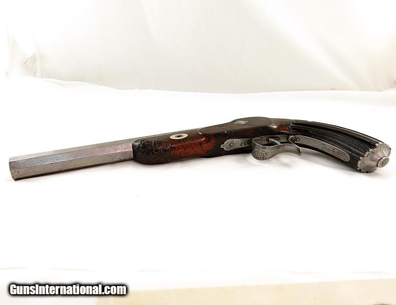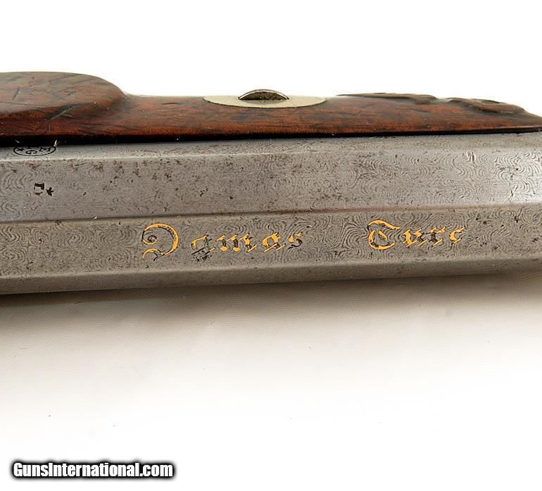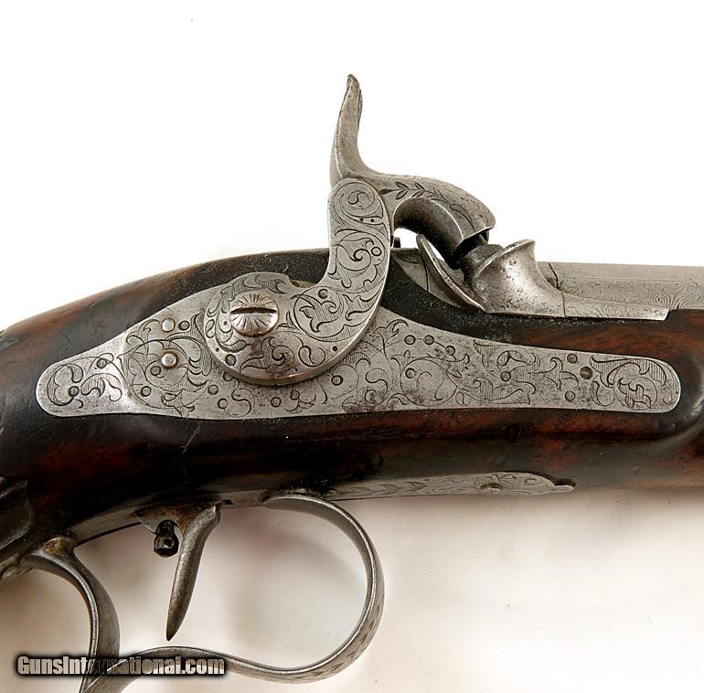 Description: 19th Cen Engraved European Percussion Dueling Pistol. Very nice overall. Approx. .50 cal. Nicely engraved. Has gold inlaid name on top of barrel. Set trigger. Good wood with normal wear for age. SOLD Antique: Yes |