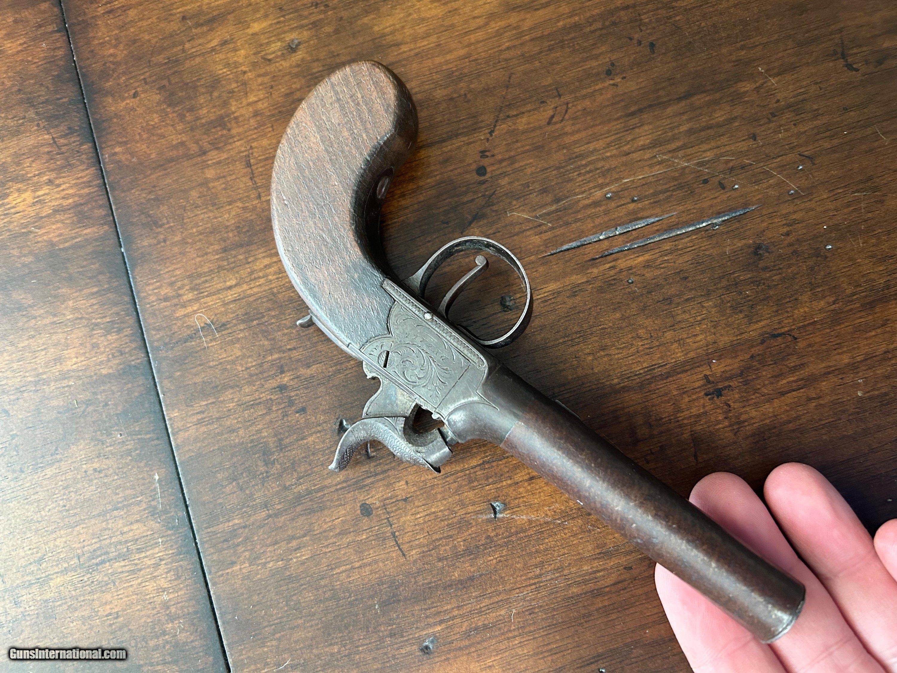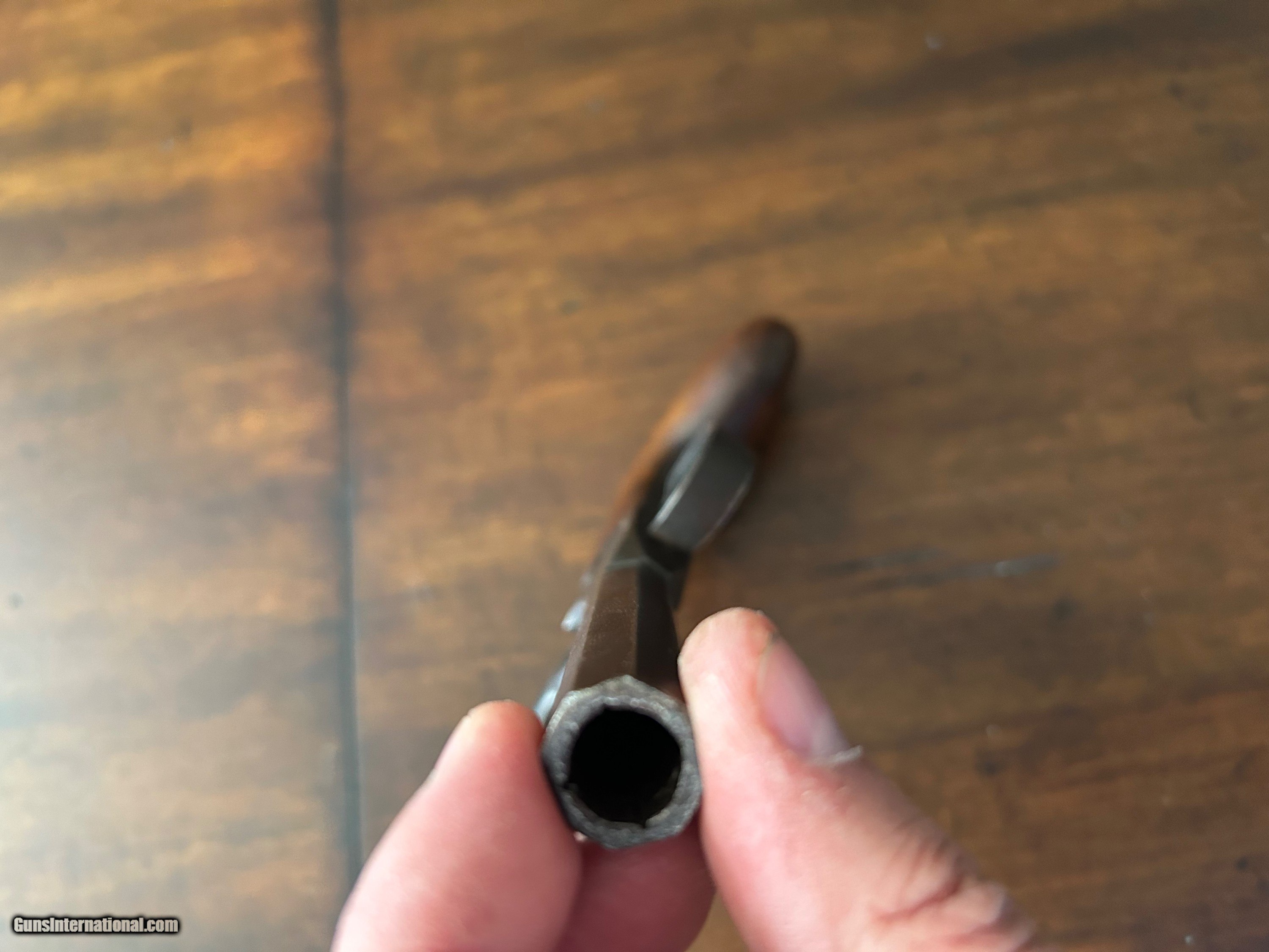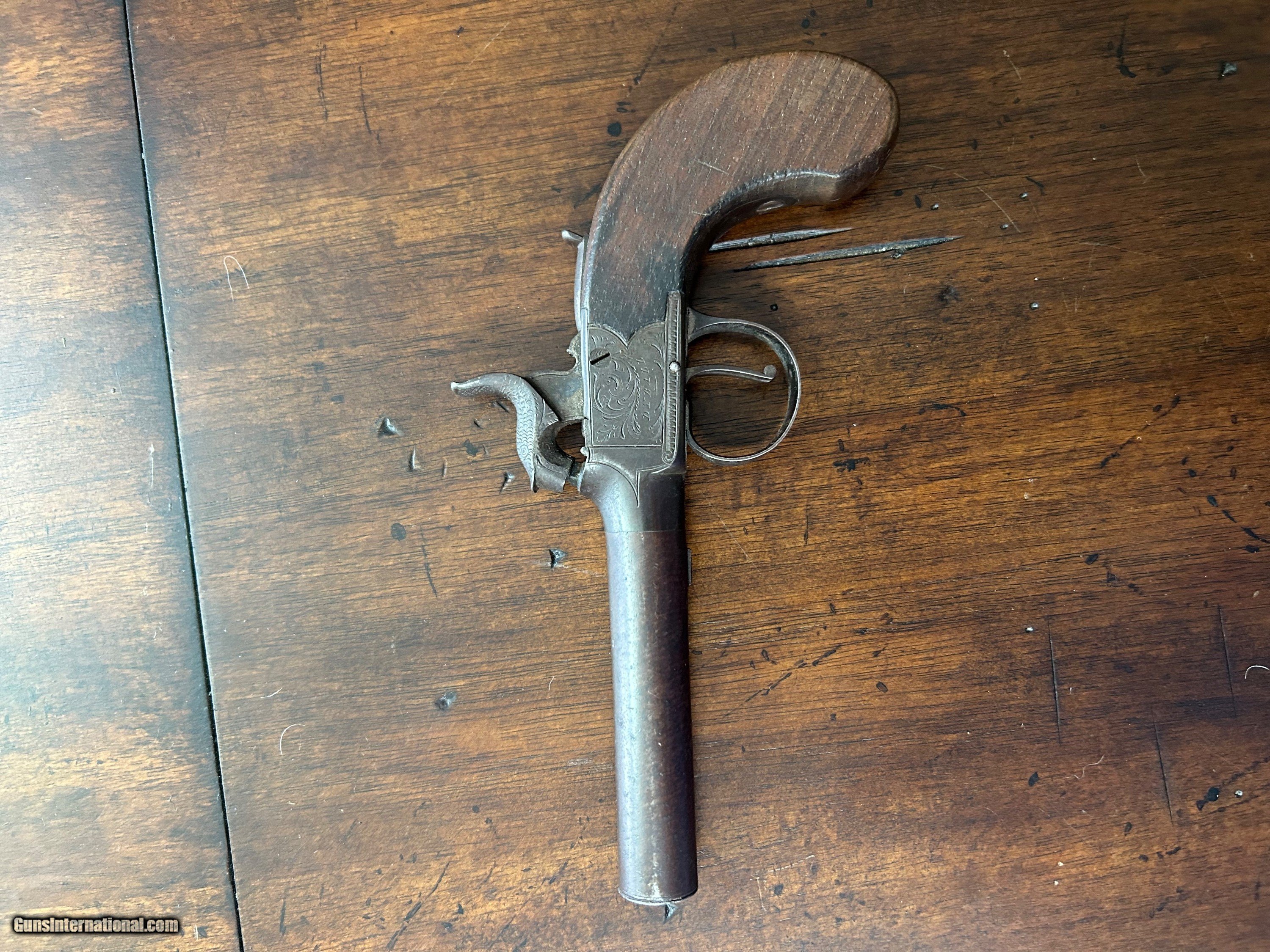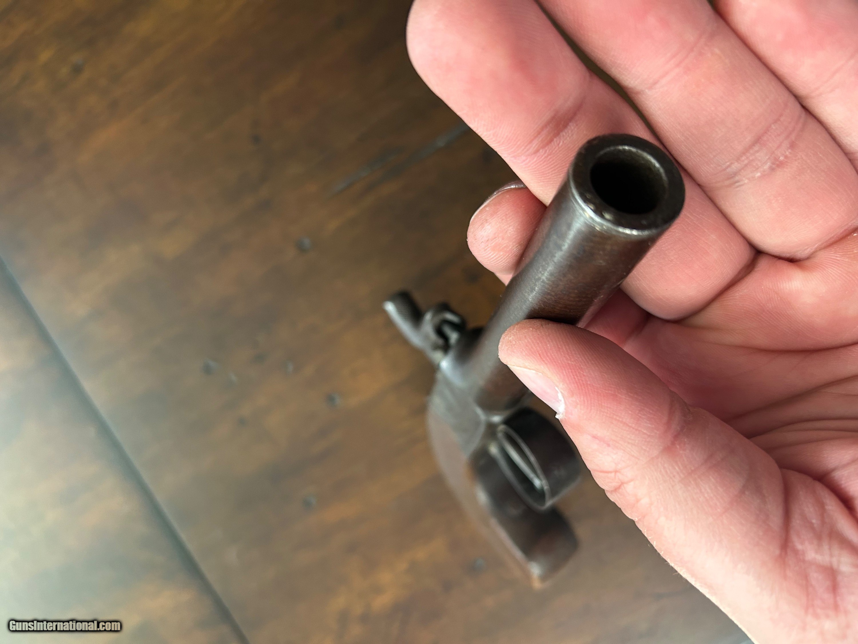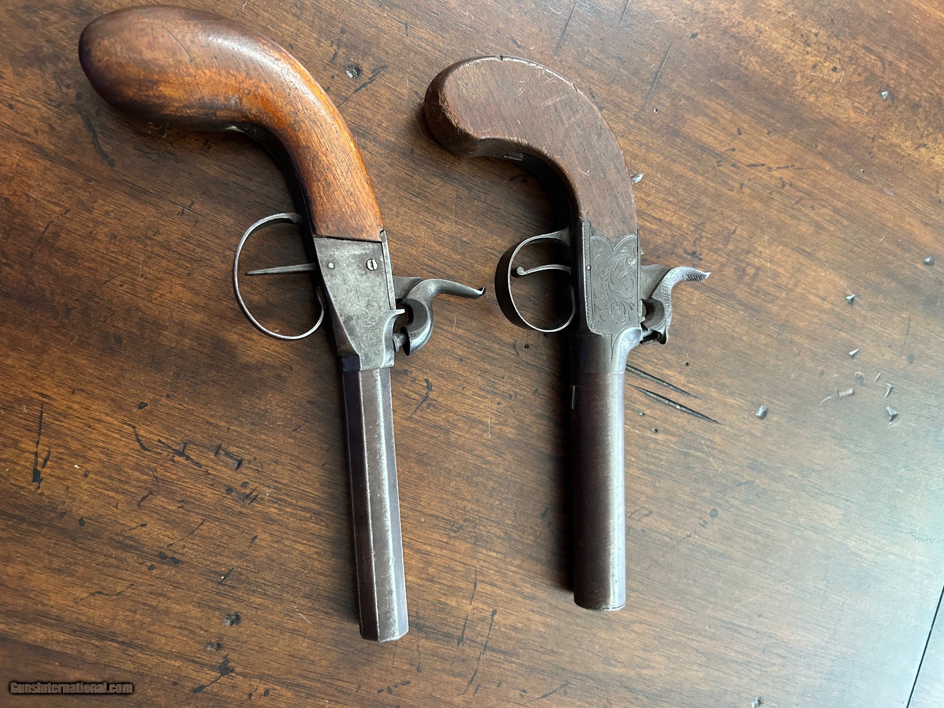 Description: Here we have two antique boot pistols for one money. Norich Dyball .45 caliber. Nice shape. Functions well. Nice damacas barrel with good bore. .41 caliber unmarked maker. Functions well. Bore looks usable. Selling as a pair. FREE SHIPPING where permitted. Can ship antique Pre-1898 to the door if permitted in your area. SOLD Antique: Yes Manufacturer: Norich English Derringer Boot Antique |