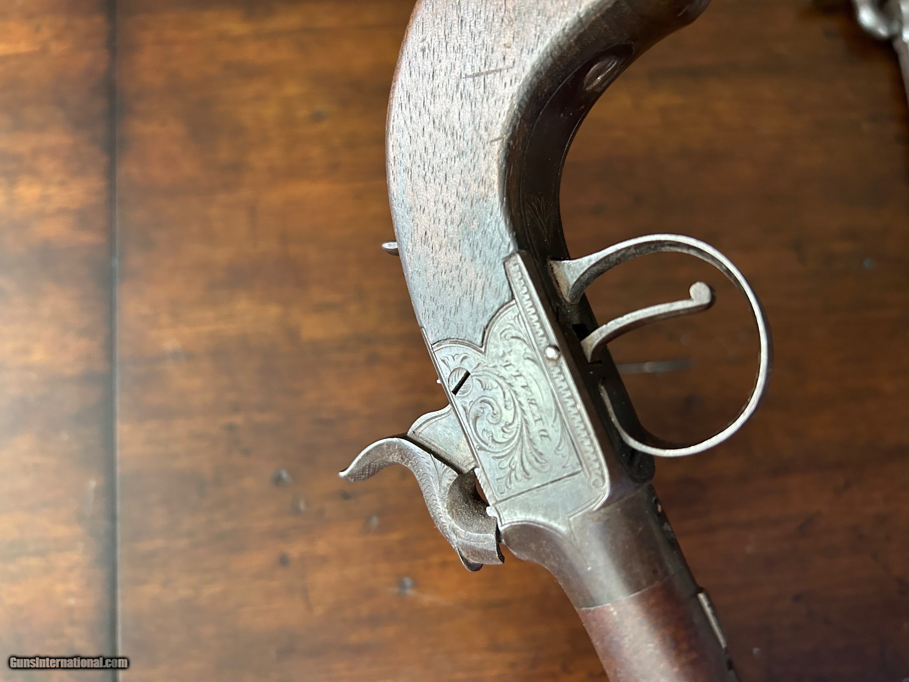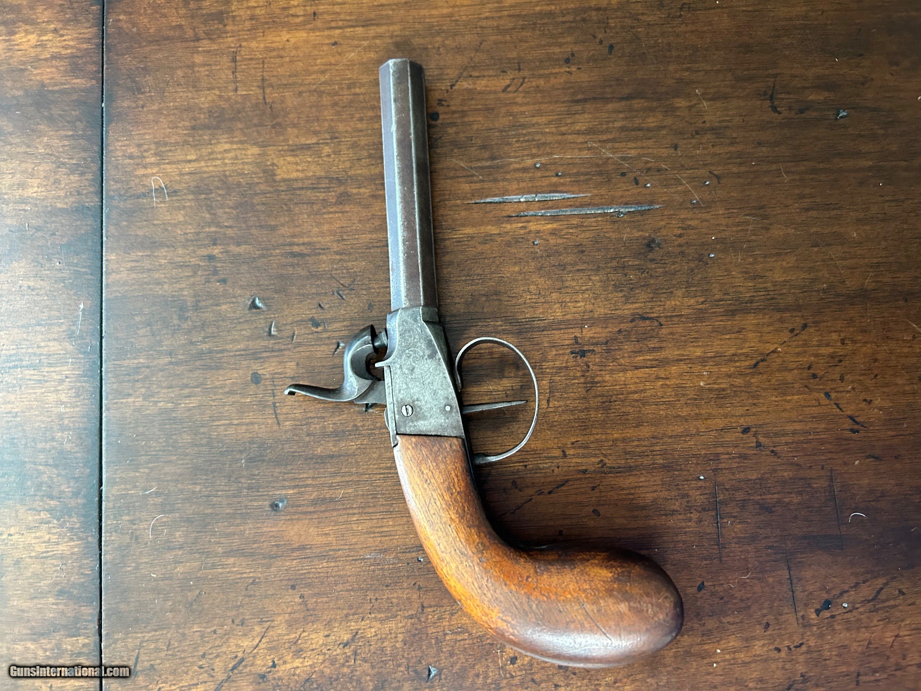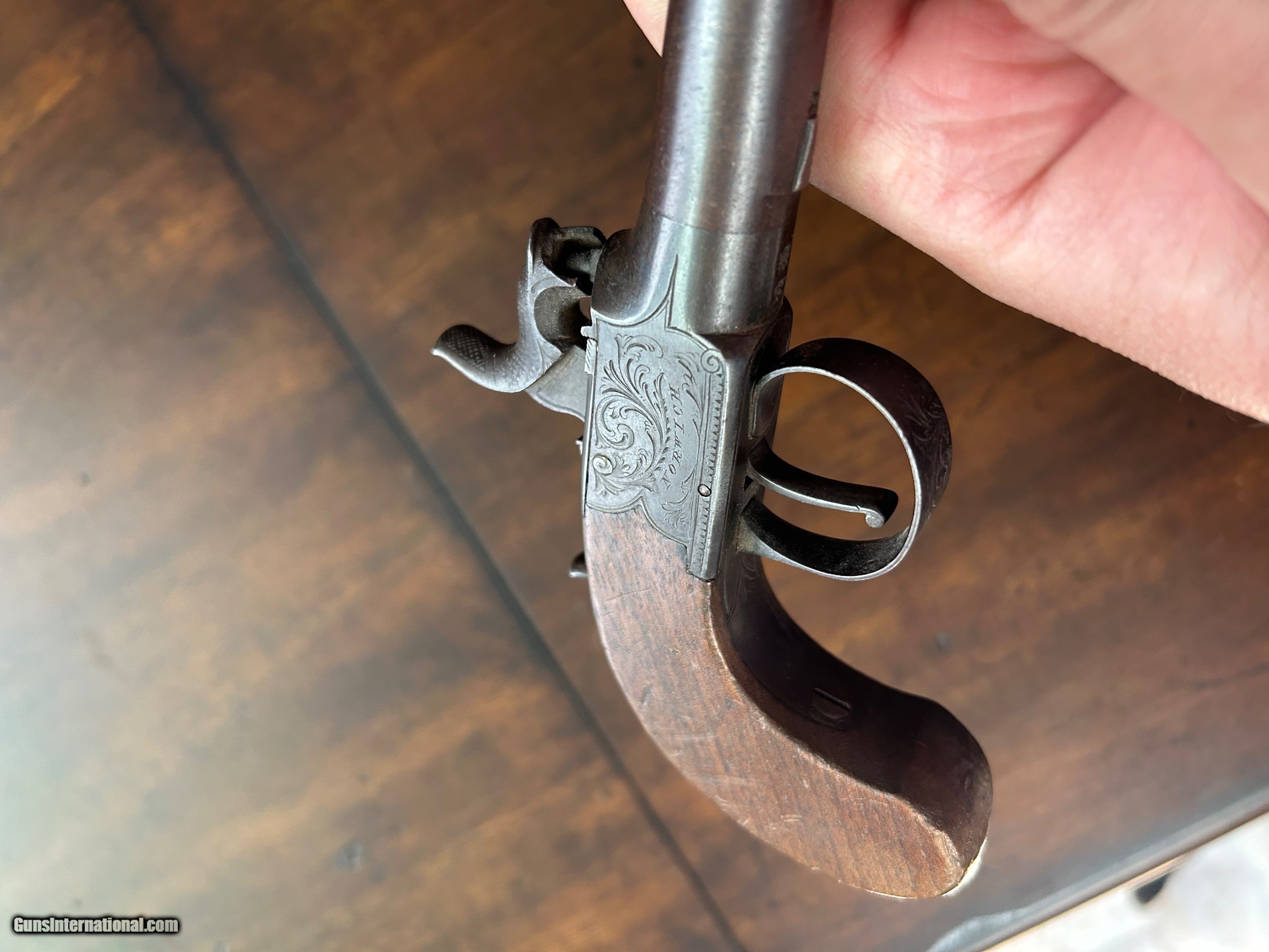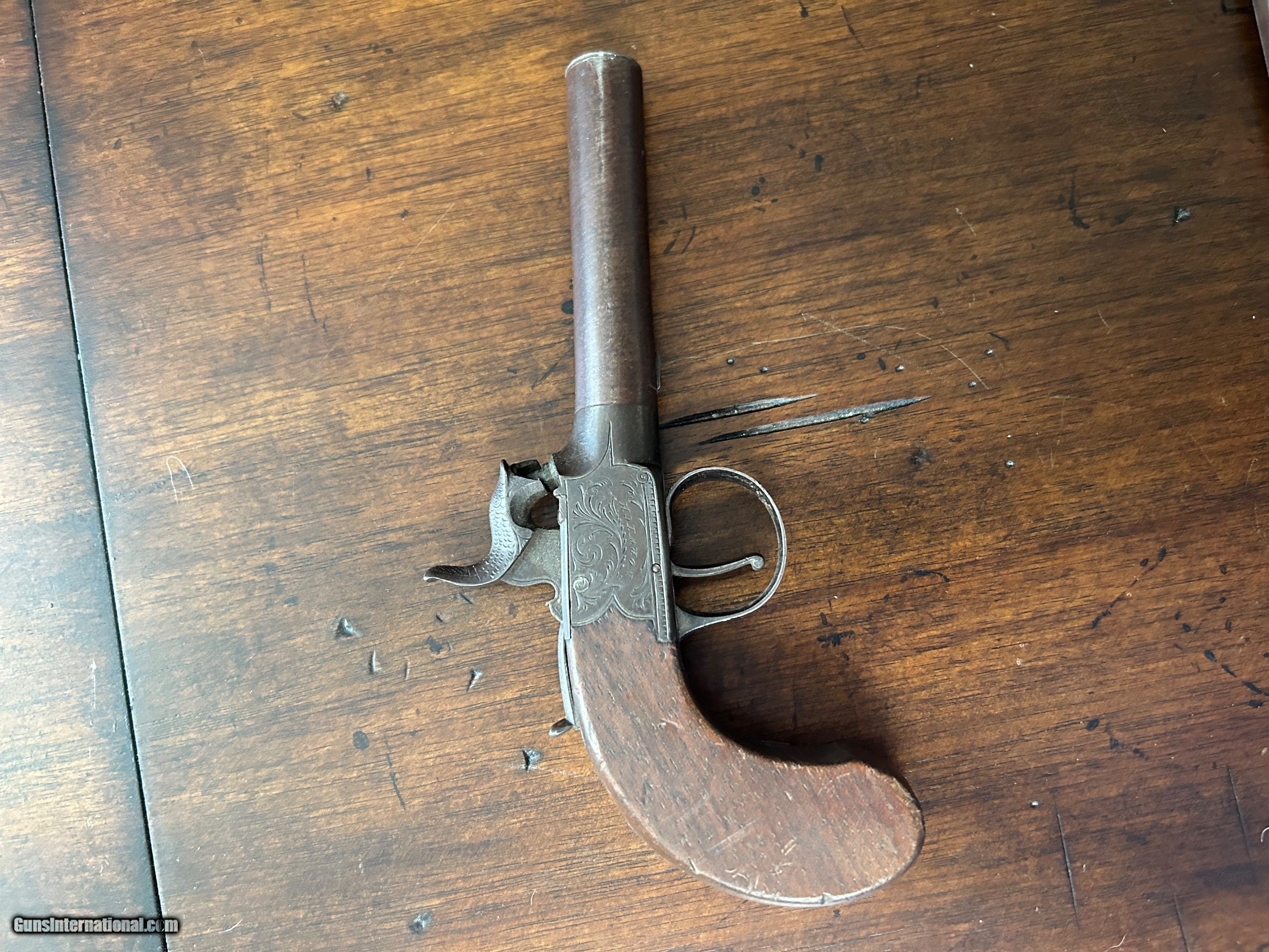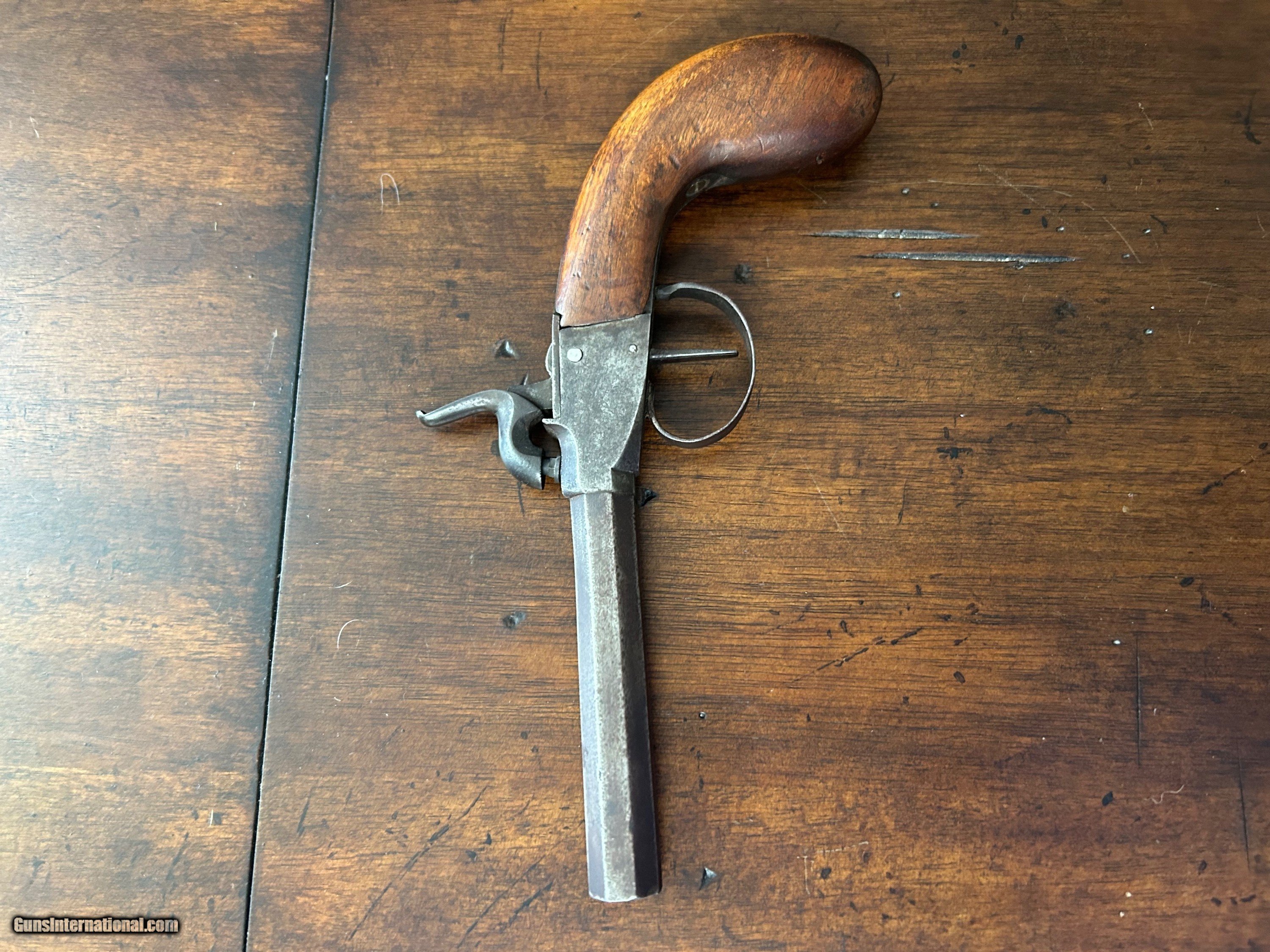 Description: Here we have two antique boot pistols for one money. Norich Dyball .45 caliber. Nice shape. Functions well. Nice damacas barrel with good bore. .41 caliber unmarked maker. Functions well. Bore looks usable. Selling as a pair. FREE SHIPPING where permitted. Can ship antique Pre-1898 to the door if permitted in your area. SOLD Antique: Yes Manufacturer: Norich English Derringer Boot Antique |