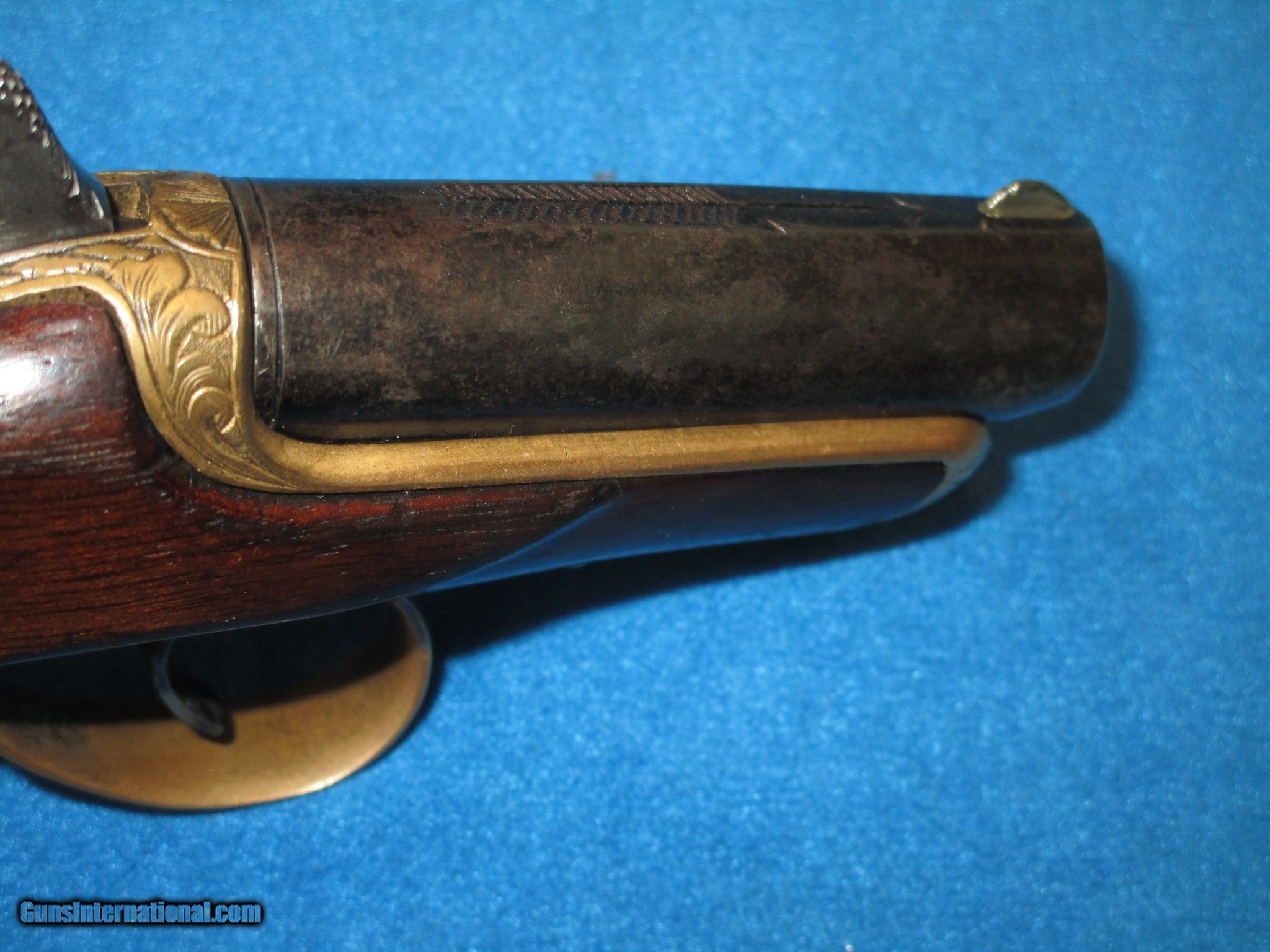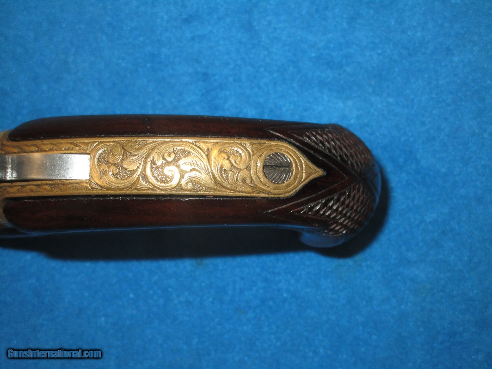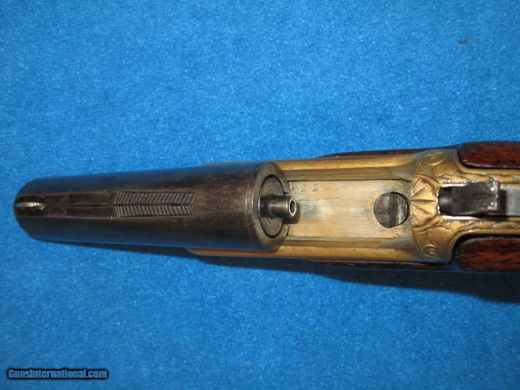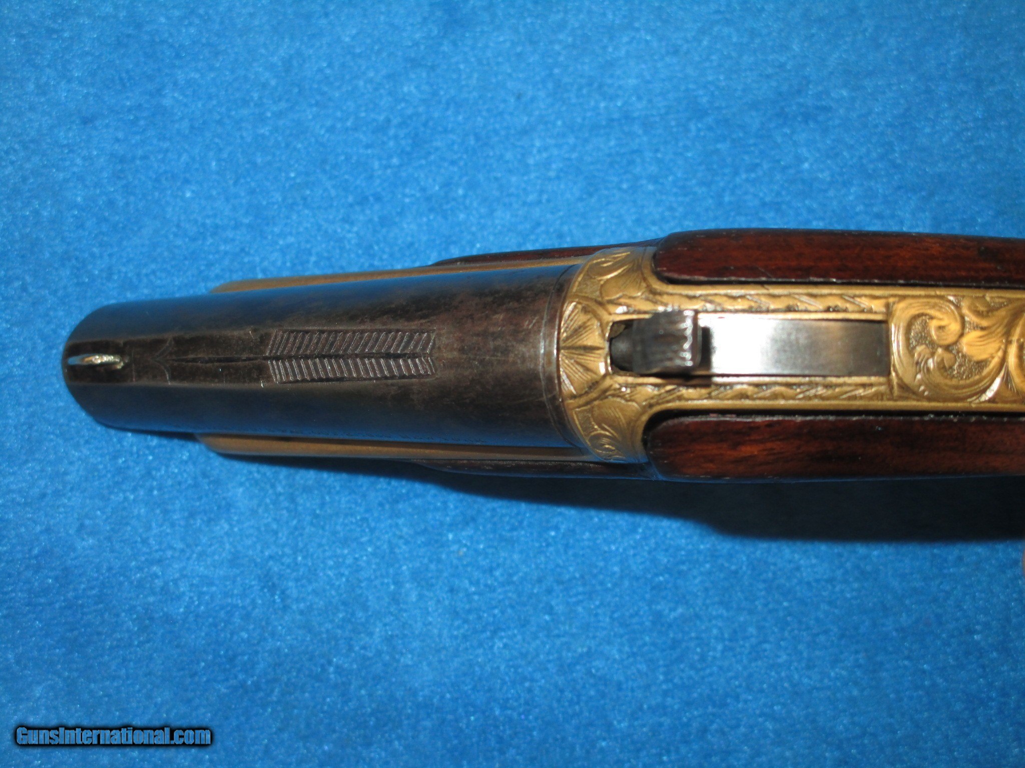 Description: A SCARCE FACTORY ENGRAVED WILLIAMSON SINGLE SHOT DERINGER IN VERY NICE UNTOUCHED CONDITION. SERIAL #355, ALL ORIGINAL & COMPLETE. MADE FROM 1866-1870. .41 CALIBER RIMFIRE & COMPLETE WITH PERCUSSION INSERT SO IT COULD HAVE BEEN SHOT TWO WAYS. VERY NICE METAL & MARKINGS. THE BARREL IS MARKED WITH THE WILLIAMSON PATENT ON THE SIDE & ENGRAVED WITH A LARGE ARROW ON TOP. THE ENTIRE BRASS FRAME, BACKSTRAP & TRIGGER GUARD ARE FACTORY ENGRAVED WITH A WONDERFUL COLOR TO THEM. THE BARREL HAS A MIX OF NATURAL PATINA & ORIGINAL BLUE ON IT. THE CHECKERED WOOD IS FINE THROUGHOUT WITH "NO CRACKS IN IT". ALMOST ALL OF THESE DERRINGERS HAD CRACKED WOOD ON THEM. THE ACTION & BORE IN THE GUN ARE BOTH FINE. THIS IS A FINE LOOKING EXAMPLE OF A WILLIAMSON DERRINGER WITH MANY EXTRA FEATURES ON IT! SOLD Antique: Yes Manufacturer: WILLIAMSON Model: DERRINGER Caliber Info: .41 Condition: VERY GOOD + |