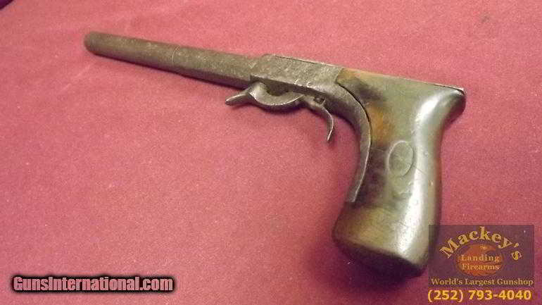 Description: Fair to good condtion with pitting throughout. Bore has rifling and some rust. Faint stamping on the top strap. Third octogon to round barrel, 7 total inches. Underhammer locks and the trigger will release the hammer. Handsaw grip has a crack in the middle and is missing the escutcheons on both sides and a little loose. No serial number. Dated approximately 1836. No FFL dealer required for shipment. We do not ship outside the United States. SOLD Curio/Relic: Yes Antique: Yes |