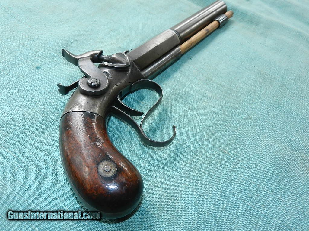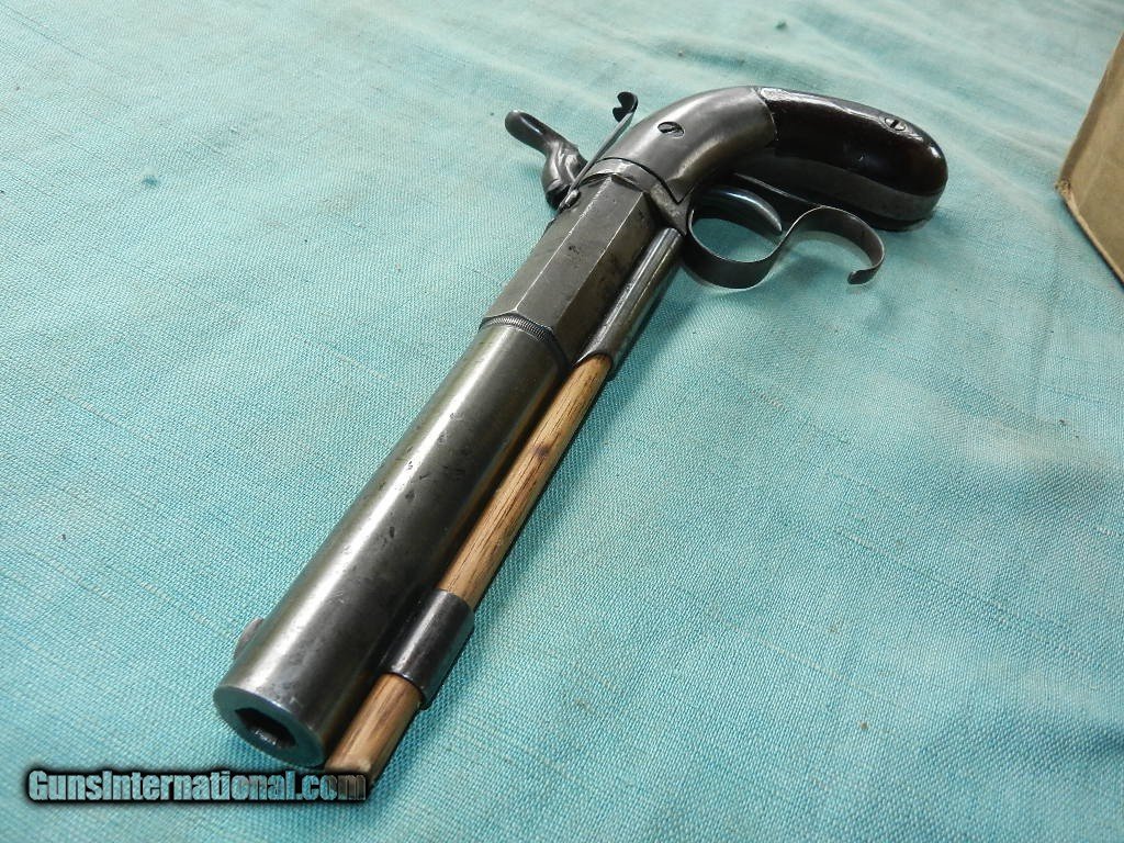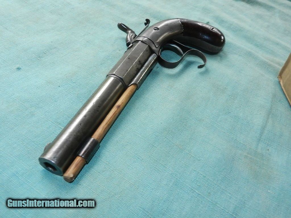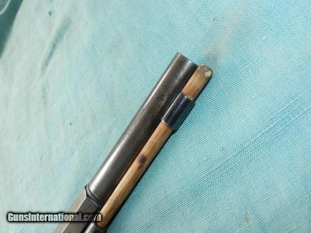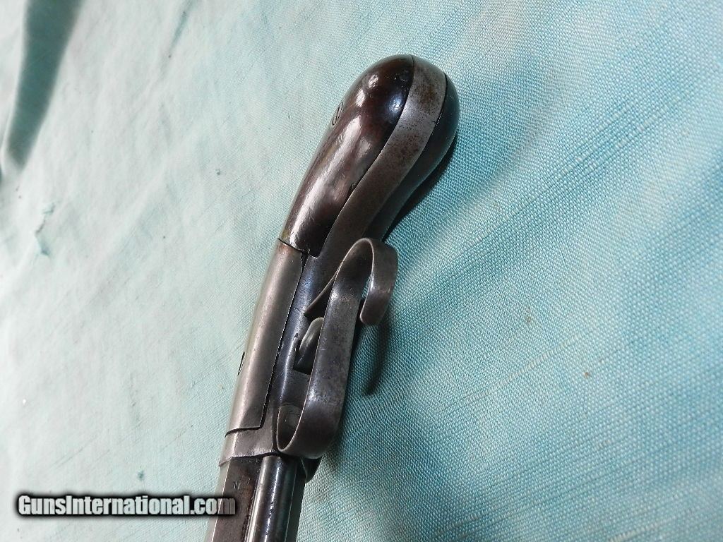 Description: SOLD A really nice , complete working well single shot percussion target pistol made in the 1850's by Allen Thurber with no markings , so it may have been made for a retail vendor or psiibly end of production. Hammer works well, and is off set for use of the rear sight. The American walnut grips are very clean and fit well , with strong finish remaining. Only markng is N7 under the barrel, and comes with an oak plain ram-rod. The 6 1/2" part round/octagonal barrel has a very clean rifled bore.When buying a gun always have it examined by a competent gunsmith before shooting. To buy a gun from me you must get a direct email for me, with details, and shipping cost. We don’t have a web site .I prefer money orders or a check. Item ships when funds come in. I try to keep guns affordable, which means I make less money than most dealers. You won’t get altitude sickness, or nose bleed, with my prices! I consistently have the best selection of older guns If you attempt to buy, you must still contact us for details . Best to email to buy. Sometimes a local person can stop buy and purchase before the gun is removed. Sometimes not home to get calls. Some guns are required shipment to a gun dealer near you for a transfer to you when it arrives. Otherwise many older or black powder guns ship to your door. With the widest selection of older guns at great prices, We don’t have a store, and sell on the internet only. I’m easy to get along with. Thank You. SOLD Antique: Yes |