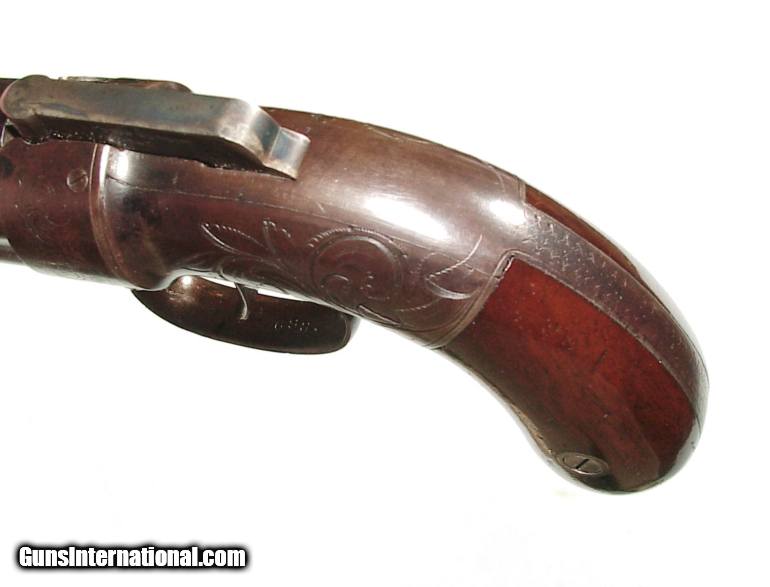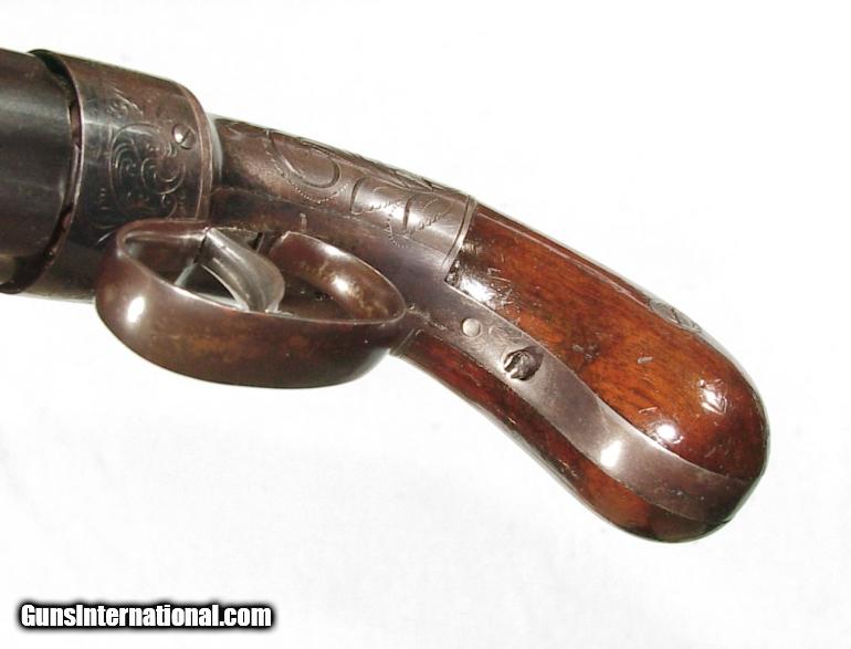Description: .31 caliber, four inch fluted barrel marked "ALLEN & THURBER / WORCESTER". Bar hammer, double action with walnut bag grips. In superb original condition with the barrel retaining all of the blue, the bar-hammer showing all of it's bright case colors. The engraved iron frame with much of the blue remaining. Excellent grips and varnish. Mechanically excellent. SOLD Antique: Yes |