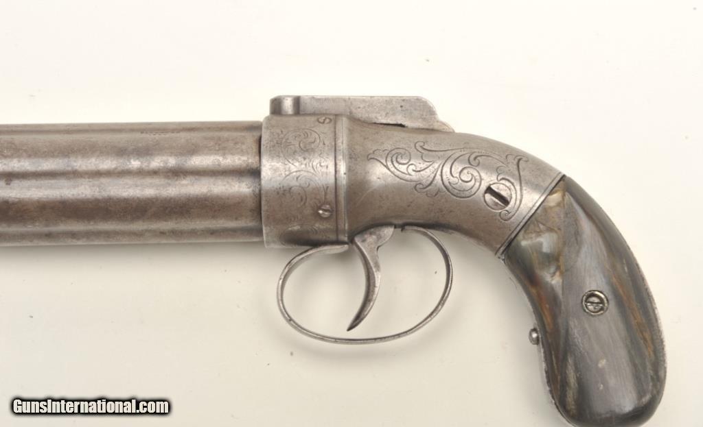 Description: pistol with engraved nipple shield and horn grips, .32 caliber, 3.25” barrels, grey patina to metal surfaces; in overall good condition with a good action, even patina and what appear to be old replacement horn grips SOLD Antique: Yes |