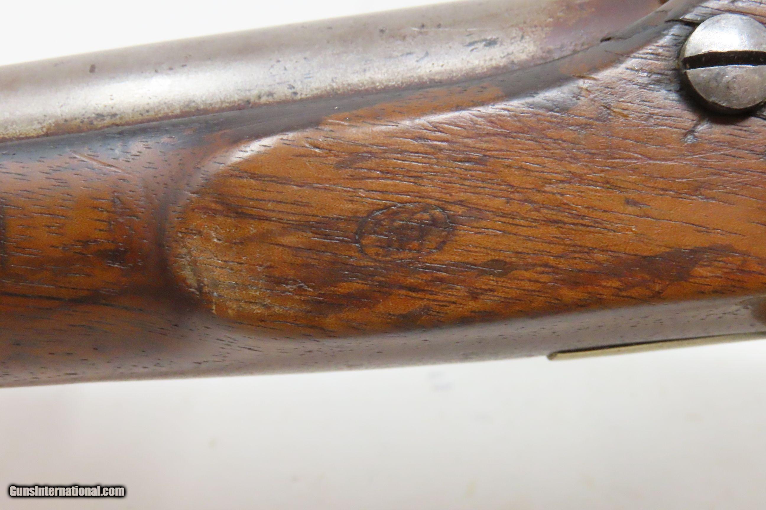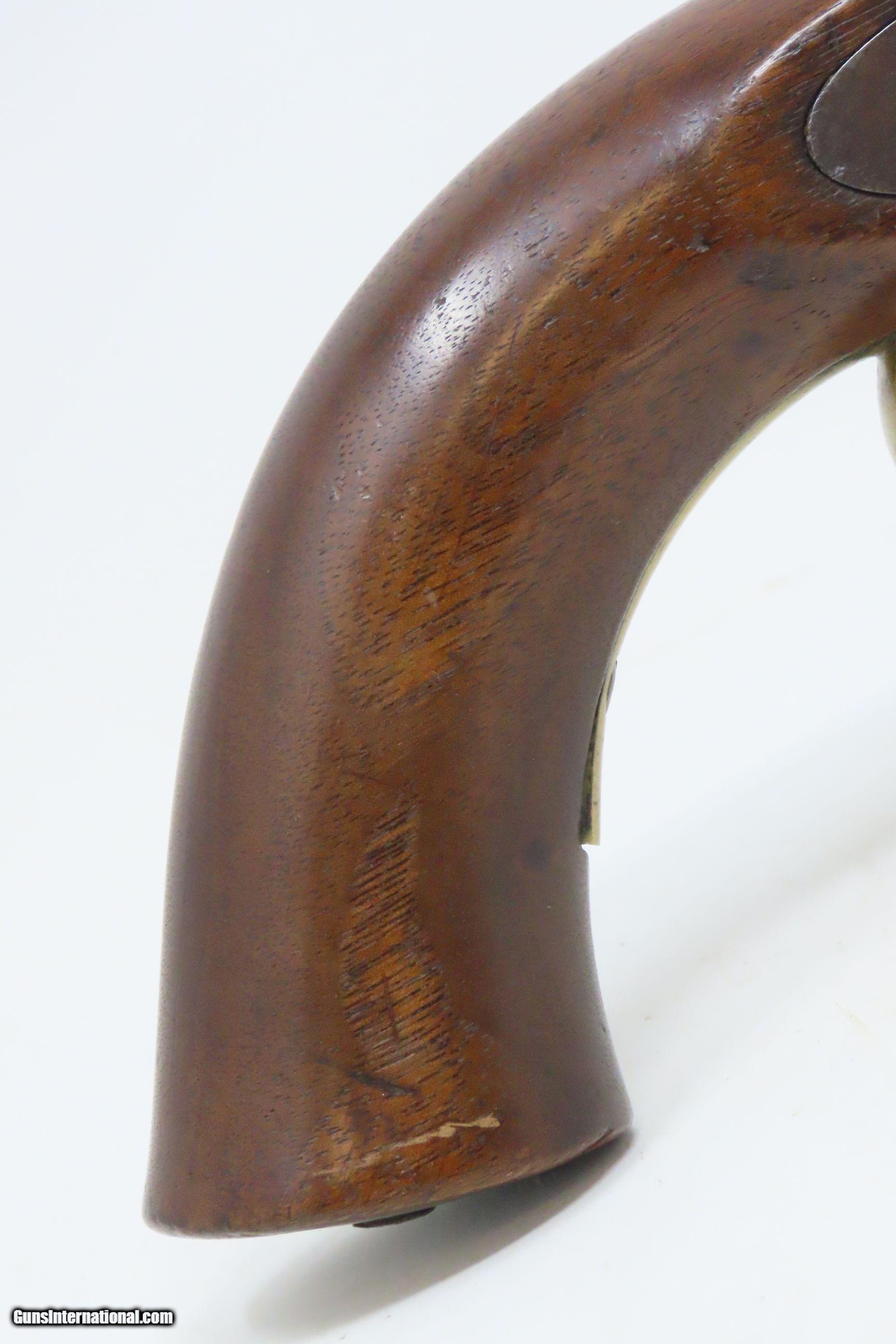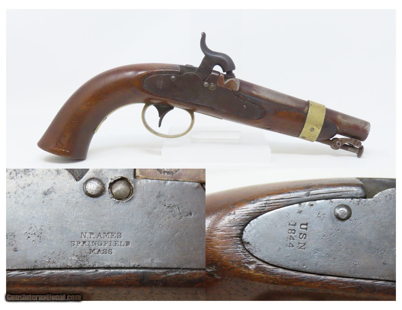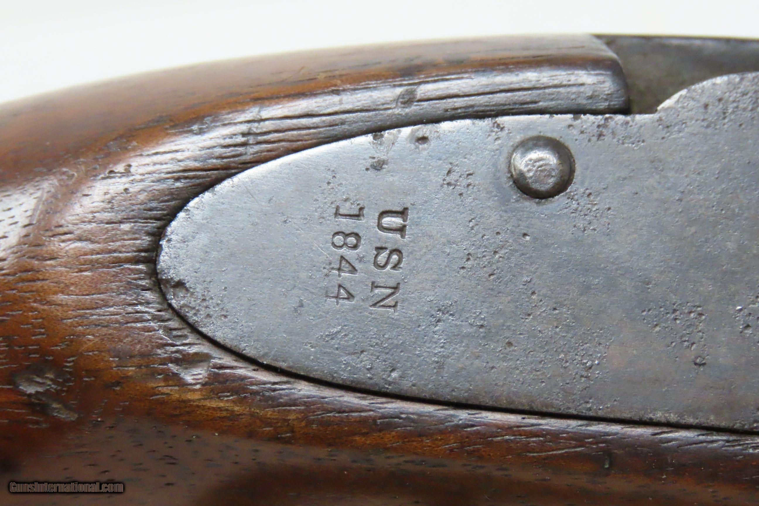 Description: AMES NAVY CONTRACT Model 1842 Pistol USN MARTIAL SPRINGFIELD MASS Antique 1 of only 2,000; MEXICAN-AMERICAN WAR Here we present an antique N.P. Ames U.S. Navy Contract Model 1842 “Box Lock” Pistol, in .58 caliber, made circa 1844 in Springfield, Massachusetts. Only 2000 of these were made by Ames between 1842 and 1847. Most of these scarce pistols saw service through the American Civil War. This one was made just prior to the Mexican-American War and undoubtably was used in that conflict. Unlike most martial pistols of its time, the hammer is mounted on the interior of the lock plate. It also features a captive ramrod on a swivel to avoid loss in the sea during boarding maneuvers. Its smoothbore made loading straightforward. The Model 1842 saw service during a time of great change and increasing tension, as well as firearms innovation. The Mexican-American War (1846-1848), the numerous conflicts with Native Americans, annexing of new territory, the rising blood-pressure over slavery, and a quick 36% population increase that all culminated in the blood-letting of the American Civil War. This was the first official percussion pistol to be adopted by the U.S. and simultaneously the last large smooth bore single shot pistol. By 1845 it was the primary issued weapon to the First and Second Regiment of Dragoons, replacing many of their Model 1836 flintlocks, just in time for the Mexican-American War. The Model 1842 was the last single shot smoothbore pistol issued by the U.S. Army. This example is “USN/1844” marked and martially inspected “RP” by Civilian Sub-Ordnance Inspector Ricnard Payne, with multiple single letter inspection marks. There is also an “LS” cartouche on the left stock flat for Sub-Ordnance Inspector Luther Sage. The overall condition is good. Original brown finish and patina. The action is excellent. The bore is smooth and patinated. The stock is solid and shows use; there are two cartouches on the left stock flat. Own the original! This is a legitimate antique and not a reproduction. Barrel is 6 inches. Caliber: .54 Percussion Overall condition as seen in photos. Very Fast. Very Safe. FREE SHIPPING WORLDWIDE. Delivered directly to your door by express mail! Guaranteed AUTHENTIC & Includes CERTIFICATE OF AUTHENTICITY. ancestryguns $1800 #230621 SOLD Antique: Yes |
