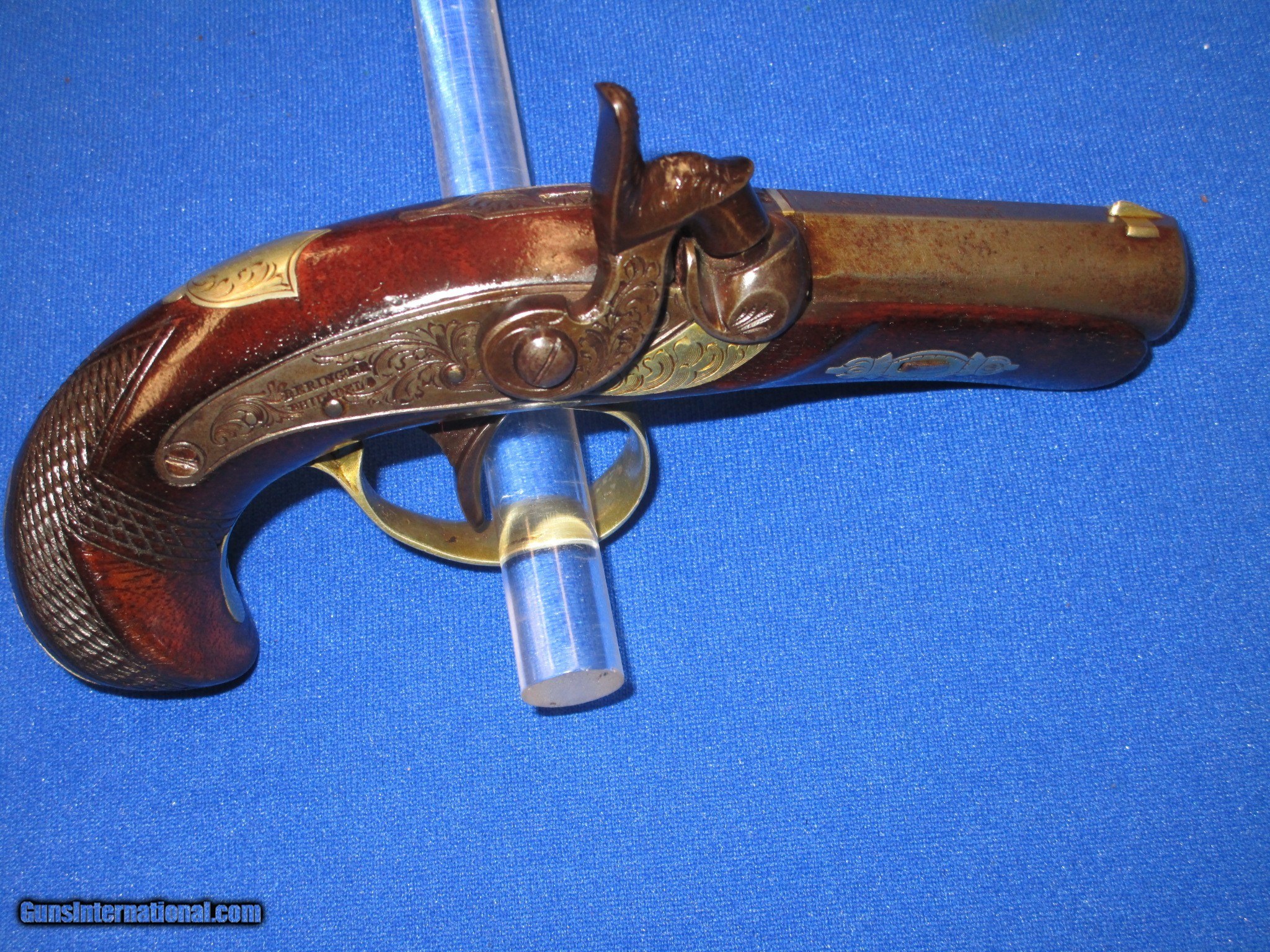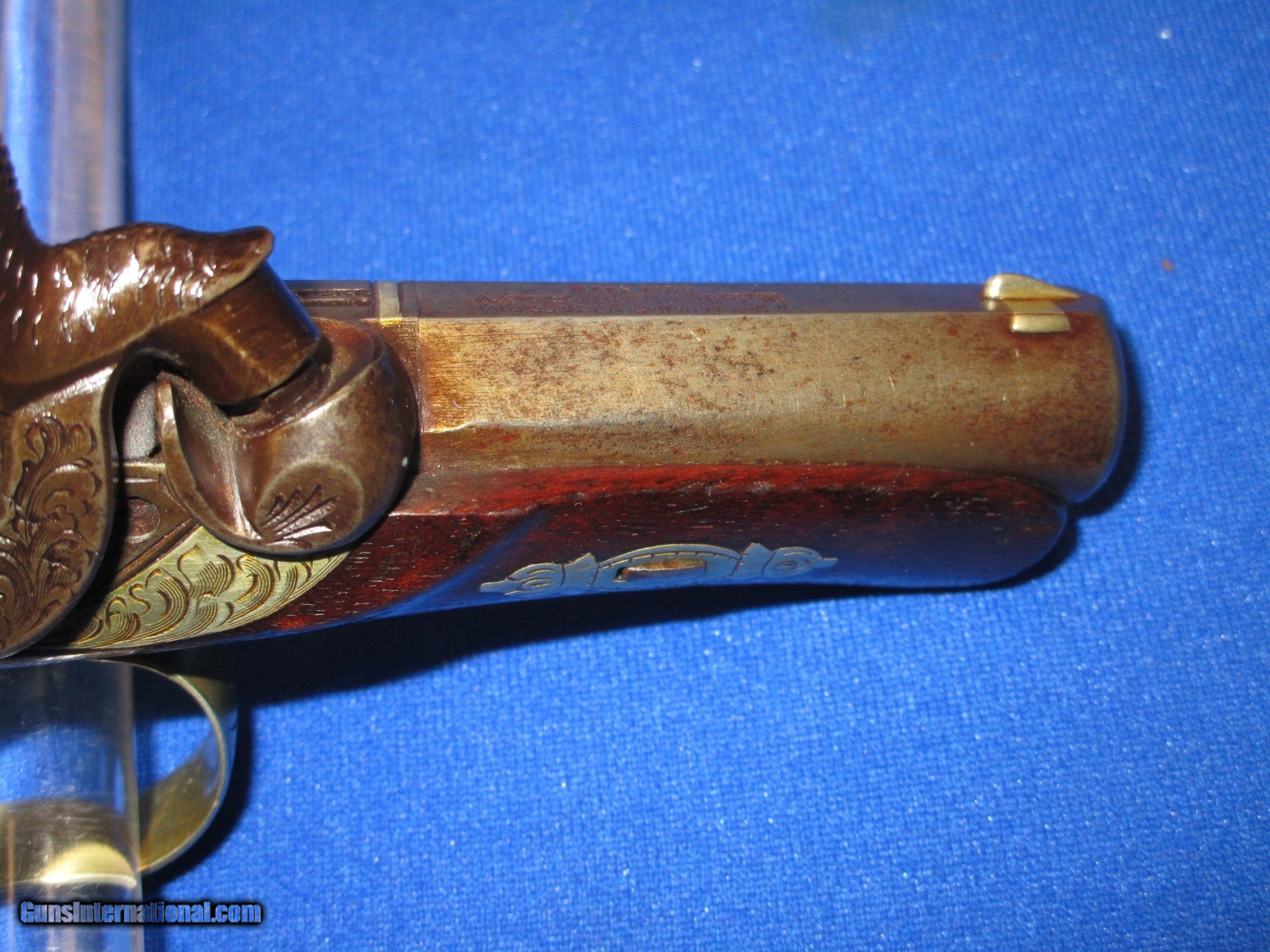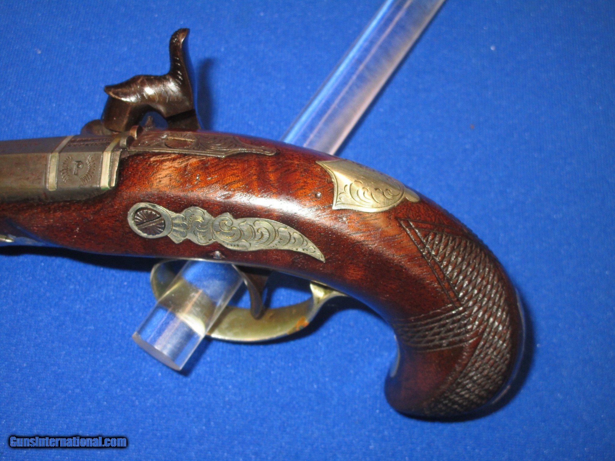 Description: AN EARLY & VERY RARE MOST LIKELY CONFEDERATE USED CIVIL WAR "MILLSPAUGH, WASHINGTON LOUISIANA" SOUTHERN AGENT MARKED TRUE HENRY PHILADELPHIA DERINGER IN NICE UNTOUCHED CONDITION. ALL ORIGINAL & COMPLETE. THE DERINGER HAS FINE METAL, MARKINGS, AND ENGRAVING. IT IS MARKED "DERINGER/ILDELA" ON BOTH THE LOCK & THE BARREL. THE TOP OF THE BARREL IS MARKED, "MADE FOR A. MILLSPAUGH/WASHINGTON, LA". THIS MARKING WAS DOUBLE STAMPED AT THE TIME IT WAS PRODUCED AND IS GUARANTEED TO BE ORIGINAL. THE BARREL ON THE DERINGER IS DOUBLE SILVER BANDED & HAS A NICE NATURAL PATINA ON IT. THE GUN MEASURES 5 3/4 INCHES IN LENGTH OVERALL AND HAS A 2 1/4 INCH BARREL ON IT. THE LOCK, HAMMER, & BOLSTER ARE ALL FULLY ENGRAVED AND HAVE A NICE EVEN BROWN PATINA ON THEM' ALL OF THE SILVER FITTINGS & HARDWARE ARE ALSO ENGRAVED AND ARE IN EXCELLENT CONDITION. THE WOOD IS FINE PLUS THROUGHOUT WITH EXCELLENT CHECKERING ON IT. THERE IS A PERCUSSION CAP HOLDER IN THE BUTT OF THE GUN. IT HAS A FINE ACTION AND BORE. THIS IS A VERY NICE UNTOUCHED EXAMPLE OF A VERY RARE "MILLSPAUGH, WASHINGTON LOUISIANA" AGENT MARKED HENRY TRUE PHILADELPHIA PERCUSSION DERINGER! SOLD Antique: Yes Manufacturer: HENRY DERINGER Model: MILLSPAUGH, AGENT Caliber Info: .41 Condition: NICE & UNTOUCHED Metal Condition: NICE Wood Condition: FINE Bore Condition: VERY GOOD |