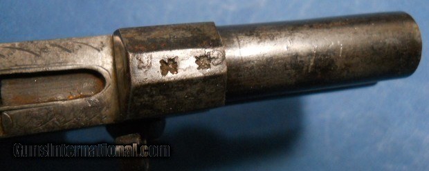 Description: ANTIQUE 1840s-1850s ERA UNMARKED DOUBLE BARREL FOLDING TRIGGER .36 CALIBER POCKET PISTOL WITH BIRMINGHAM PROOF MARKS. 6 1/4" OVERALL, 2" BARREL WITH A LEVER TO CHOOSE ONE YOU WANT TO FIRE. THE METAL SURFACES ARE ORIGINAL FINISH WITH FINE ENGRAVING ON FRAME, HAMMER & SMALL PARTS. ACTION IS CRISP, SLIDING SAFETY AND TRIGGER WORK PROPERLY. TIGER STRIPE STOCK IS IN FINE CONDITION, ORIGINAL VARNISH FINISH, SHOWING MINIMAL HANDLING or WEAR WITH GERMAN SILVER MONO PLATE. VERY INTERESTING LITTLE TAP PISTOL, AS PICTURED & FOUND. "NO FLUFF JUST FAIRLY PRICED STUFF" $15.00 S&H DIRECT TO YOU ANYWHERE THAT'S OK NO LICENSE NEEDED. SOLD Antique: Yes Handgun Caliber: .36 Manufacturer: UNKNOWN Model: OVER/UNDER Barrel Length: 2 Chambers: CLEAR Condition: FINE PLUS Metal Condition: ORIGINAL Wood Condition: AS PICTURED Bore Condition: VERY GOOD Barrels: TWO Barrel Type: ROUND Action: CRISP & TIGHT Triggers: FOLDING Stock: TIGER STRIPE WALNUT Finish: ORIGINAL Weight: 10.1 oz Manufacture Date: 1840s -1850s ERA Engraving: YES |