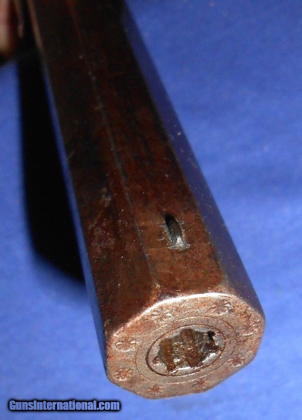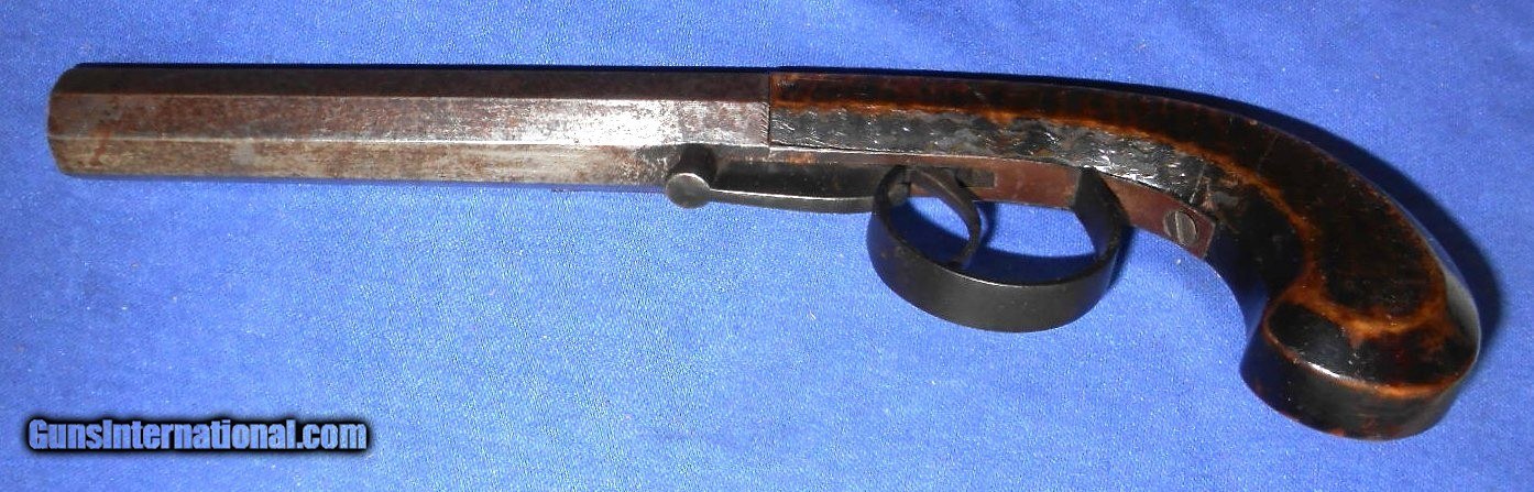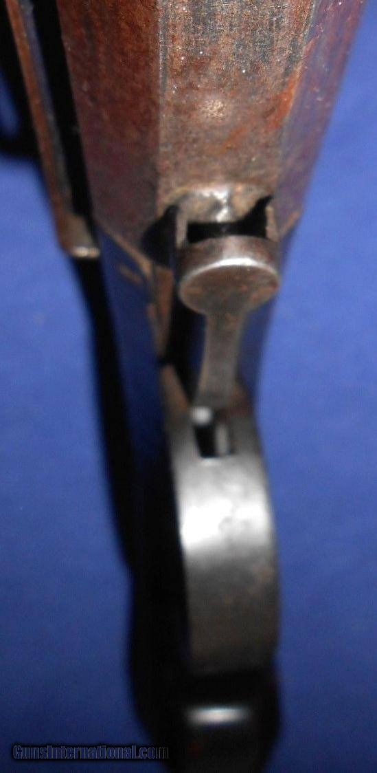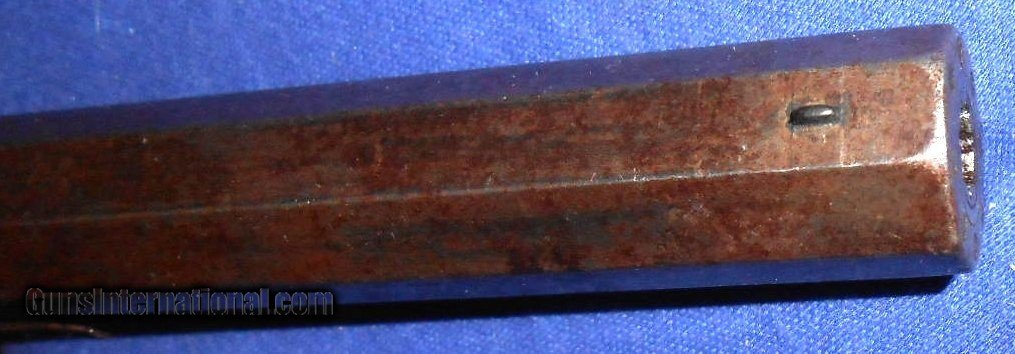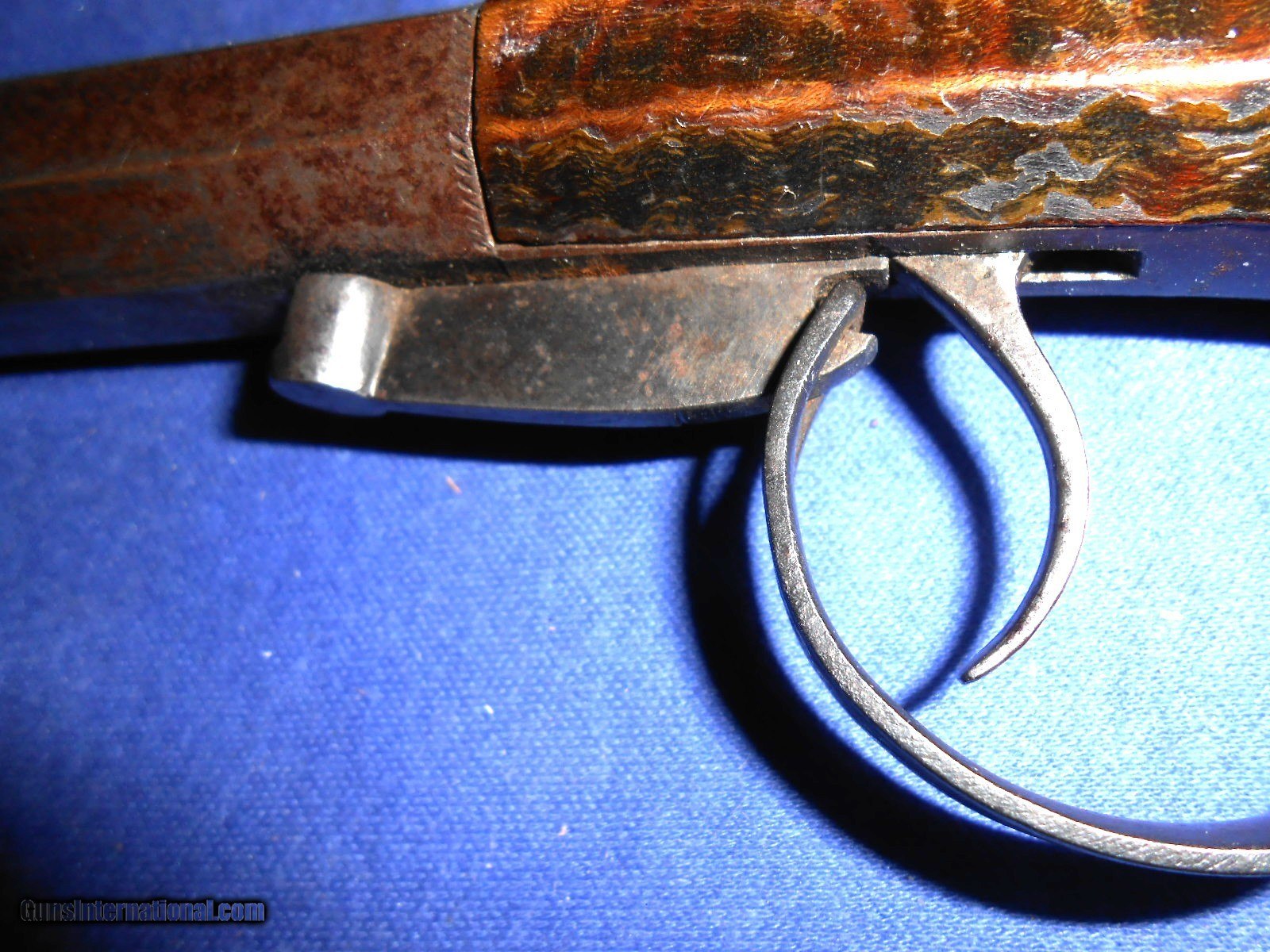 Description: VERY INTERESTING AND POSSIBLY UNIQUE UNDER HAMMER BELT or BOOT PISTOL. 10" LONG 5 3/8" OCTAGON .31 CALIBER BARREL. BORE HAS VERY STRONG RIFLING WITH OVERALL LIGHT PITTING THAT SHOULD CLEAN UP. METAL SURFACES A BROWNISH GRAY PATINA. SOLID TIGER STRIPE MAPLE STOCK IN VERY GOOD CONDITION, GERMAN SILVER MONOGRAM PLATE WITH OLD FINISH SHOWING PROPER WEAR & ONLY LIGHT HANDLING, NO CRACKS. THIS IS LIKELY AN AMERICAN MADE GUN, IT HAS NO MAKER MARKS. ACTION FUNCTIONS WITH MANUAL TRIGGER RESET. UNUSUAL BELT HOOK ON RIGHT SIDE INSTEAD OF LEFT WITH TRIGGER GUARD BEING THE MAINSPRING. THIS IS A WELL CRAFTED 1840s - 1850s ERA PISTOL, AS PICTURED & RECENTLY FOUND IN ESTATE COLLECTION. $18.00 S&H INSURED DIRECT TO BUYER ANYWHERE THAT'S OK. SOLD Antique: Yes Handgun Caliber: .31 Manufacturer: UNKNOWN Model: UNDER HAMMER Barrel Length: 5 3/8 Bore: STRONG RIFLING Chambers: CLEAR Condition: VERY GOOD Metal Condition: ORIGINAL Wood Condition: VERY GOOD Barrel Type: OCTAGON Stock: TIGER STRIPE MAPLE Weight: 1 lb 2 oz Sights: ORIGINAL Manufacture Date: 1840s -1850s ERA |
