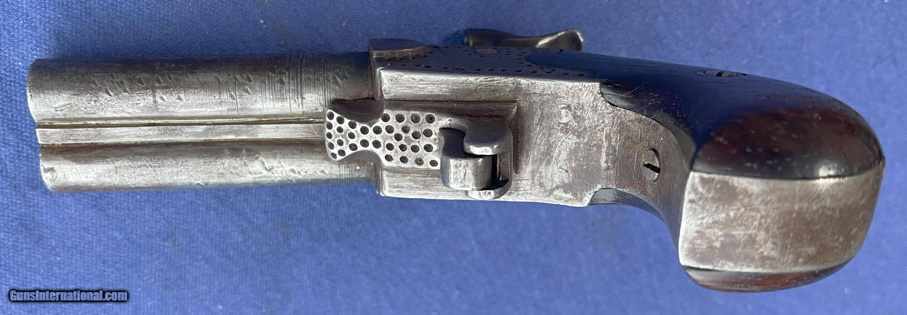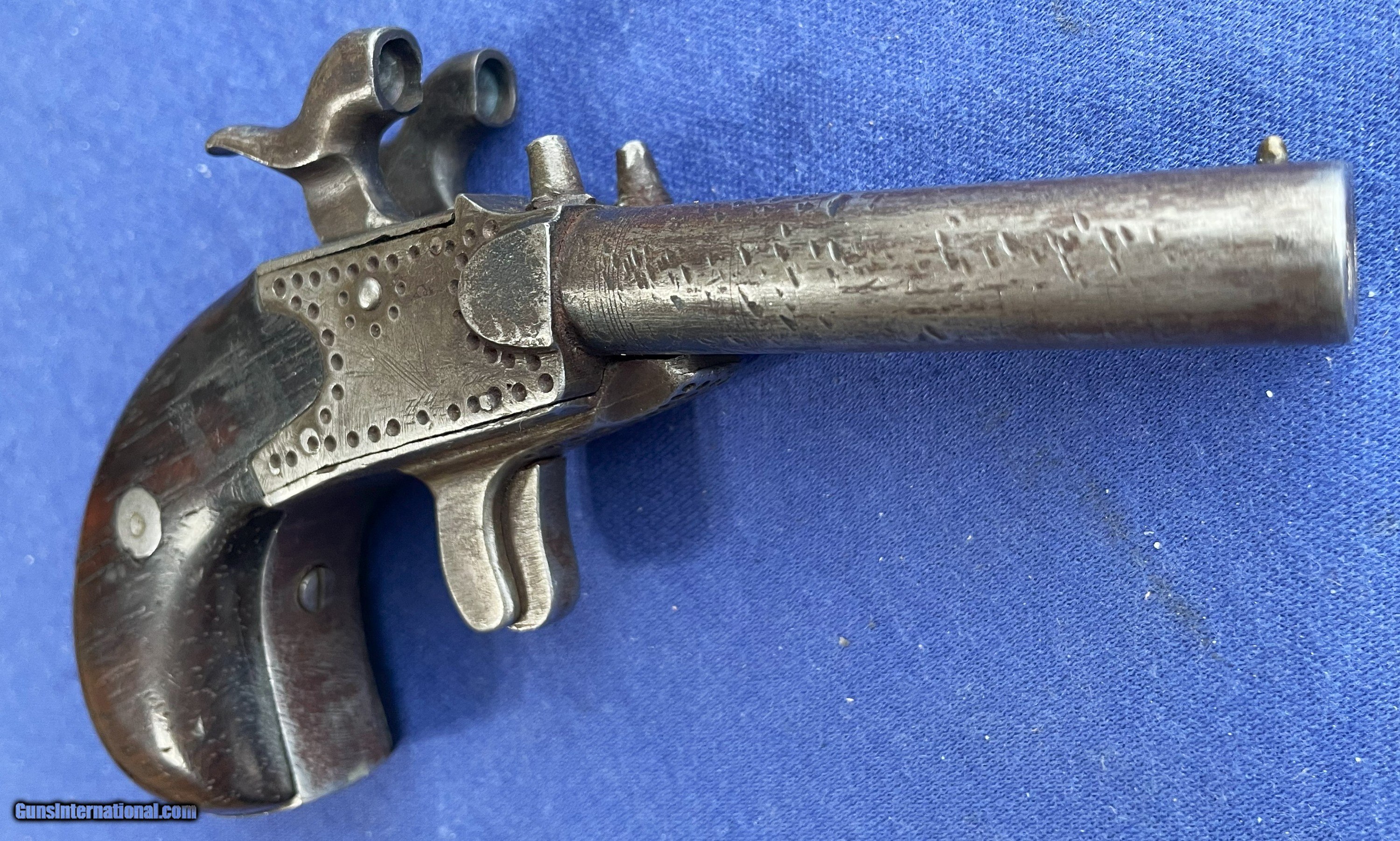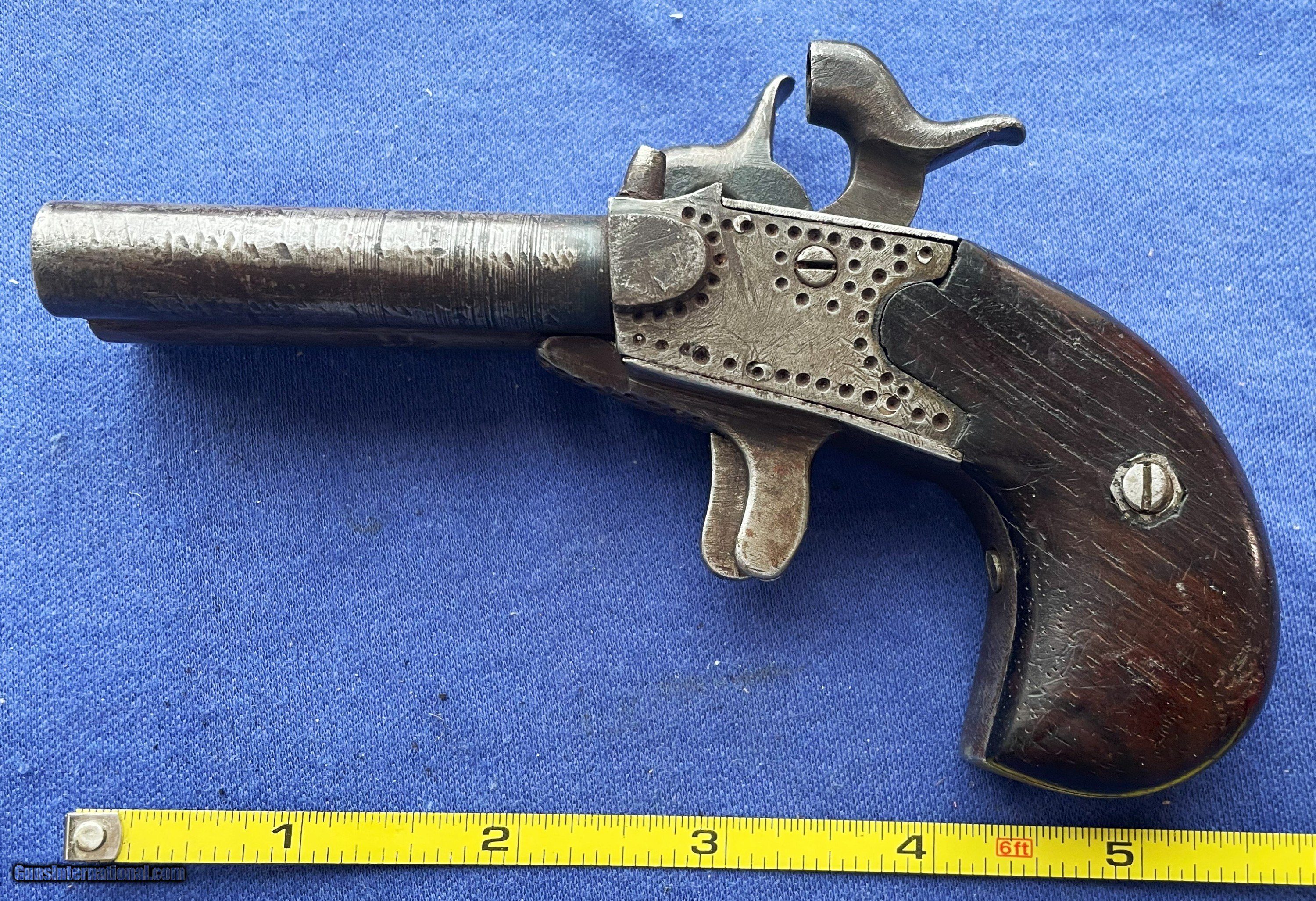 Description: MOST UNUSUAL UNMARKED DOUBLE BARREL SINGLE TRIGGER DERINGER PISTOL. ABOUT 5 1/2" LONG, 2 1/2" SMOOTHBORE .28 CALIBER BARRELS. BORES ARE FREE OF PITTING. METAL SURFACES AN AGED BROWNISH GRAYISH PATINA. ACTION WORKS GOOD FIRST TRIGGER FIRES THE RIGHT BARREL SECOND PULL THE LEFT BARREL. WALNUT GRIPS SHOW APPROPRIATE WEAR WITH RIGHT PANEL HAVING A SOLID OLD CRACK REPAIR. I'VE SEEN A LOT OF ODD FIREARMS OVER THE YEARS BUT THIS TAKES AN AWARD. SOULD BE A GREAT CONVERSATION PIECE & LIKELY OK TO SHOOT IF WANTED, AS PICTURED & FOUND. OFFERS CONSIDERED. $15.00 S&H DIRECT TO YOU NO LICENSE NEEDED. AND SOLD Antique: Yes Handgun Caliber: .28 Manufacturer: UNKNOWN Model: DOUBLE BARREL Barrel Length: 2 1/2 Bore: BRIGHT Chambers: 2 Condition: VERY GOOD Metal Condition: ORIGINAL Wood Condition: AS PICTURED Bore Condition: VERY GOOD Barrels: TWO Barrel Type: ROUND Action: WORKING Triggers: SINGLE Finish: AGED PATINA Weight: 12.5 oz Sights: BRASS BEAD & V-NOTCH Manufacture Date: MID 1800s |