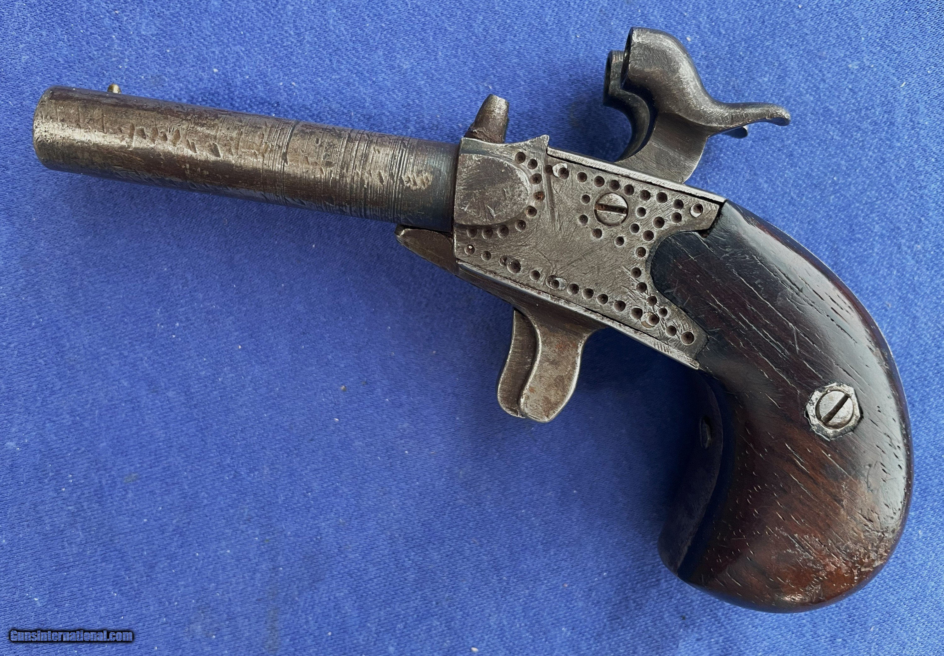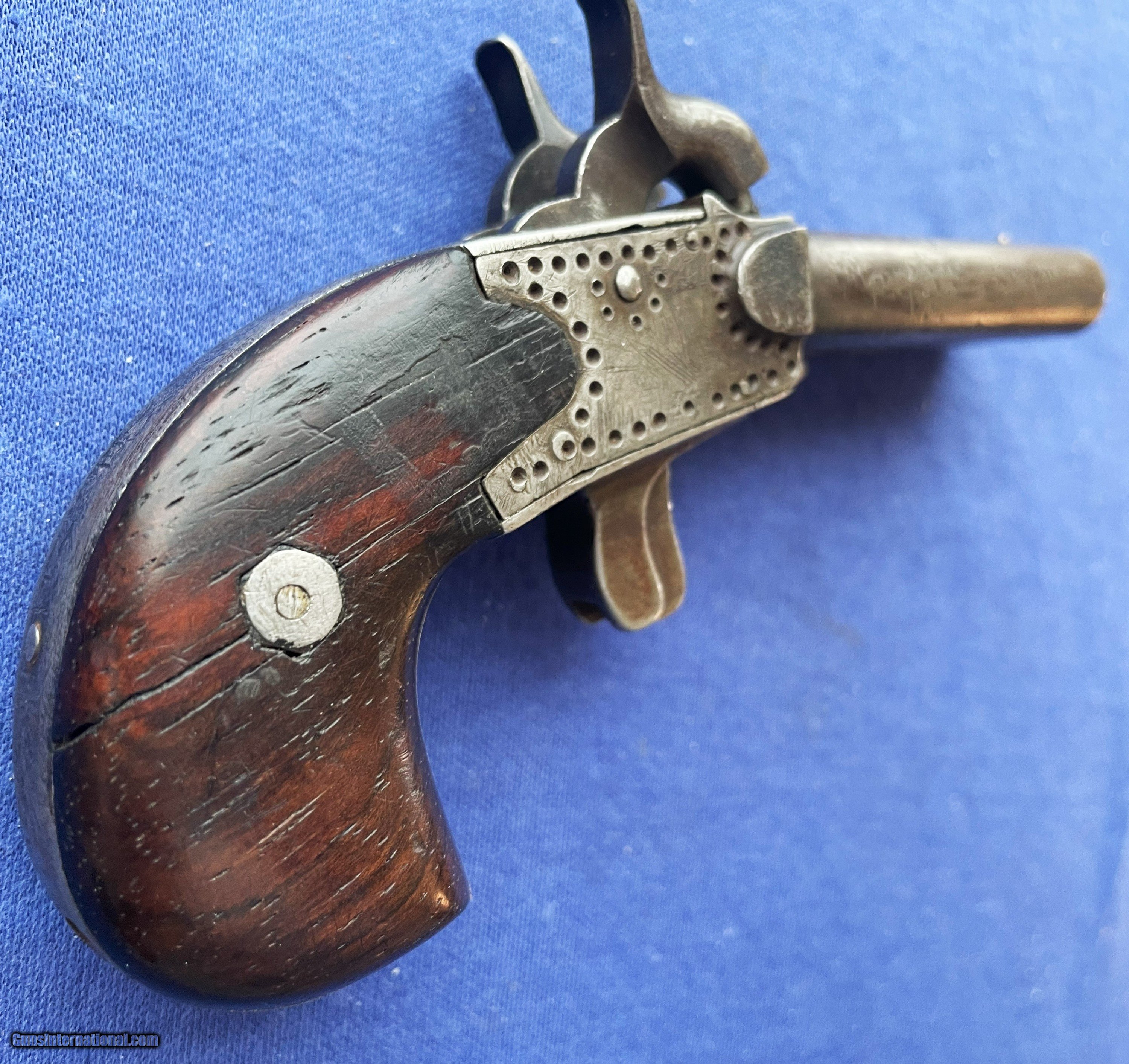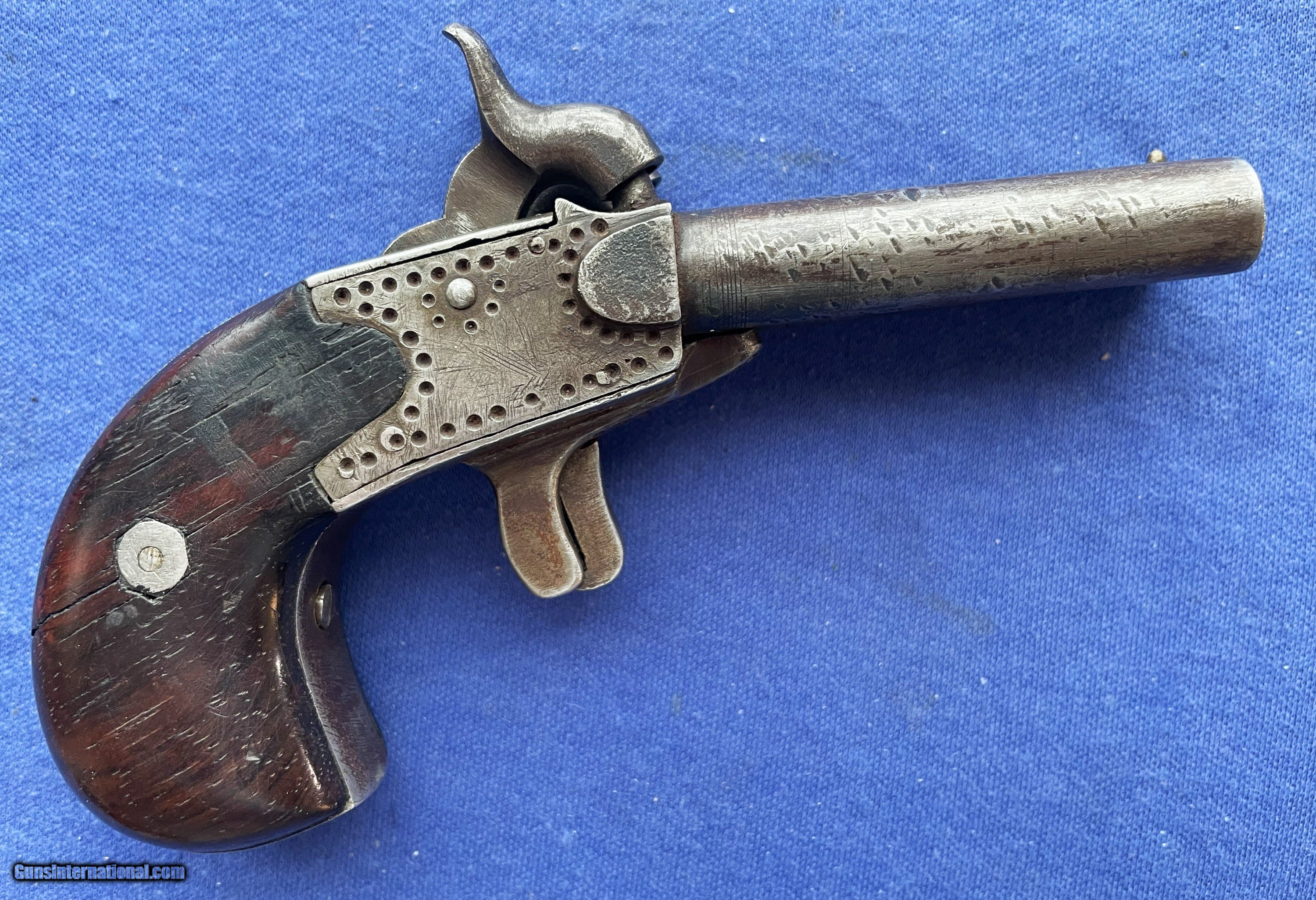 Description: MOST UNUSUAL UNMARKED DOUBLE BARREL SINGLE TRIGGER DERINGER PISTOL. ABOUT 5 1/2" LONG, 2 1/2" SMOOTHBORE .28 CALIBER BARRELS. BORES ARE FREE OF PITTING. METAL SURFACES AN AGED BROWNISH GRAYISH PATINA. ACTION WORKS GOOD FIRST TRIGGER FIRES THE RIGHT BARREL SECOND PULL THE LEFT BARREL. WALNUT GRIPS SHOW APPROPRIATE WEAR WITH RIGHT PANEL HAVING A SOLID OLD CRACK REPAIR. I'VE SEEN A LOT OF ODD FIREARMS OVER THE YEARS BUT THIS TAKES AN AWARD. SOULD BE A GREAT CONVERSATION PIECE & LIKELY OK TO SHOOT IF WANTED, AS PICTURED & FOUND. OFFERS CONSIDERED. $15.00 S&H DIRECT TO YOU NO LICENSE NEEDED. AND SOLD Antique: Yes Handgun Caliber: .28 Manufacturer: UNKNOWN Model: DOUBLE BARREL Barrel Length: 2 1/2 Bore: BRIGHT Chambers: 2 Condition: VERY GOOD Metal Condition: ORIGINAL Wood Condition: AS PICTURED Bore Condition: VERY GOOD Barrels: TWO Barrel Type: ROUND Action: WORKING Triggers: SINGLE Finish: AGED PATINA Weight: 12.5 oz Sights: BRASS BEAD & V-NOTCH Manufacture Date: MID 1800s |