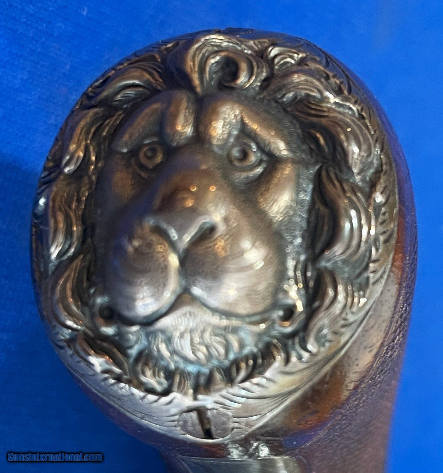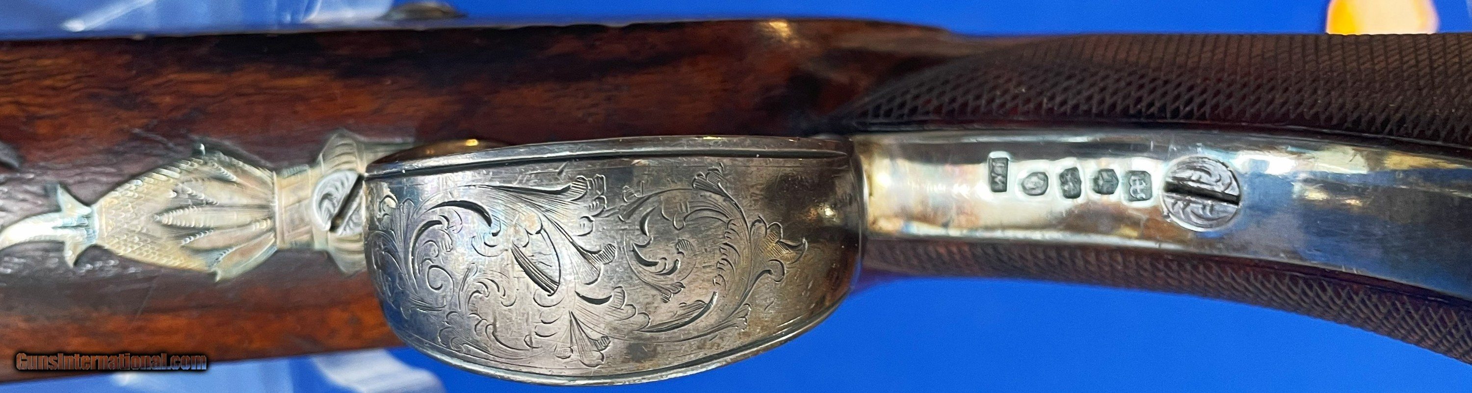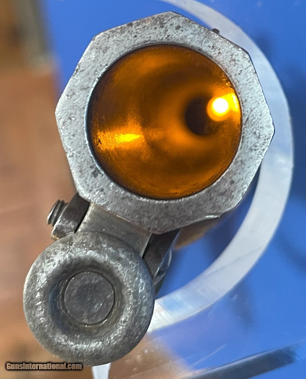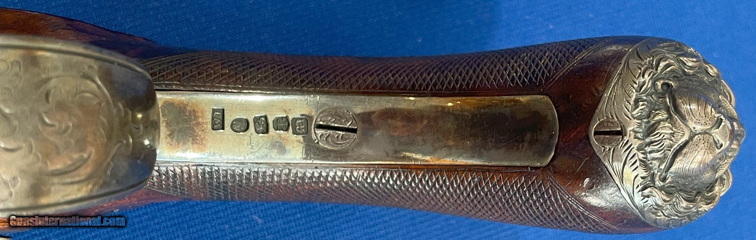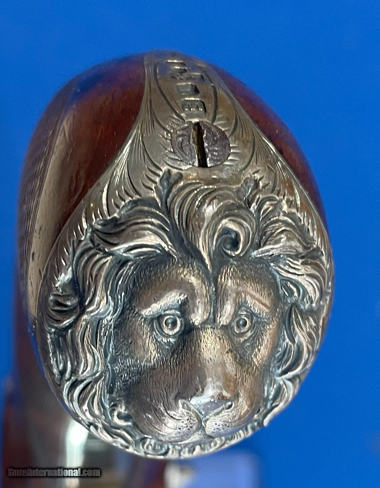 Description: 1850s -1860s HIGH QUALITY BIG BORE PERCUSSION PISTOL WITH CAPTIVE RAMROD, POSSIBLY A MILITARY OFFICERS PERSONAL GUN ? 14 1/4" LONG WITH 9" OCTAGON DAMASCUS BARREL STILL SHOWING GOOD PATTERN, BORE MEASURES .65, BRIGHT WITH SOME MINOR PITTING MIDWAY THAT SHOULD POLISH OUT. BREACH IS FINELY ENGRAVED WITH SOLID GOLD BAND AND BLOW-OUT PLUG. MONOGRAM PLATE APPEARS TO BE GOLD AS WELL. LOCK WORKS EXCELLENT, CRISP & ROBUST MARKED "SMITH" "LONDON" ALSO FINELY ENGRAVED. SOLID SILVER ENGRAVED MOUNTS WITH BIRMINGHAM HALLMARKS ON TRIGGER GUARD AND LION HEAD BUTTCAP ("WJ" - QUEENS HEAD - LION - ANCHOR & M DATE LETTER) . WALNUT STOCK RATES FINE PLUS WITH MINIMAL HANDLING MARKS. A LOVELY PISTOL OVERALL, AS PICTURED. $25.00 S&H DIRECT TO YOU INSURED FOR $100.00 ANYWHERE IN THE U.S. THAT'S OK. ADDITIONAL INSURANCE IF WANTED AT POSTAL RATES. NO SALES TO NEW YORK STATE ! SOLD Antique: Yes Manufacturer: SMITH Model: BELT PISTOL Barrel Length: 9 Bore: SMOOTH Condition: FINE PLUS Metal Condition: ORIGINAL Wood Condition: FINE PLUS Bore Condition: FINE Barrel Type: OCTAGON Action: EXCELLENT WORKING ORDER Stock: WALNUT Butt Pad: LION HEAD Finish: ORIGINAL Weight: 2 lb Sights: ORIGINAL Manufacture Date: 1850 -1860 |