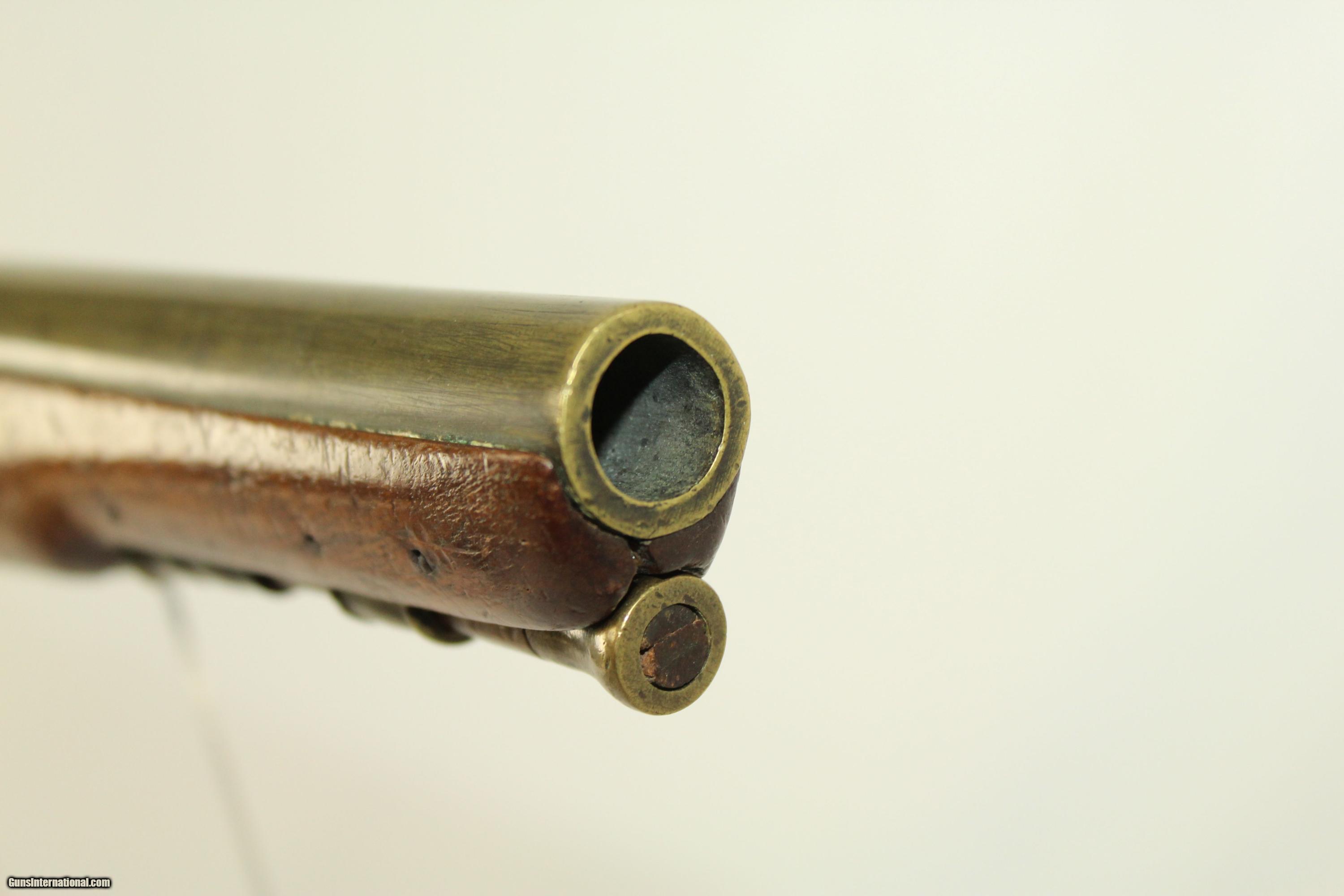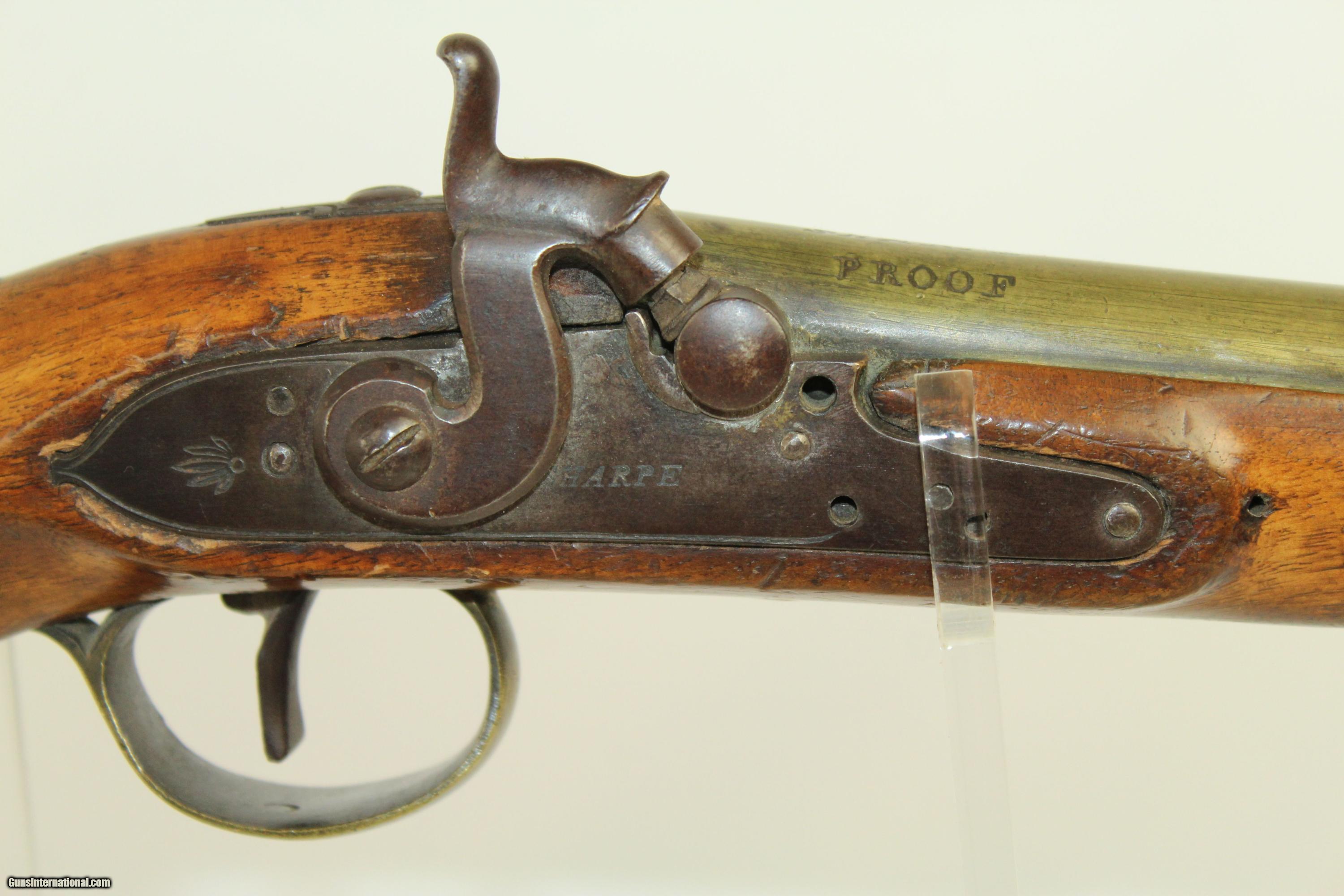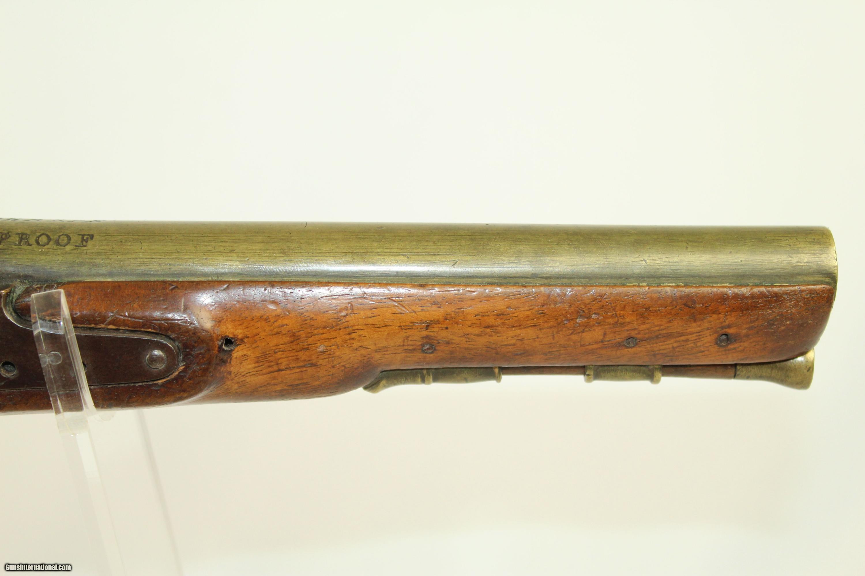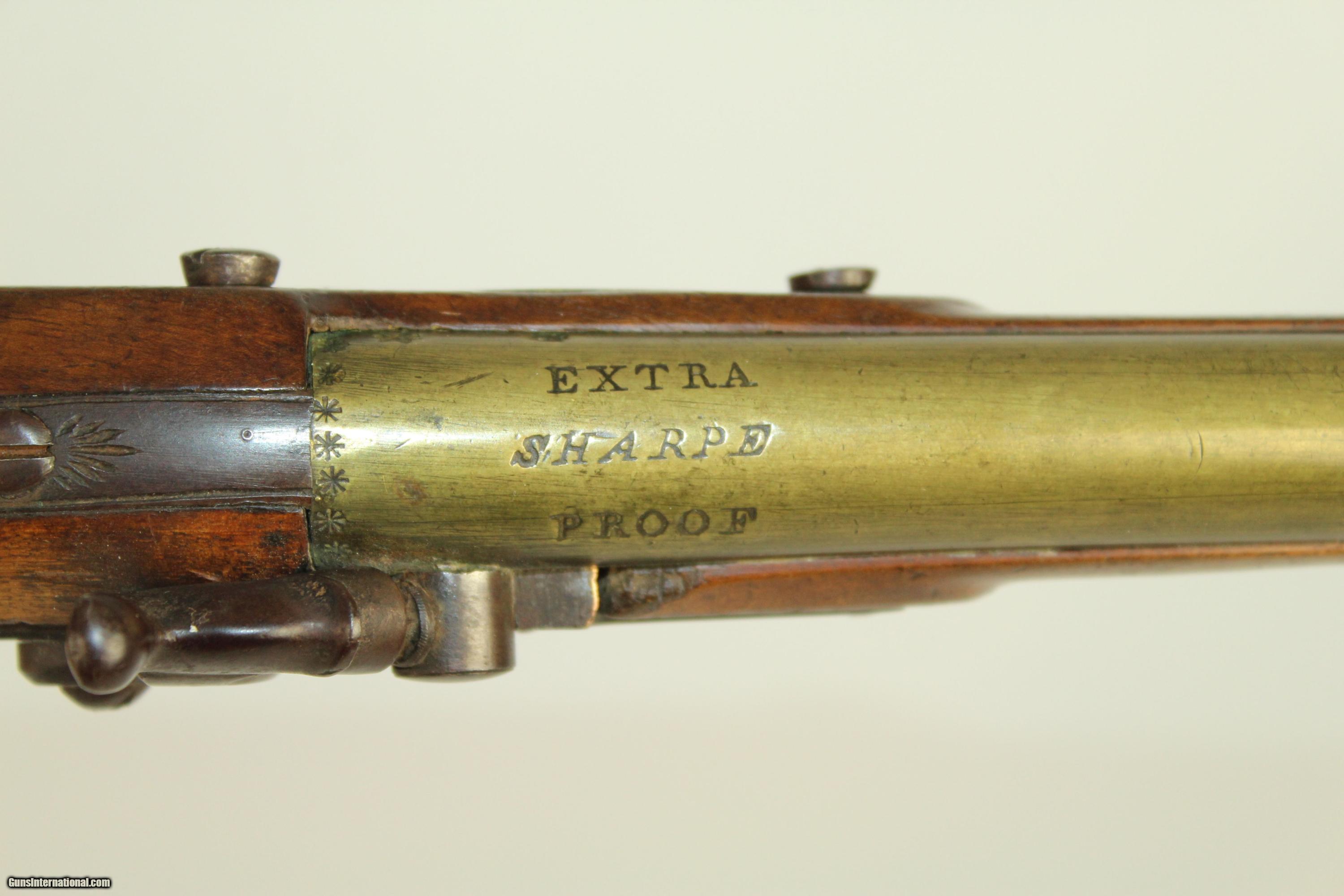 Description: Antique “EXTRA SHARPE PROOF” Converted Pistol British with Birmingham Proofs & Brass Barrel Here we present an antique Sharpe Percussion Belt Pistol, originally made as a flintlock, circa the late 1700s in England. This pistol was designed to make massive holes in things, especially in self-defense or war-time. This pistol would have been a horse carried pistol or perhaps even worn on a belt. This specimen is marked “EXTRA SHARPE PROOF” on the top of the barrel, along with Birmingham proof marks. The lock is also marked “SHARPE”. The gun features a handsome brass barrel. The lock was updated circa 1840 with the new percussion technology of the time, making it more reliable. The overall condition is very good. The brass barrel has taken a dark patina with time. The markings are deep and clear. The stock has a little chipping and a crack running from the muzzle in the ramrod channel. Otherwise it is solid and sturdy. Own the original! This is a legitimate antique and not a reproduction. Barrel is 7-3/4 inches in length. Caliber: .55 The bore is fine and the firing mechanism is strong. Overall condition as seen in photos. Here is a very interesting large bore flintlock pistol. Very Fast. Very Safe. FREE SHIPPING WORLDWIDE. Delivered directly to your door by express mail! Guaranteed AUTHENTIC & Includes CERTIFICATE OF AUTHENTICITY. ancestryguns $1350 #21909 SOLD Antique: Yes |