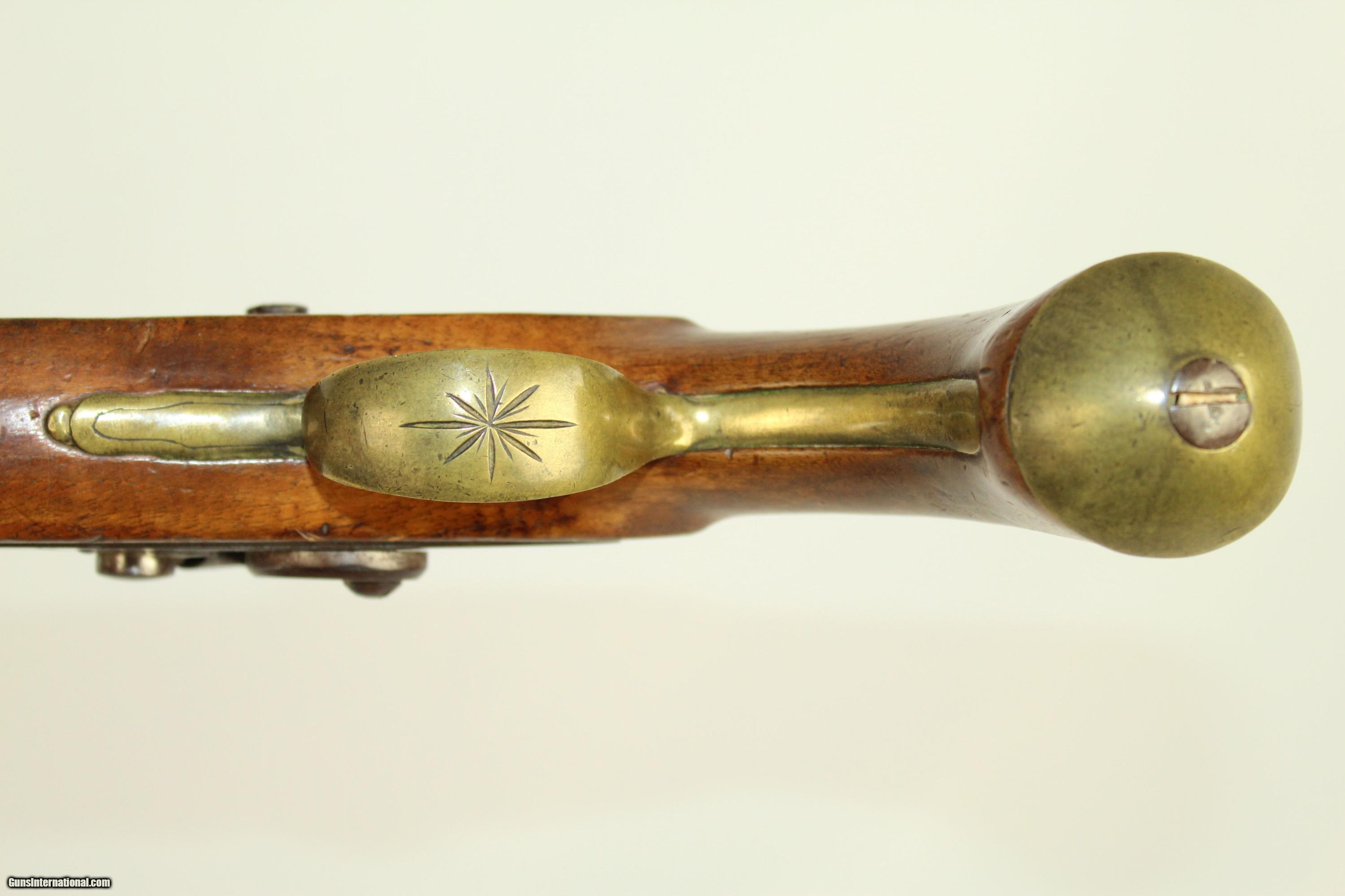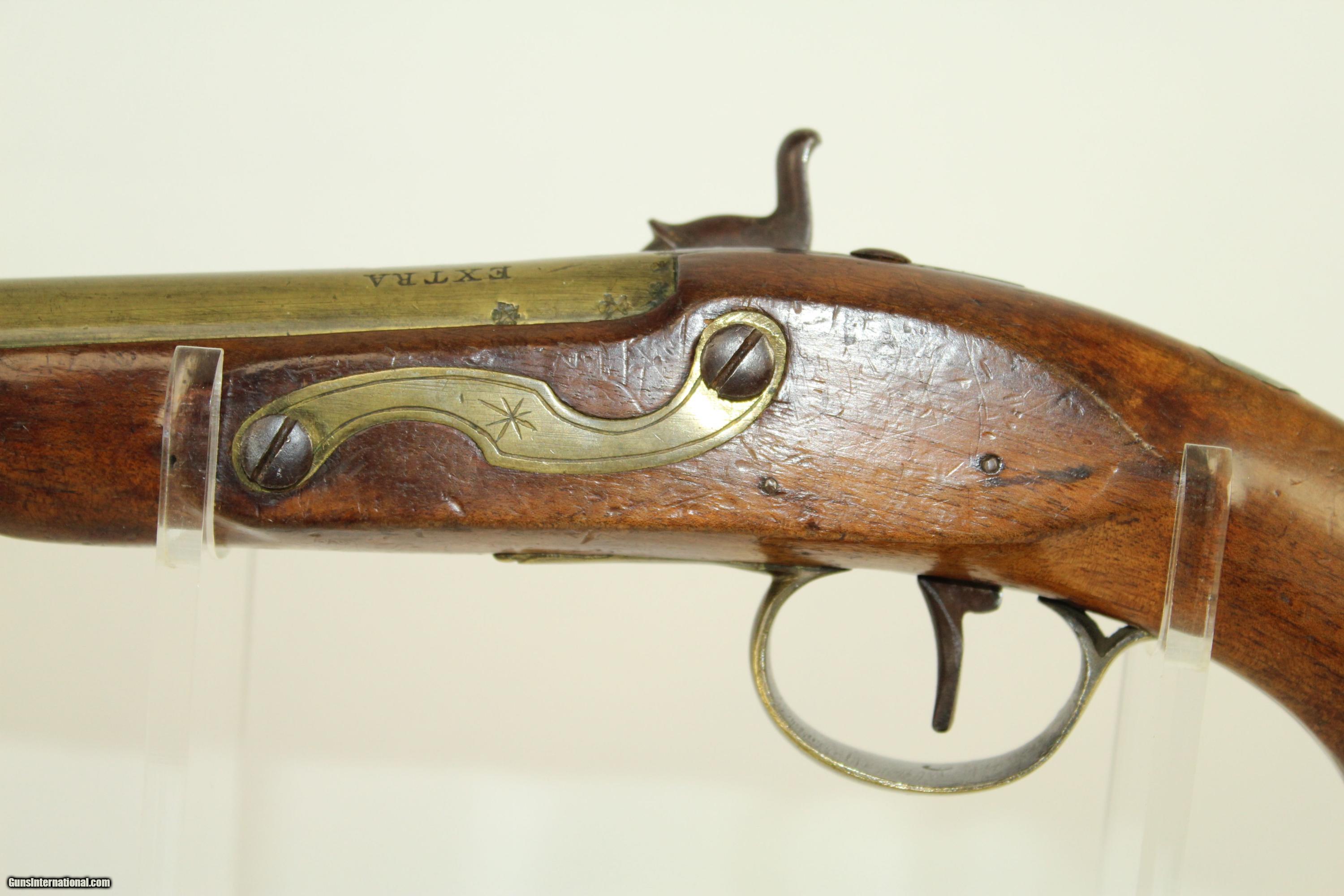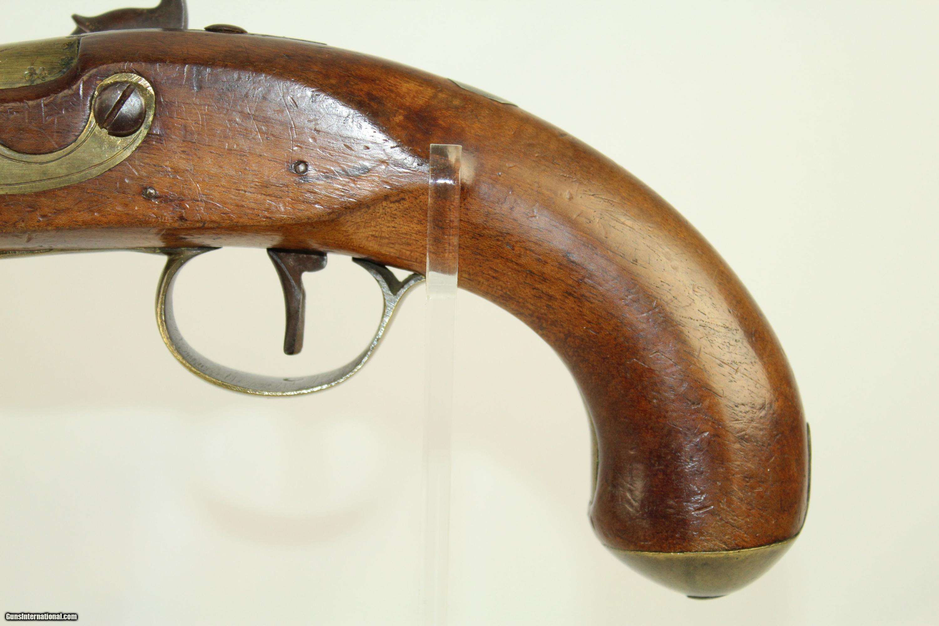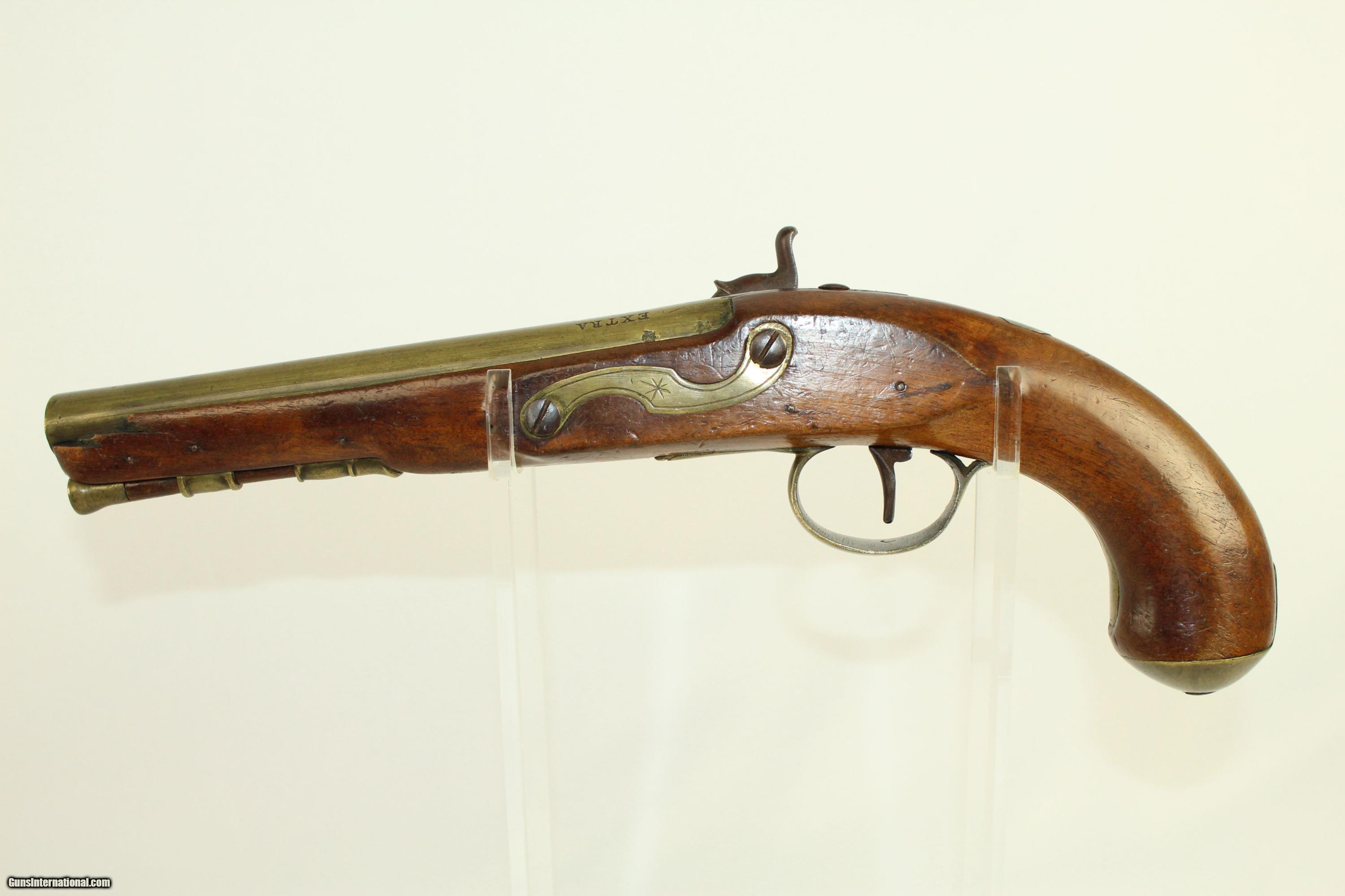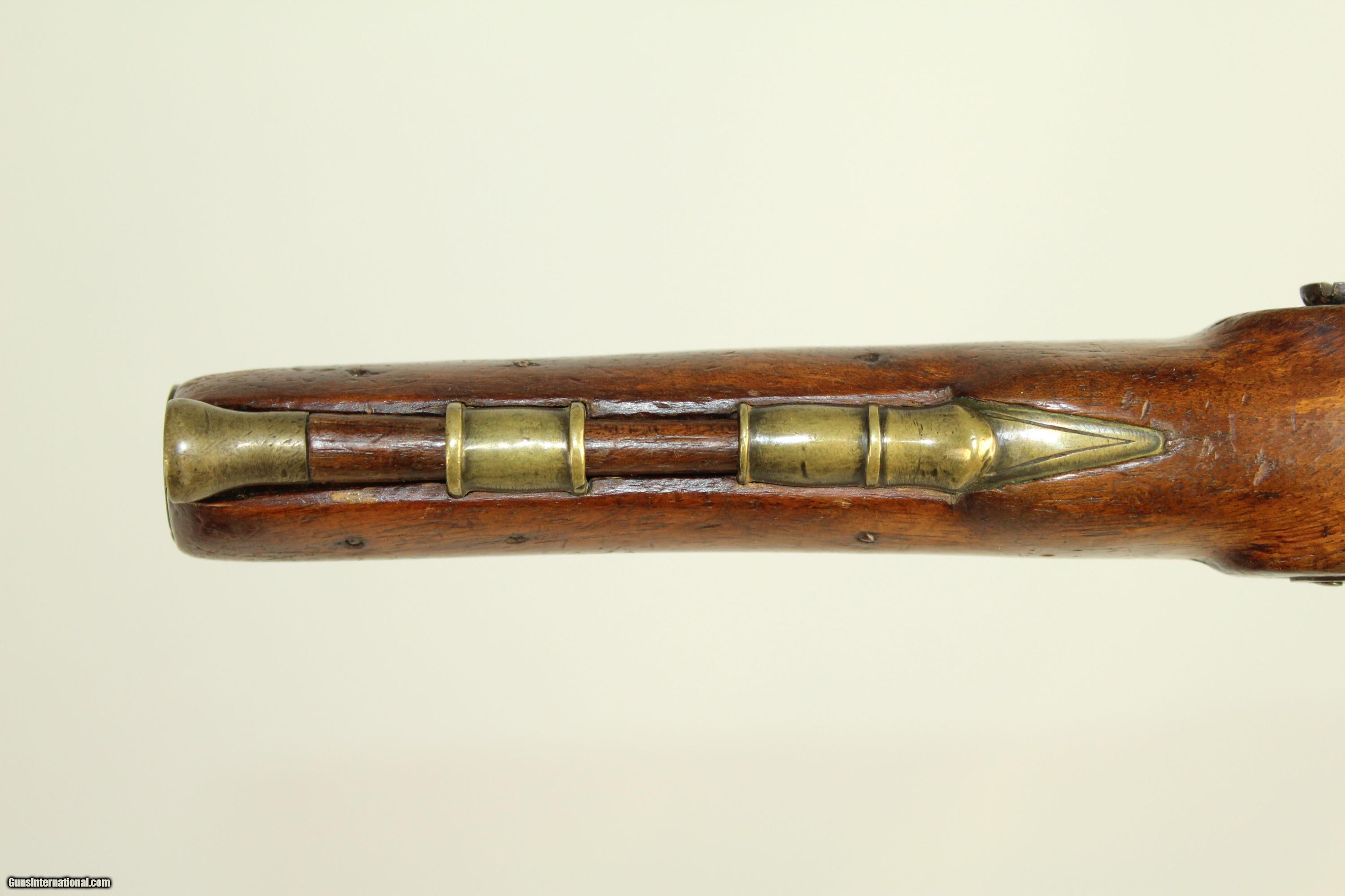 Description: Antique “EXTRA SHARPE PROOF” Converted Pistol British with Birmingham Proofs & Brass Barrel Here we present an antique Sharpe Percussion Belt Pistol, originally made as a flintlock, circa the late 1700s in England. This pistol was designed to make massive holes in things, especially in self-defense or war-time. This pistol would have been a horse carried pistol or perhaps even worn on a belt. This specimen is marked “EXTRA SHARPE PROOF” on the top of the barrel, along with Birmingham proof marks. The lock is also marked “SHARPE”. The gun features a handsome brass barrel. The lock was updated circa 1840 with the new percussion technology of the time, making it more reliable. The overall condition is very good. The brass barrel has taken a dark patina with time. The markings are deep and clear. The stock has a little chipping and a crack running from the muzzle in the ramrod channel. Otherwise it is solid and sturdy. Own the original! This is a legitimate antique and not a reproduction. Barrel is 7-3/4 inches in length. Caliber: .55 The bore is fine and the firing mechanism is strong. Overall condition as seen in photos. Here is a very interesting large bore flintlock pistol. Very Fast. Very Safe. FREE SHIPPING WORLDWIDE. Delivered directly to your door by express mail! Guaranteed AUTHENTIC & Includes CERTIFICATE OF AUTHENTICITY. ancestryguns $1350 #21909 SOLD Antique: Yes |