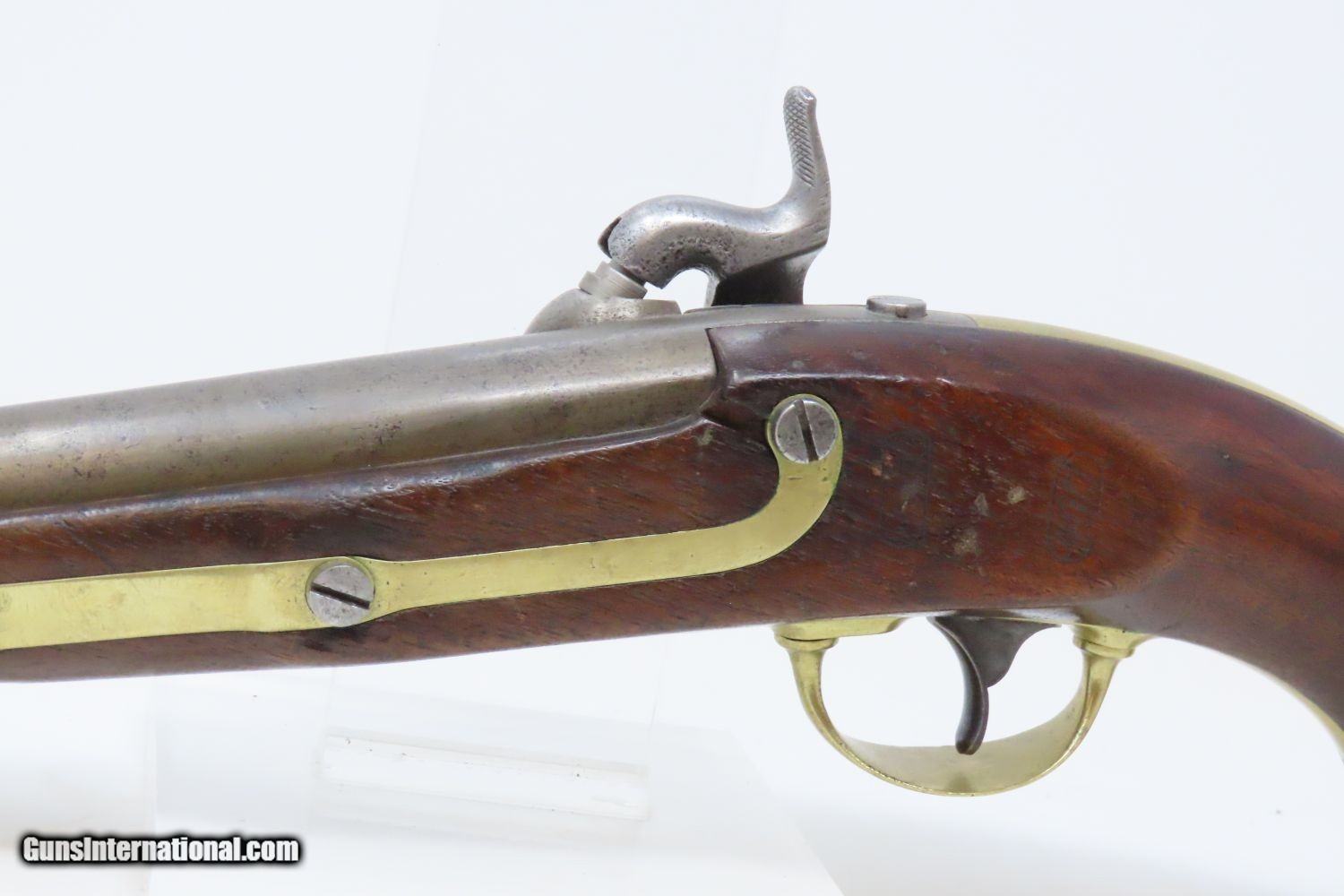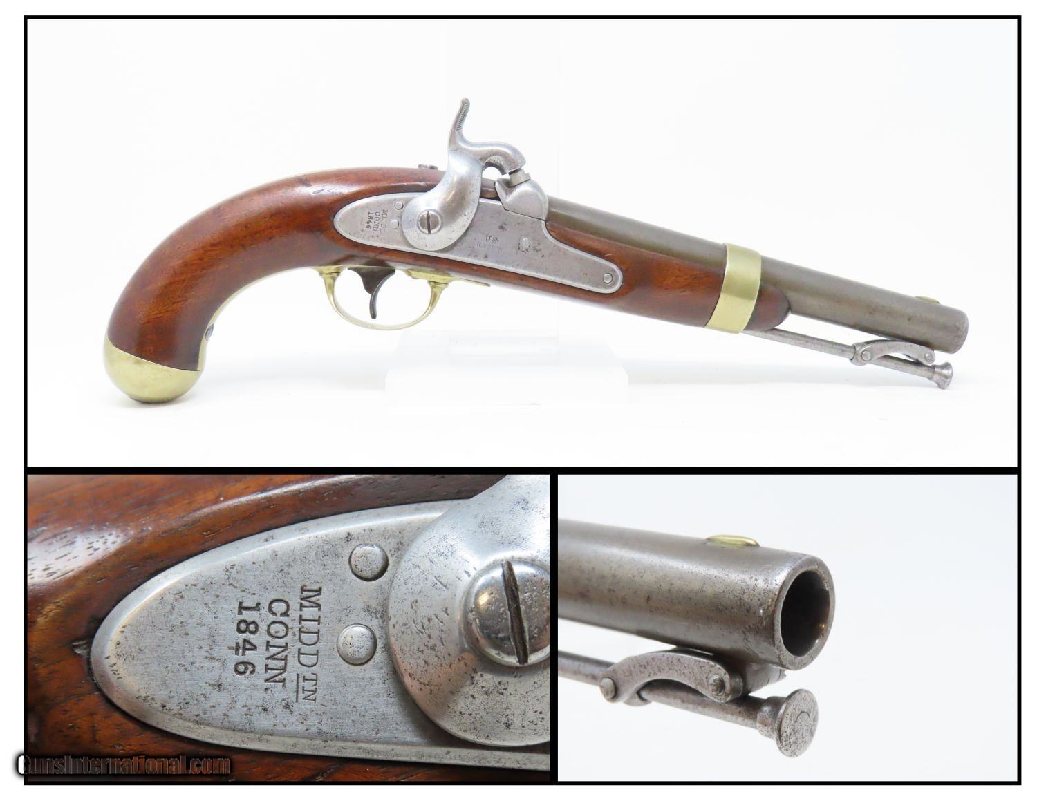 Description: Antique HENRY ASTON 1st U.S. Contract Model 1842 DRAGOON Percussion Pistol Made in the Start of the Mexican-American War in 1846 Here we present an antique Aston First U.S. Contract Model 1842 Dragoon’s Pistol, made in 1846 in Middletown, Connecticut, in the start of the Mexican-American War. Henry Aston was a gunmaker from Middletown who received a government contract to produce 24,000 Model 1842 pistols in his first contract for the firearm that spanned from 1846-1851. Between 1851 and 1852, he received a second contract for an additional 6,000 units. The Model 1842 saw service during a time of great change and increasing tension, as well as firearms innovation. The Mexican-American War (1846-1848), the numerous conflicts with Native Americans, annexing of new territory, the rising blood-pressure over slavery, and a quick 36% population increase that all culminated in the blood-letting of the American Civil War. This was the first official percussion pistol to be adopted by the U.S. and simultaneously the last large smooth bore single shot pistol. By 1845 it was the primary issued weapon to the First and Second Regiment of Dragoons, replacing many of their Model 1836 flintlocks, just in time for the Mexican-American War. The Model 1842 was the last single shot smoothbore pistol issued by the U.S. Army. The 1842 features sturdy construction with lots of brass for support. This was important during a time when one would expend their shots and still have a fight on their hands. Striking your opponent with the pommel of your gun was quite effective. The ramrod is captive, so that it would not be lost in the heat of battle on top of a horse. Many of these were used, especially initially, by both sides during the American Civil War. The overall condition is very good. Excellent action. Nice smooth bore. Solid walnut stock with low wear and 2 cartouches on the left side. “1849” dated lock. Own the original! This is a legitimate antique and not a reproduction. Barrel is 8-1/2 inches. Caliber: .54 Percussion Overall condition as seen in photos. Very Fast. Very Safe. FREE SHIPPING WORLDWIDE. Delivered directly to your door by express mail! Guaranteed AUTHENTIC & Includes CERTIFICATE OF AUTHENTICITY. ancestryguns $1785 #215085 SOLD Antique: Yes |