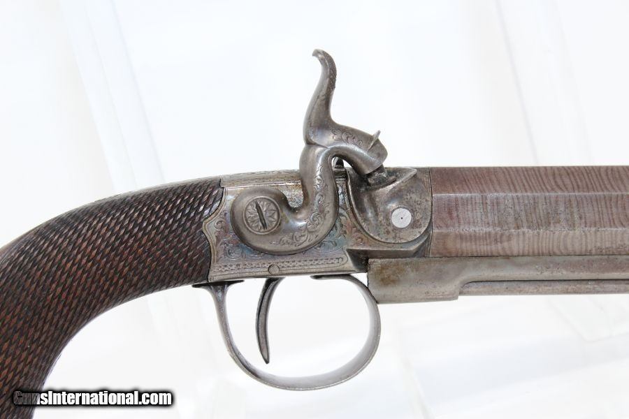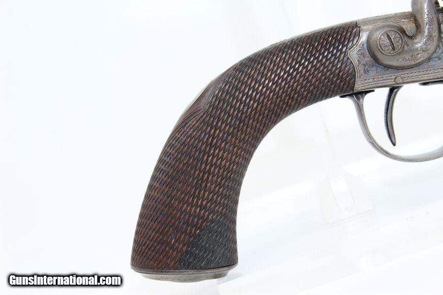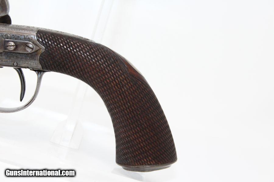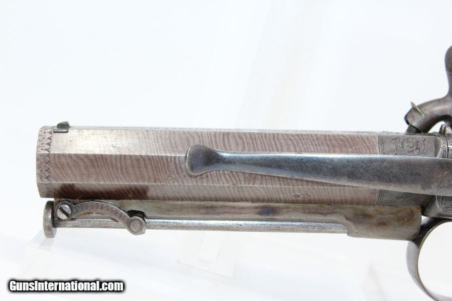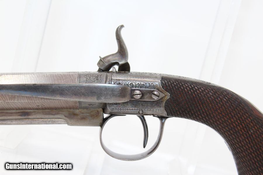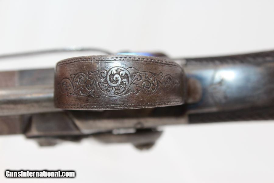 Description: Antique MOORE & WOODWARD British PERCUSSION Pistol Beautifully Engraved Pistol Manufactured Circa Mid-19th Century Here we present an antique Moore & Woodward Percussion Pistol, made circa mid-19th century in London, England. Charles Moore is recorded as owning a gun business in the city of London at 64 St.; James Street, in 1821 at 2 Regent Circus, later re-names Piccadilly Circus. After 8 years in the gun-making business, Moore was appointed “Furbisher” (Repairer of Guns) to St. James’ Palace and Hampton Court. In 1836 he was appointed “Gunmaker-in-Ordinary to King William IV. In 1843, he entered into a partnership with James Woodward, who began his gun-making career as an apprentice to Charles Moore in 1827 and rose to be the head finisher prior to becoming Moore’s partner. This partnership established the business “Moore and Woodward”. This business stayed active from 1843 through 1872. The overall condition is fine. Case colors and Damascened pattern are strong. The markings are clear. The hand-checkered walnut grip is in fine shape. The smooth bore is in good shape. The action is excellent, strong and crisp. Own the original! This is a legitimate antique and not a reproduction. Barrel is 3 3/4 inch octagon. Caliber: .52 percussion Overall condition as seen in photos. Very Fast. Very Safe. FREE SHIPPING WORLDWIDE. Delivered directly to your door by express mail! Guaranteed AUTHENTIC & Includes CERTIFICATE OF AUTHENTICITY. ancestryguns $1650 #8076 SOLD Antique: Yes |