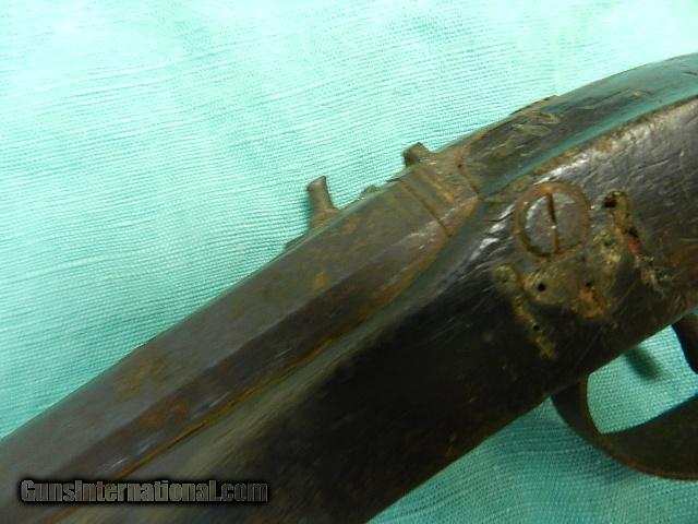 Description: An antique percussion pistol in relic condition for a wall hanger or a restoration project. The octagonal 11" has very early oval English proofs.. Name on lock looks like Clark, and it looks like the hammer screw was broke off.Pistol grip has very fine hand checkering present. The iron trigger guard has a pineapple finial, and has an iron round butt-cap. The barrel has a under rib with a rem-rod ferrule. The smooth bore has corrosion. A section of the European walnut wood is missing under the lock. The iron ferrule that fits into the front f the stock is not present. To buy a gun from me you must get a direct email for me, with details, and shipping cost. We don’t have asite .I prefer money orders or a check. Item ships when funds come in. If you can only pay with a card let me know. I’m sorry I don’t list my phone number, did that for 30 days, never again.. I can’t talk on the phone all day…who will ship the guns? I’m just one person, and it’s very busy here! I do a brisk volume! I hope you like my wide selection of unusual guns, knives and gun parts. Shipping price determined by zip code. I try to keep the prices affordable, which means I make less money than most dealers. You won’t get altitude sickness with my prices! I consistently have the best selection of older guns If you attempt to buy, you must still contact us for details, buying doesn't end the sale, it just sends an email telling us you want to buy this gun. A phone call won’t secure a sale! Not home many times, the first buyer by email buys the gun !Thissite does not close down a sale when you do a BUY! I can get six buys in an hour, first buyer to email gets the guns, others are in second place! Best to send another email . Sometimes not home to get calls. Some guns are required shipment to a gun dealer near you for a transfer to you when it arrives. With the widest selection of older guns at great prices, We don’t have a store, and sell on the internet only. Thank You. SOLD Antique: Yes |