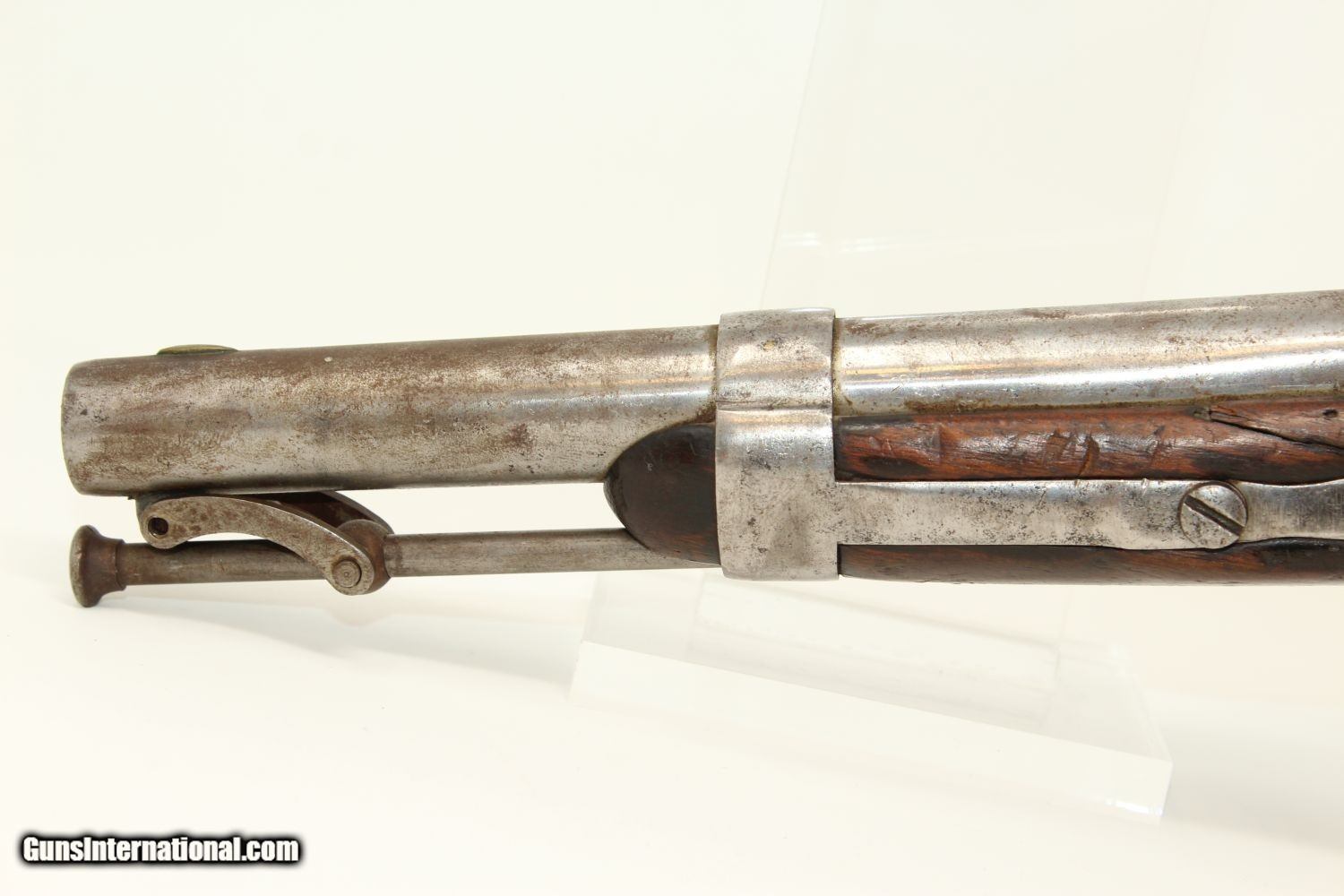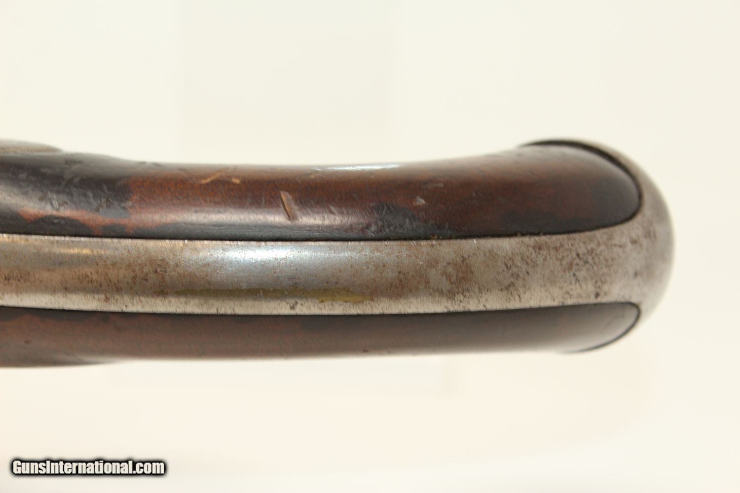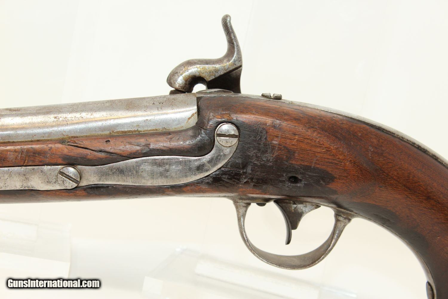 Description: Antique R. JOHNSON 1836 Percussion DRAGOON Pistol MEXICAN-AMERICAN WAR Conversion Pistol, Dated 1836 Here we present an antique Robert Johnson U.S. Model 1836 Percussion Pistol, made in 1836. This pistol would have started out as a flintlock and had a period conversion as the new technology developed. There were actually two manufacturers of these guns: Robert Johnson and Asa Waters. Combined, the production totals 41,000 guns. This was the last U.S. martial pistol to use the flintlock system, and many consider this the best of all U.S. flint guns due to its craftsmanship and aesthetic appeal. The gun is historically significant as this was the primary issue pistol during the Mexican American War (1846-1848) and was even significantly used during the American Civil War (1861-1865), especially in this percussion converted format. The lock plate is roll-stamped with “US / R. Johnson / MIDDn CONN / 1836" in four lines. There are inspection marks on the left side of the barrel breech. Many of these were lost to attrition during the various conflicts listed above, and many were converted for use, as is this one, by the North & South during the Civil War. The overall condition is good. The iron parts are gray. Most of the markings are legible. The walnut stock has seen hard use. The bore is smooth and in good shape. The action is strong and crisp. Own the original! This is a legitimate antique and not a reproduction. Barrel is 8-1/2 inches. Caliber: .54 Overall condition as seen in photos. Very Fast. Very Safe. FREE SHIPPING WORLDWIDE. Delivered directly to your door by express mail! Guaranteed AUTHENTIC & Includes CERTIFICATE OF AUTHENTICITY. ancestryguns $1200 #190390 SOLD Antique: Yes |
