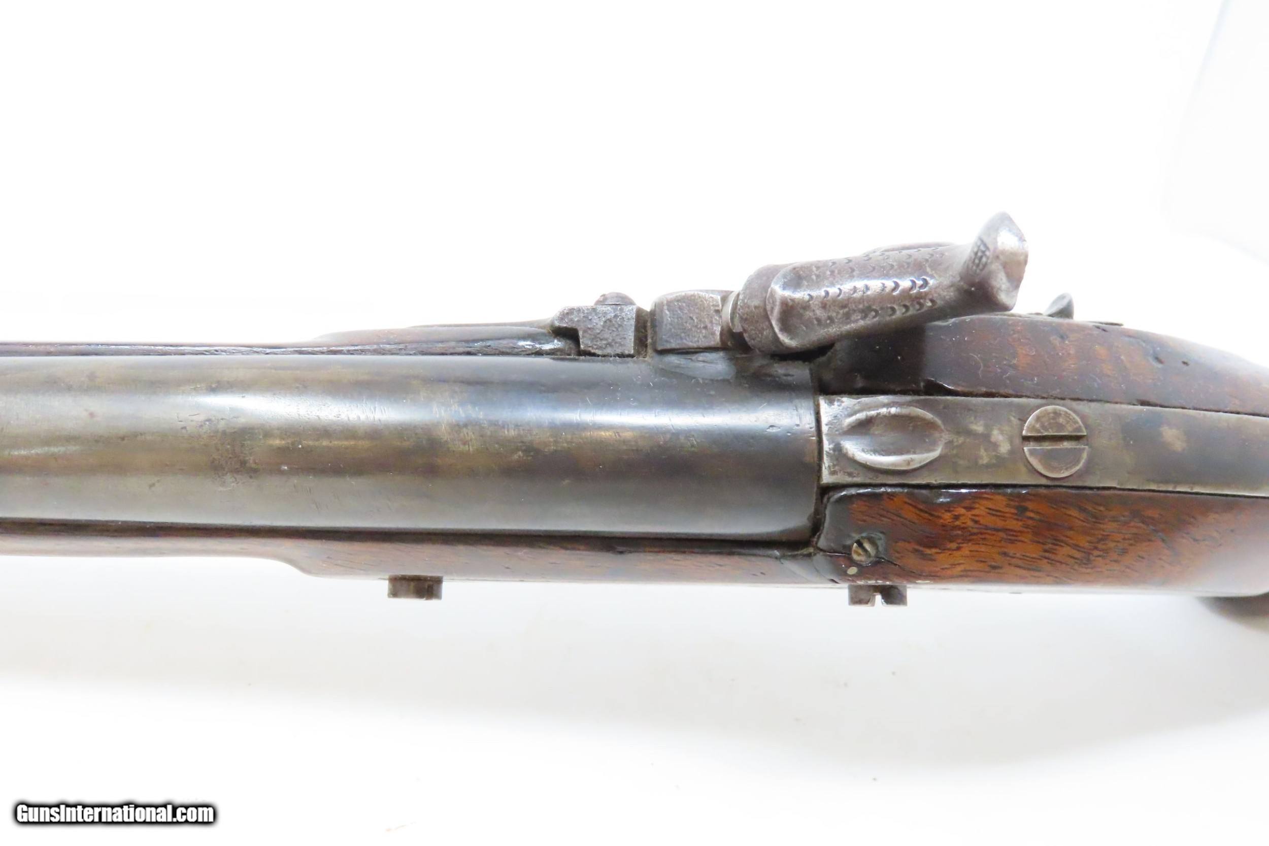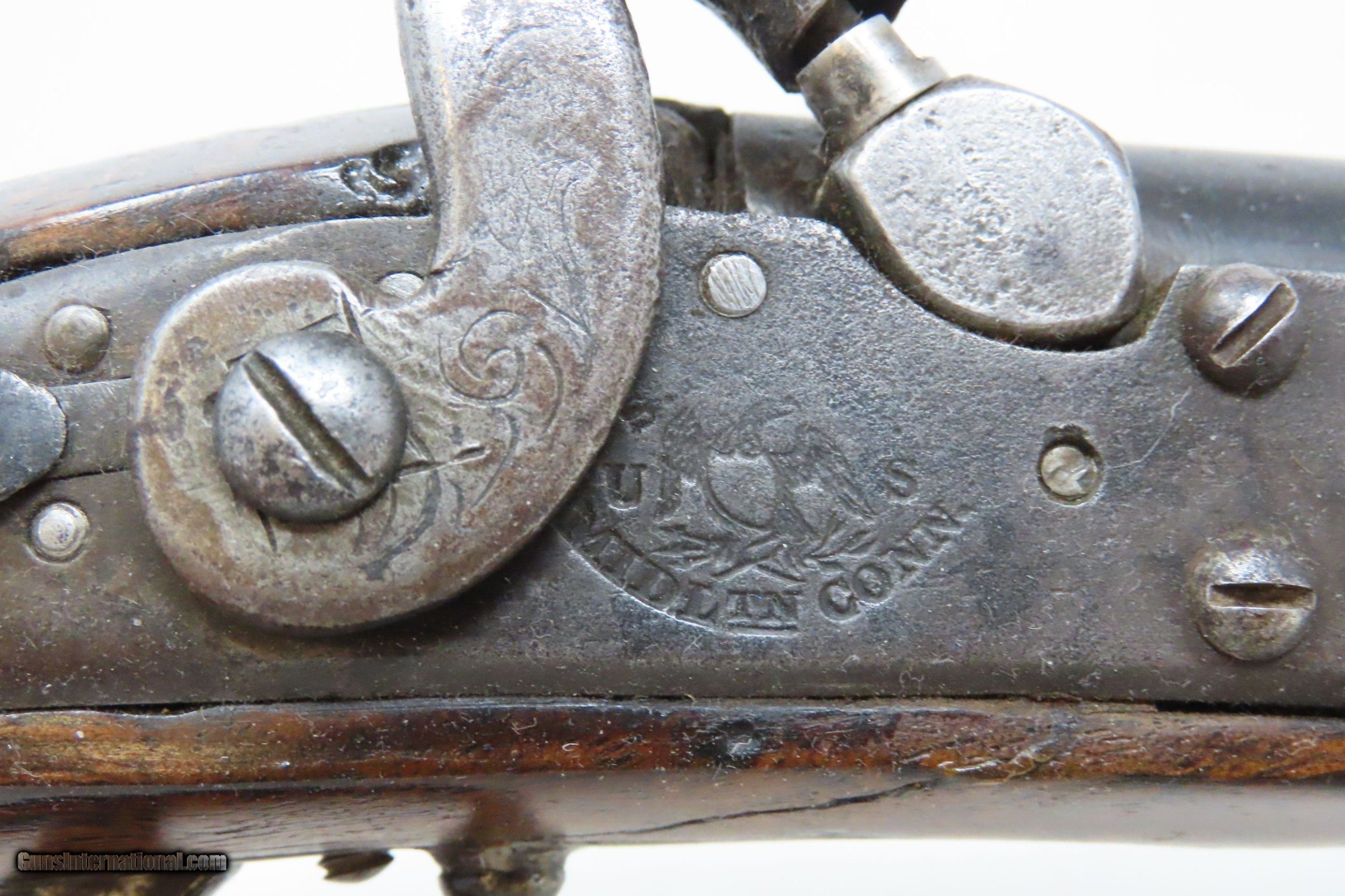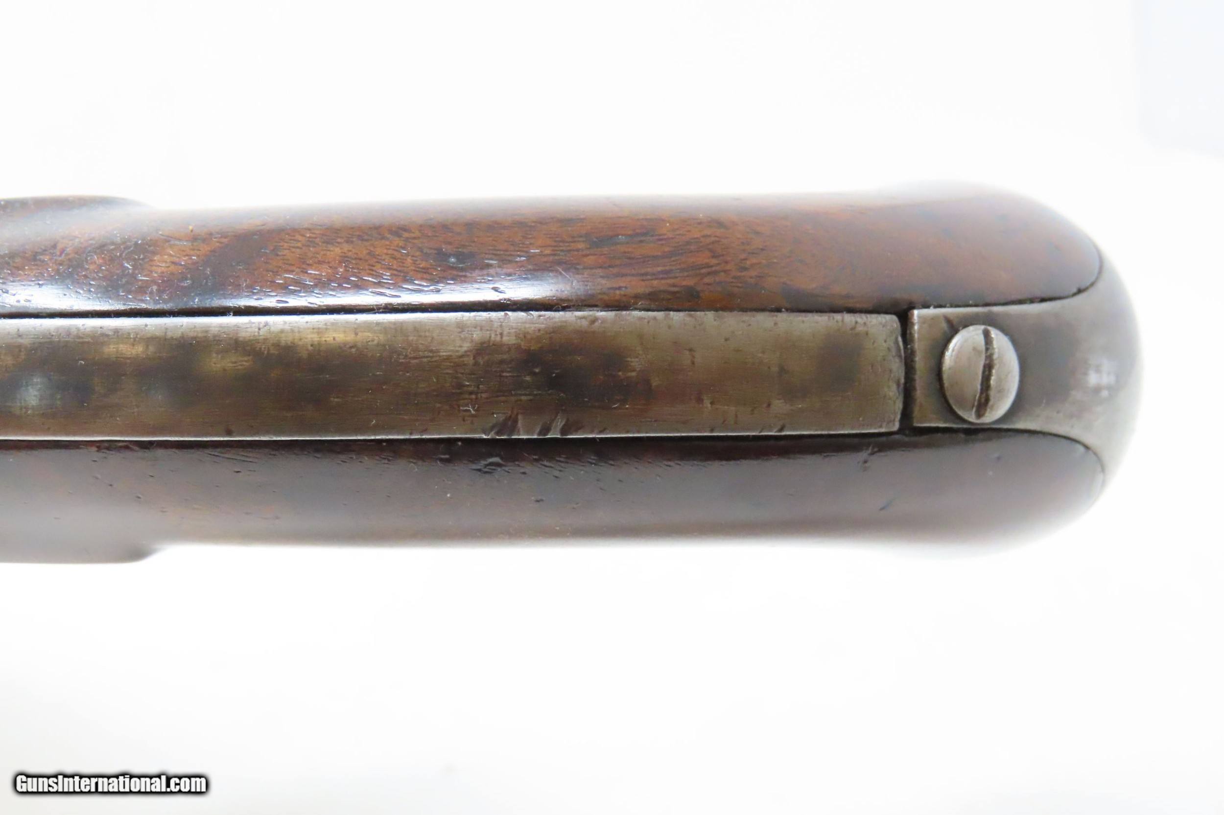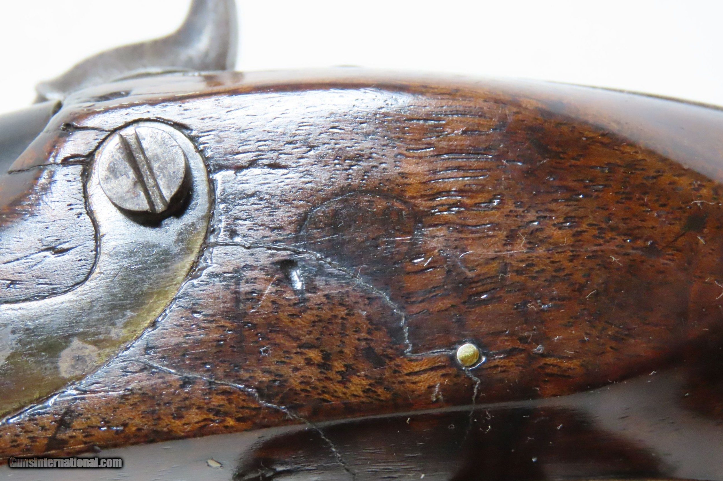 Description: Antique SIMEON NORTH U.S. CONTRACT Model 1819 .54 Caliber CONVERSION Pistol LONG BARRELED Army & Navy Sidearm w/1822 Dated Lock Here we present an antique U.S. Model 1819 Simeon North Percussion Conversion Martial Pistol, made circa 1822 in Middletown, Connecticut. This .54 caliber smoothbore U.S. Contract Model 1819 pistol was made by Simeon North for a U.S. army contract and would have started out life as a flintlock prior to being converted to percussion when the more reliable system was introduced. This pistol was updated with a commercial type hammer. It was also rebarreled at some point with a much longer than standard smoothbore barrel with a front sight blade. The overall condition is good. The action is strong. The bore is smooth and dim. The stock shows some old fissures but it all remains solid and stable. An interesting piece! Own the original! This is a legitimate antique and not a reproduction. Barrel is 19 inches. Caliber: .54 Smoothbore Overall condition as seen in photos. Very Fast. Very Safe. FREE SHIPPING WORLDWIDE. Delivered directly to your door by express mail! Guaranteed AUTHENTIC & Includes CERTIFICATE OF AUTHENTICITY. ancestryguns $1300 #220108 SOLD Antique: Yes |