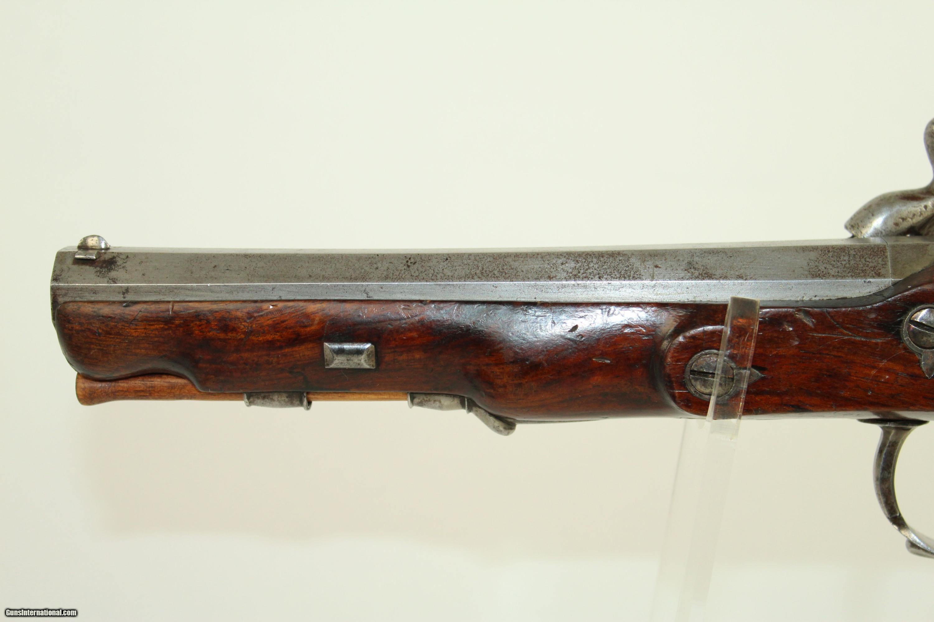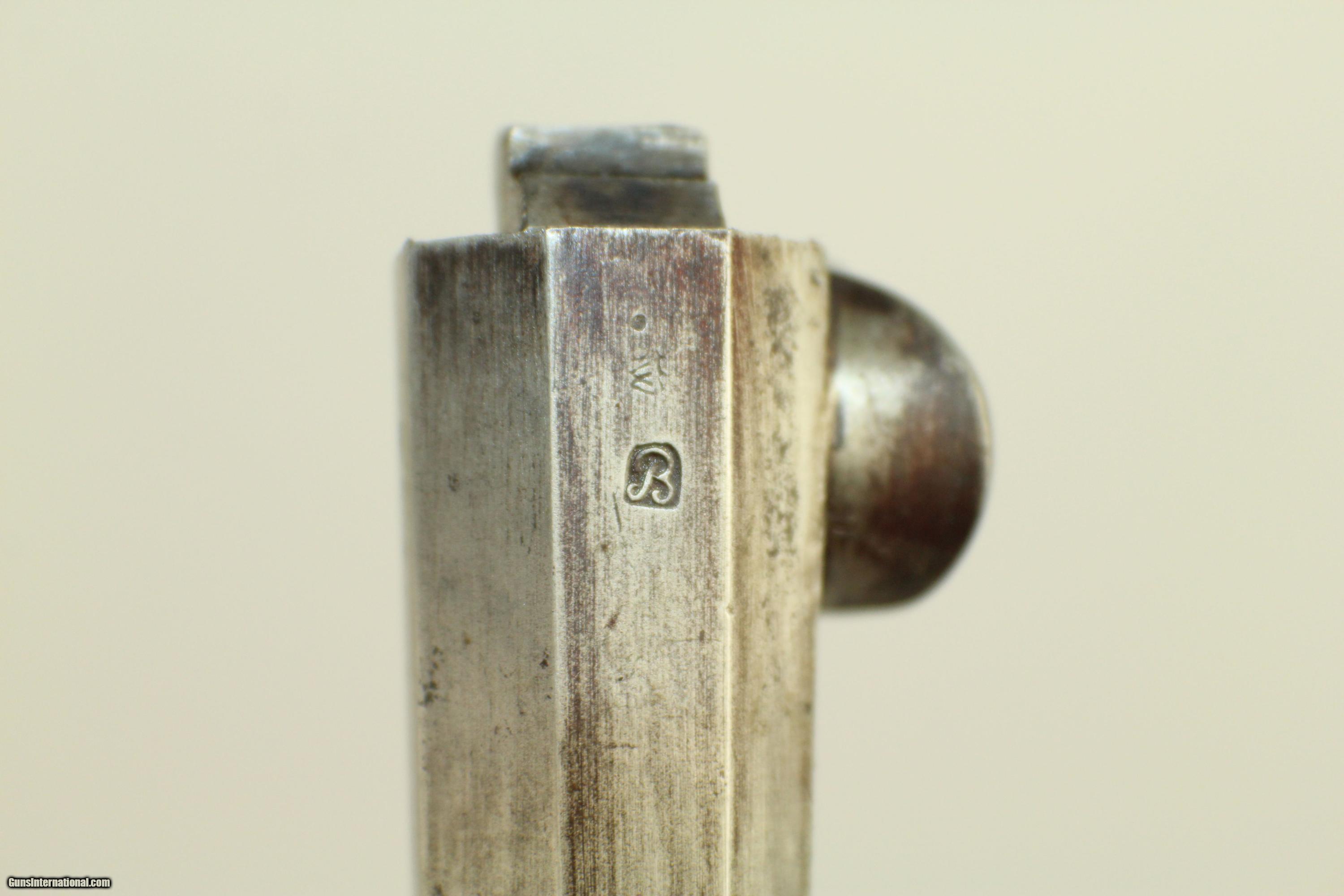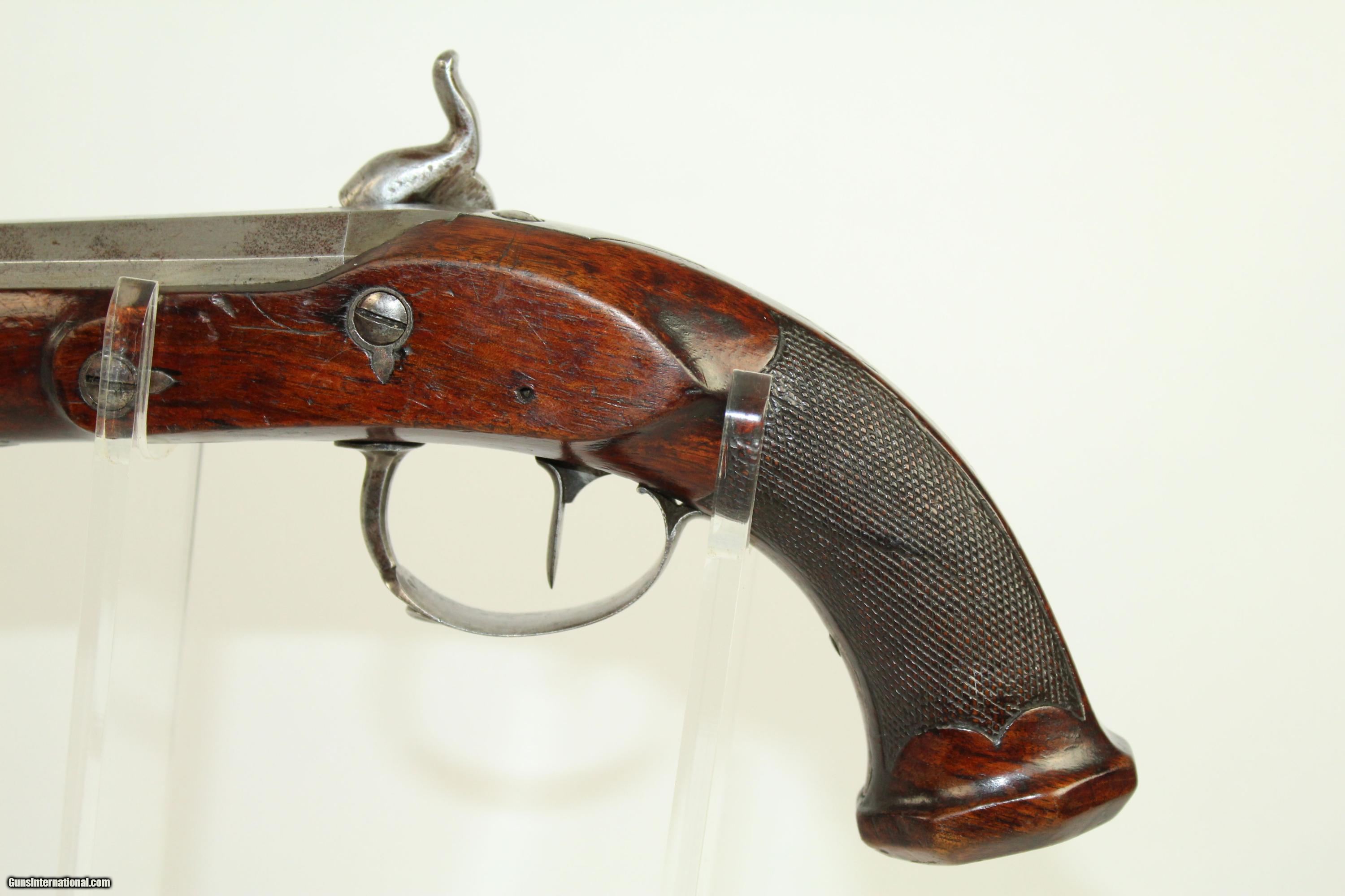 Description: Antique Western EUROPEAN Percussion Belt Pistol Spartan Gentleman’s Belt Pistol circa 1840 Here we present an antique Percussion Belt Pistol, made circa 1840 in Europe, perhaps France. Belt-sized pistols like these were used to defend oneself when traveling or in public places. It was big enough to fight with, but not so large as to be cumbersome. They could be both as handsome or as plain as one desired or could afford. This specimen is utilitarian in design, being of high quality with little embellishment. Inside the lock reveals a maker’s mark “DW” and the underside of the barrel is marked “D/W” and “R” inside a rectangle. The barrel is 7-1/4 inches and octagonal. It features a .52 caliber smooth bore and an adjustable front sight. The overall condition is fine. Metal is smooth and in the white. The stock is solid. The bore is in very good condition and the action is excellent. Own the original! This is a legitimate antique and not a reproduction. Barrel is 7-1/4 inches in length. Caliber: .52 percussion The bore is in very good condition and the firing mechanism is excellent. Overall condition as seen in photos. Here is a fantastic European pistol from the mid-1800s. Very Fast. Very Safe. FREE SHIPPING WORLDWIDE. Delivered directly to your door by express mail! Guaranteed AUTHENTIC & Includes CERTIFICATE OF AUTHENTICITY. ancestryguns $950 #21815 SOLD Antique: Yes |