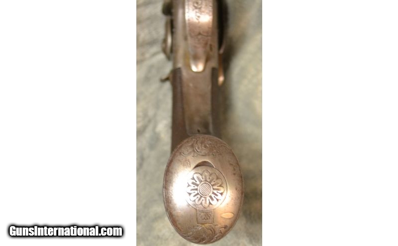 Description: B Cogswell English Belt gun, smoothbore .63 cal percussion Hammer and trigger mechanism functional. SOLD Antique: Yes Manufacturer: circa 1850 estimate Caliber Info: .63 smoothbore Metal Condition: some original bluing exists Wood Condition: very good fine checkering Bore Condition: good Barrels: 5 inch Triggers: Single Sights: Bead Item Location: Grandville, MI |