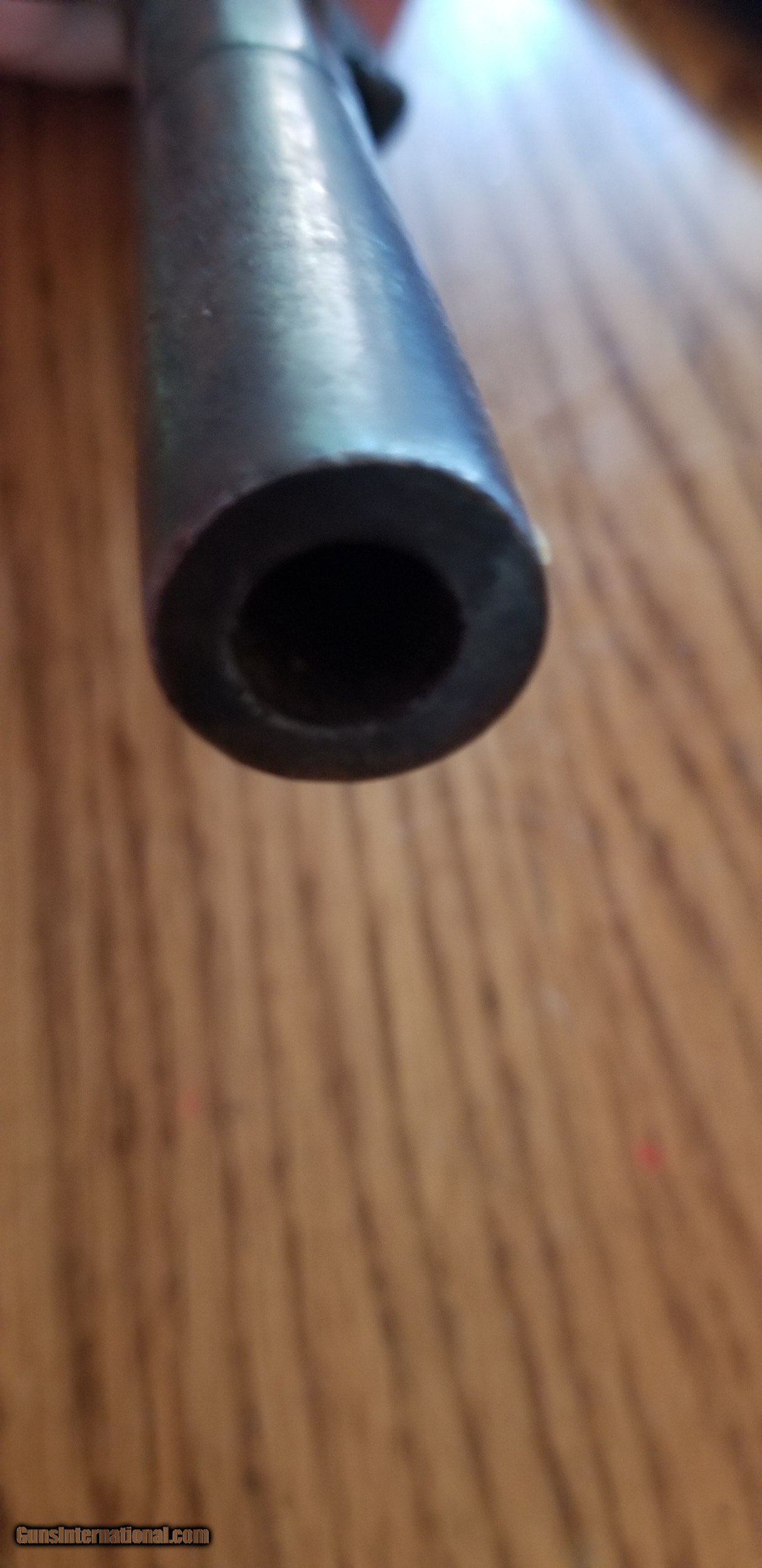 Description: This is an attractive Civil War Era single shot percussion pistol that dates to the mid-19th century. Bag-shaped grips appear to be rosewood. Part octagon/round barrel is .36 caliber measures 4" in length. Brass frame and straps are simply engraved with modest scrolls along each side and down the backstrap. It's well made but was never marked. Similar to an 1850's era revolving pepperbox pistol with its bar hammer and double action ring trigger. I'm fairly convinced this is American made as it has no foreign proofs, the engraving is simple compared to English styles, not to mention it bears strong similarities to guns made by Bacon and Allen & Thurber during the 1840's and 50's. Overall, Good UNCLEANED condition. The brass still has all of its original engraving visible. The double action design would have been quite the deal back in the 1850's as very few guns possessed this level of technology...not even Colt revolvers. The action works nicely. Poor Bore. This guns displays quite well, as well as an interesting piece of Americana. $15 shipping SOLD |