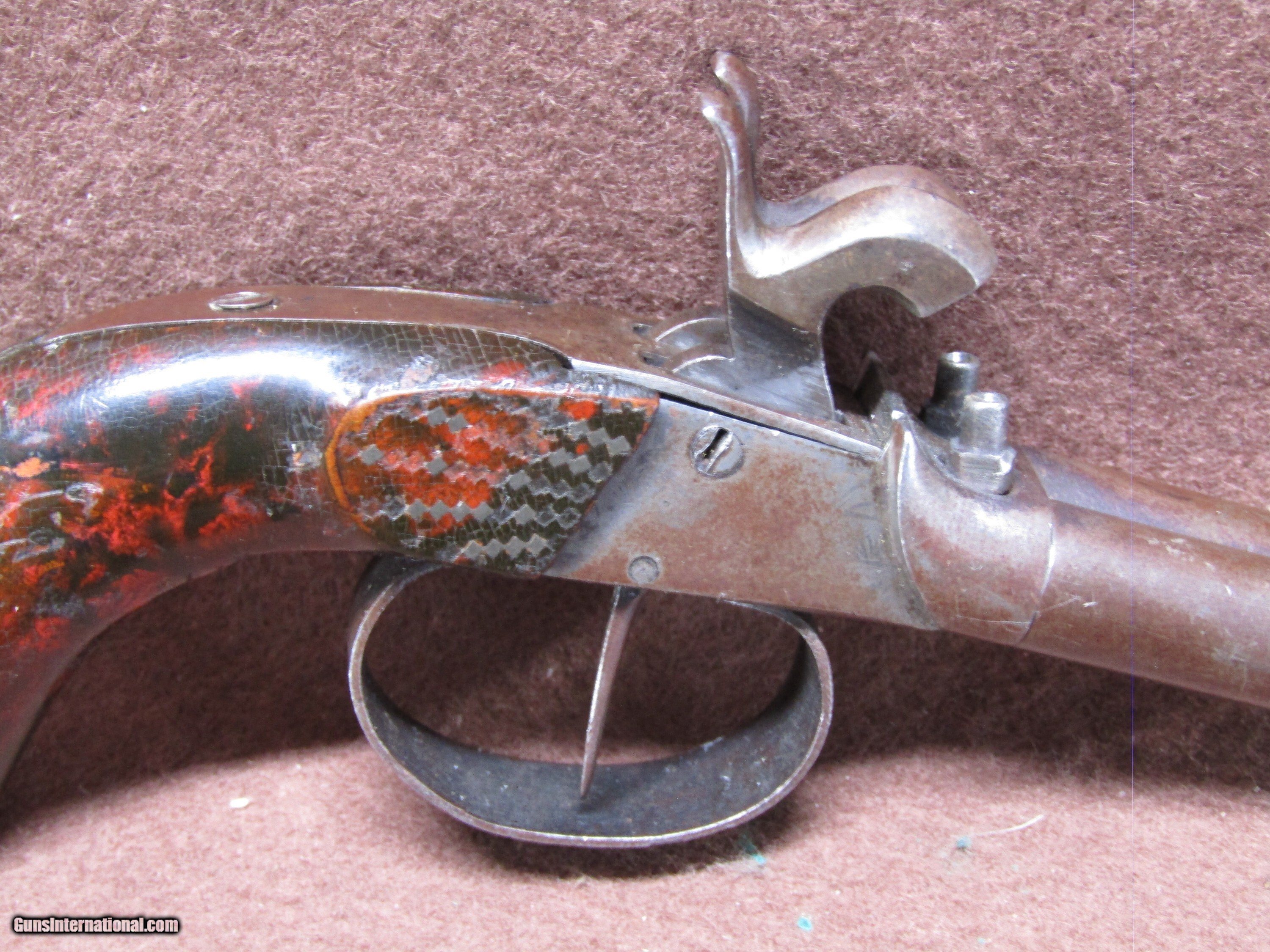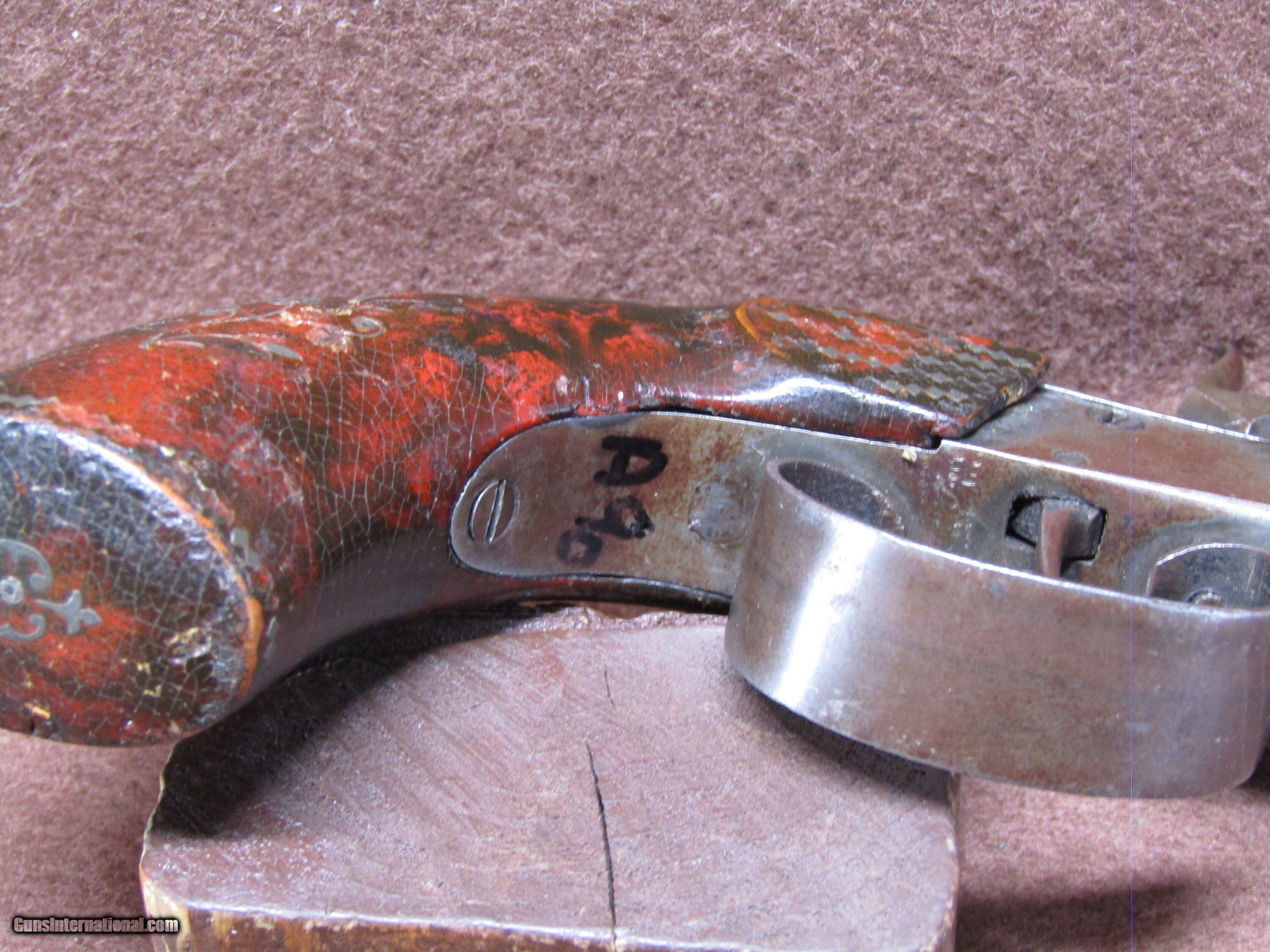 Description: Belgian 36 Cal Side by Side Double Barrel Percussion Pistol with 2.375" Barrels and No Sights. The Metal Parts have Turned to a Brown Patina. The Wire Inlayed Smooth Wood Grips have Chips on the Butt. The Left Hammer doesn't Work and the Trigger is Broken off - As-Is Parts/Project Gun. Antique: Yes Handgun Caliber: .36 Manufacturer: Belgian Model: Double Barrel Percussion Pistol Barrel Length: 2.375 Chambers: 2 Condition: Fair Metal Condition: Fair Wood Condition: Good Bore Condition: Fair Barrels: 2 Barrel Type: Side by Side Price: $265.00 Shipping: $32.88 Buy Now Contact Seller |
