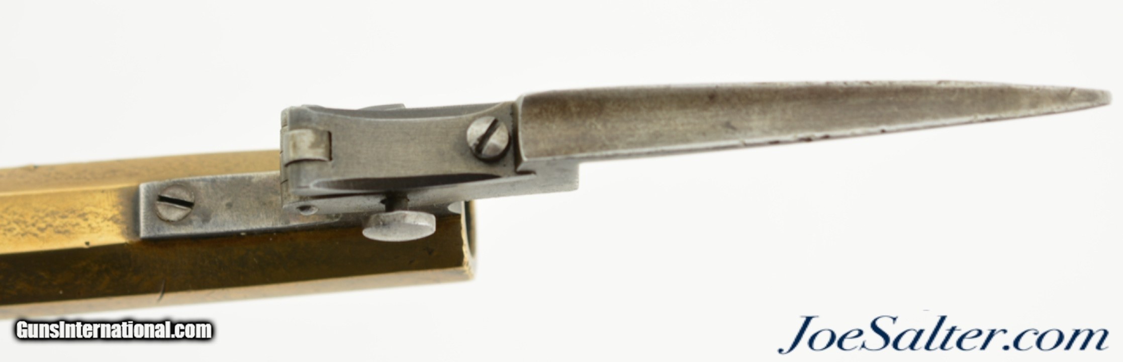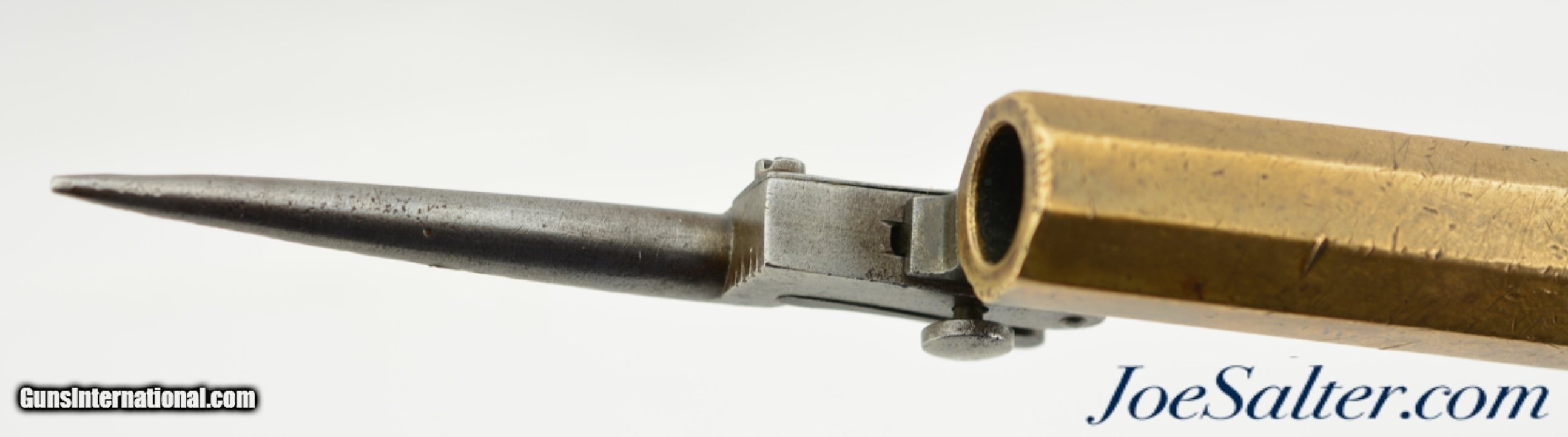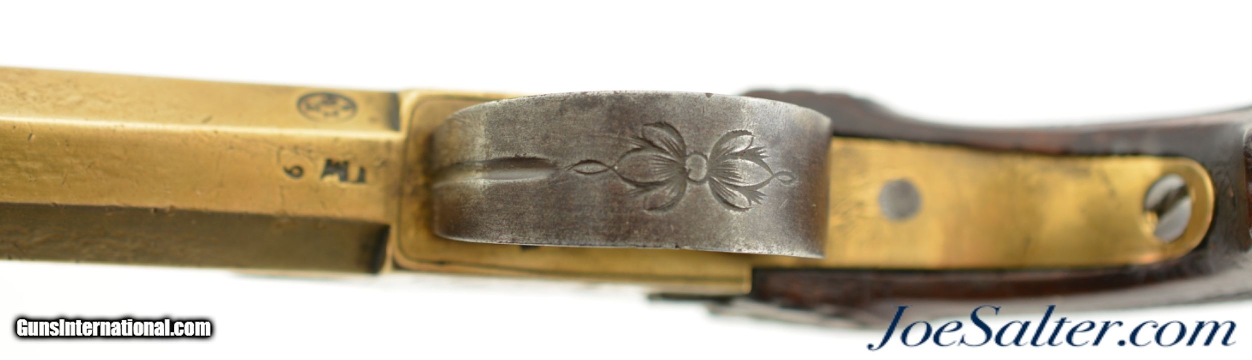Description: NSN, .50 Caliber, 4 1/2" octagon barrel with a good, lightly pitted bore. This is a very handsome pistol that has a box frame with centrally hung hammer, and integrally forged barrel. The brass has an overall ochre tarnish with small dark spots and minor impact marks throughout. The hammer has some mild pitting as well, and the trigger guard/bayonet latch has an overall plum-brown patina. The spring-loaded bayonet has a 2 7/8" blade with a firm spring deploys swiftly and locks firmly. The checkered walnut grip is in good shape, with some wear and flattening to the points, as well as diagonal cracks running back from the frame juncture on both sides. The action is functional, however the hammer does not lock back at full-cock, but rather fires from half-cock. This is a very nice bayonet-equipped pistol, in about very good condition, and would make a neat addition to a collection. Antique; SOLD Antique: Yes |