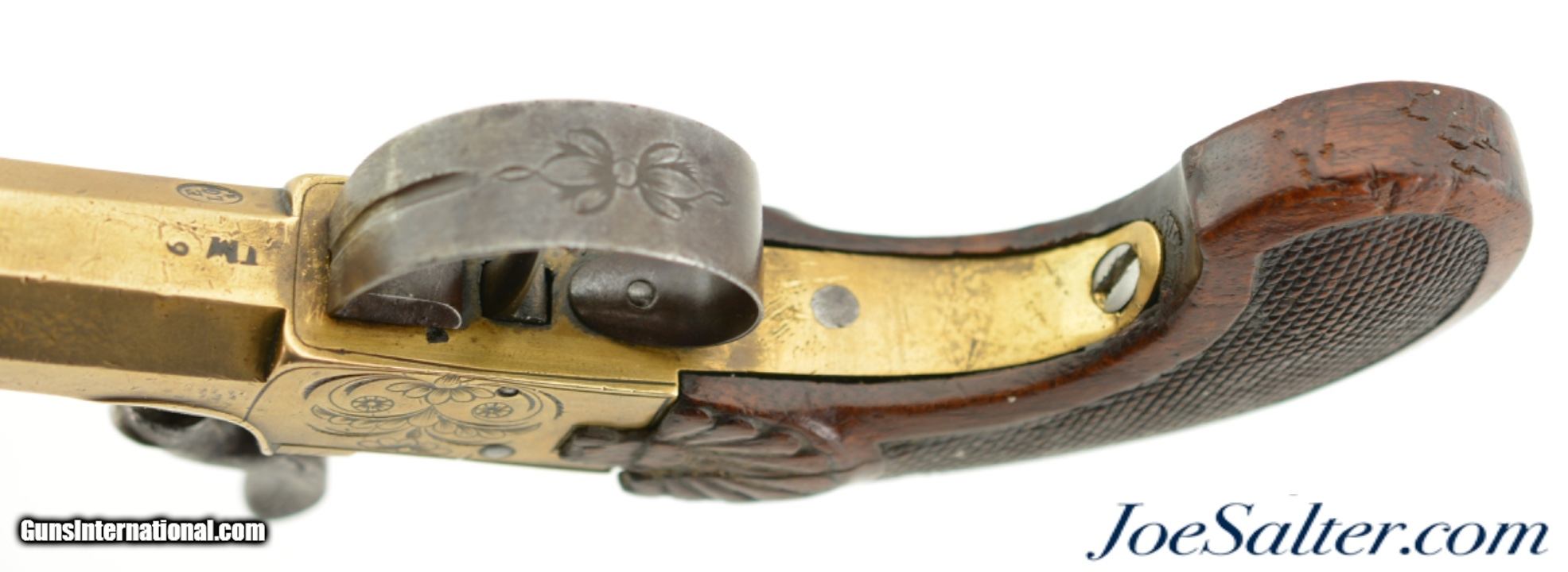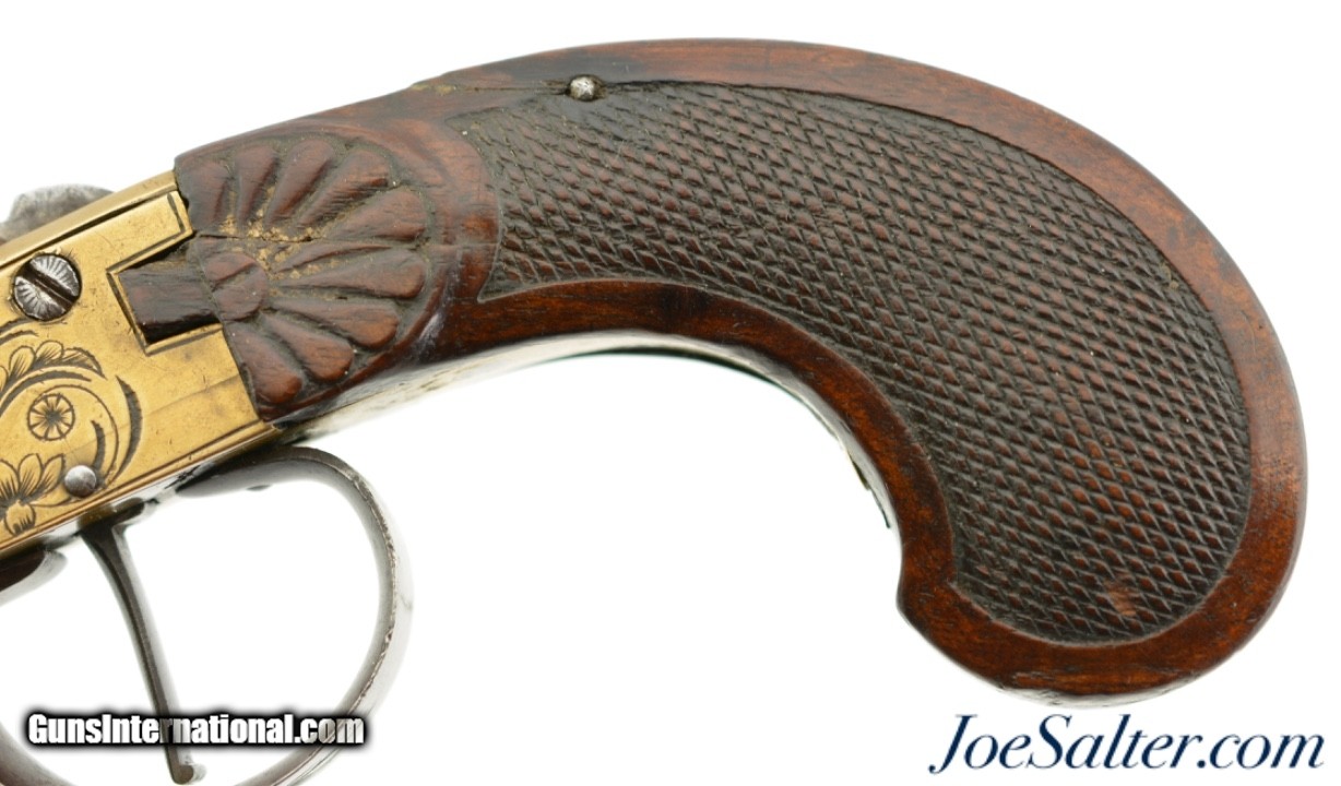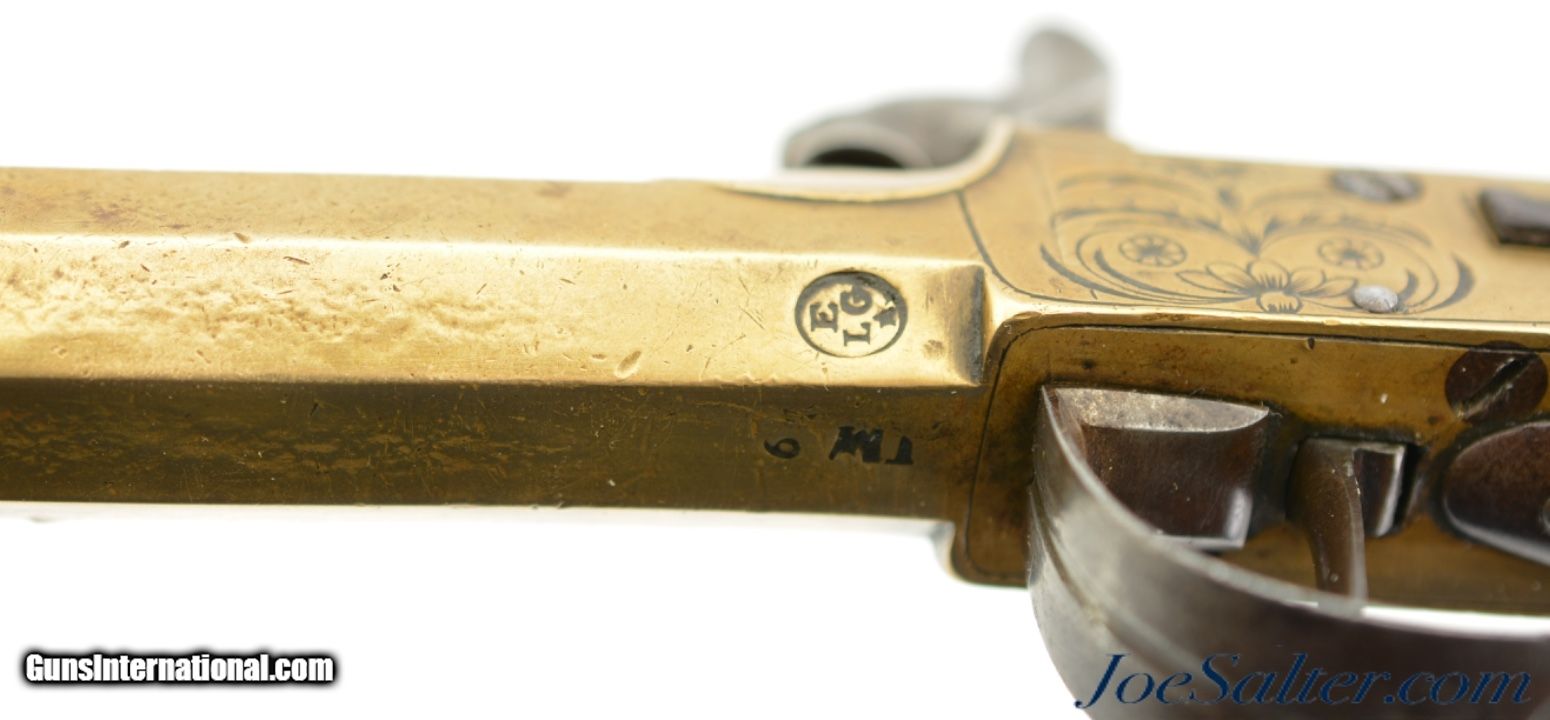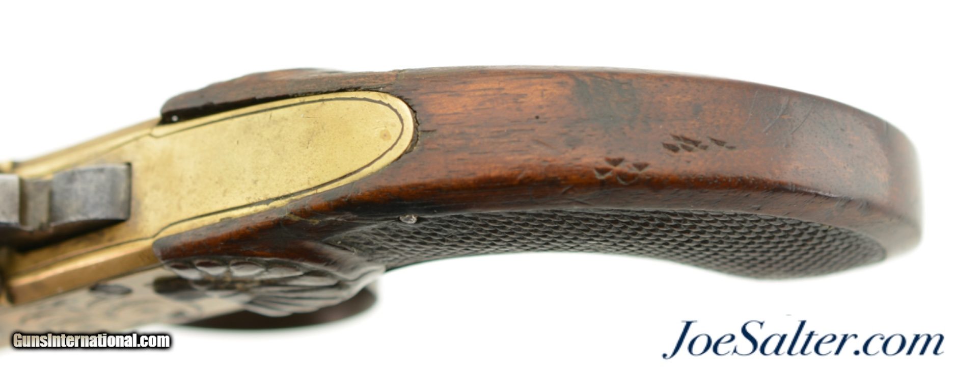Description: NSN, .50 Caliber, 4 1/2" octagon barrel with a good, lightly pitted bore. This is a very handsome pistol that has a box frame with centrally hung hammer, and integrally forged barrel. The brass has an overall ochre tarnish with small dark spots and minor impact marks throughout. The hammer has some mild pitting as well, and the trigger guard/bayonet latch has an overall plum-brown patina. The spring-loaded bayonet has a 2 7/8" blade with a firm spring deploys swiftly and locks firmly. The checkered walnut grip is in good shape, with some wear and flattening to the points, as well as diagonal cracks running back from the frame juncture on both sides. The action is functional, however the hammer does not lock back at full-cock, but rather fires from half-cock. This is a very nice bayonet-equipped pistol, in about very good condition, and would make a neat addition to a collection. Antique; SOLD Antique: Yes |