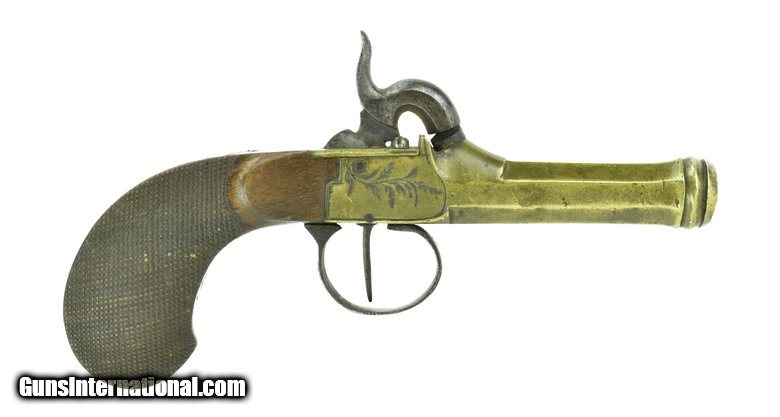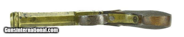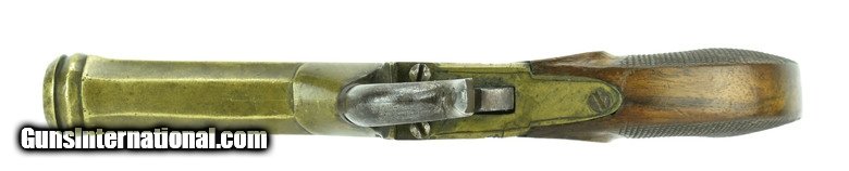 Description: Belgian Brass Barrel Boxlock Percussion Pistol. .44 Caliber brass barrel percussion pistol. Nice sharp gun with a 2 1/2” barrel. Action works well. Barrel has a Belgian Liege proof. Grips are nicely checkered wood.