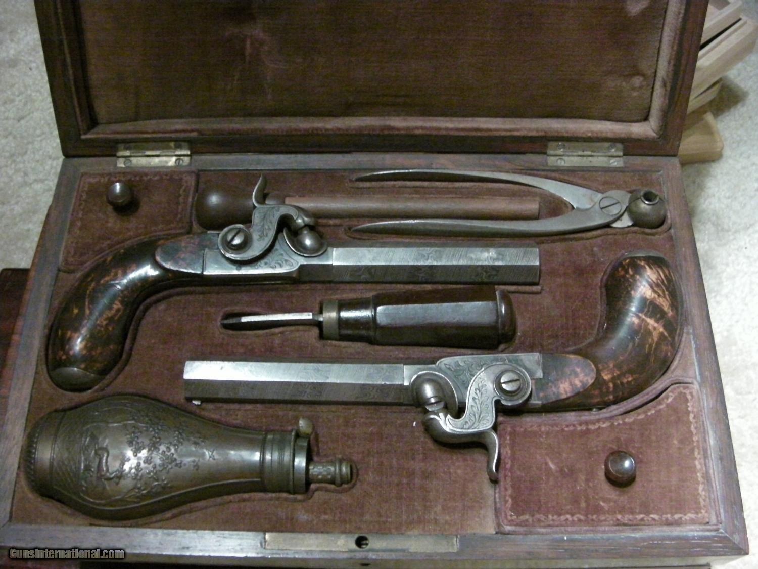 Description: BELGIAN CASED SCREW BARRELS with POWDER FLASK LEIGE BELGIUM PROOF MARKS PLEASE NOTE: We are not experts in everything we list but try, to the best of our knowledge, to provide useful info. If you can provide any further information that would be useful, please do so. Should you have any questions about a listing please contact us. Have tried to highlight condition as much possible with pics. SEE PICS – but contact should you need further info. SOLD Antique: Yes |