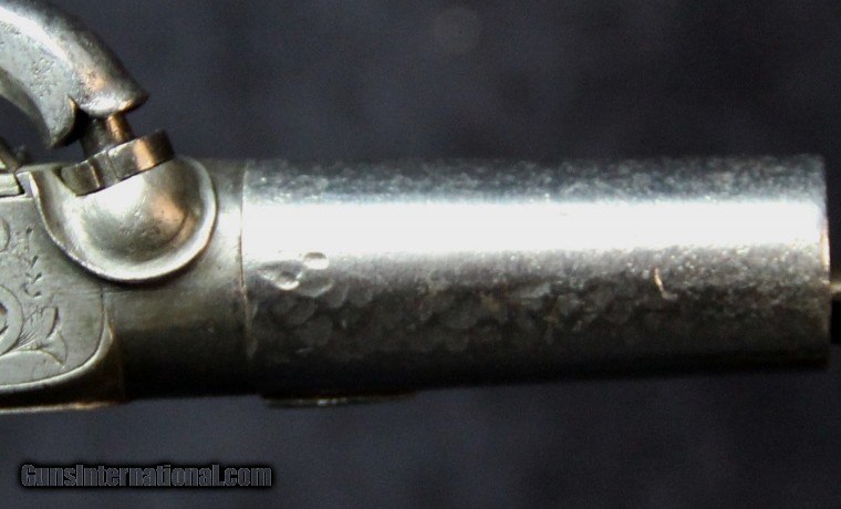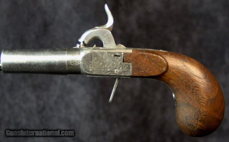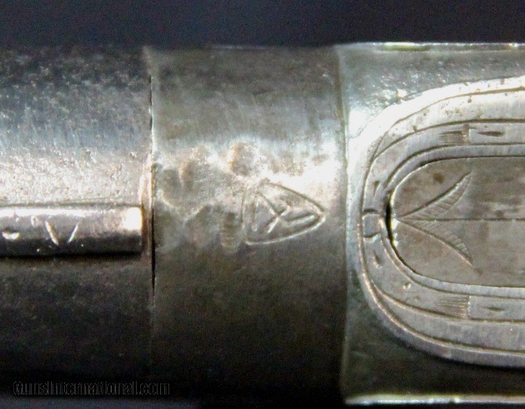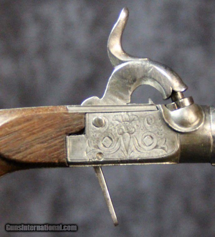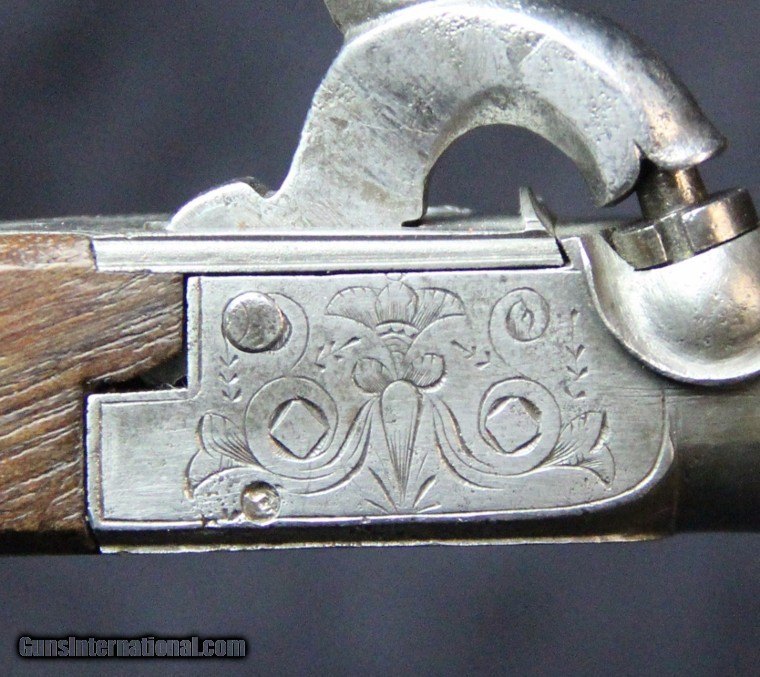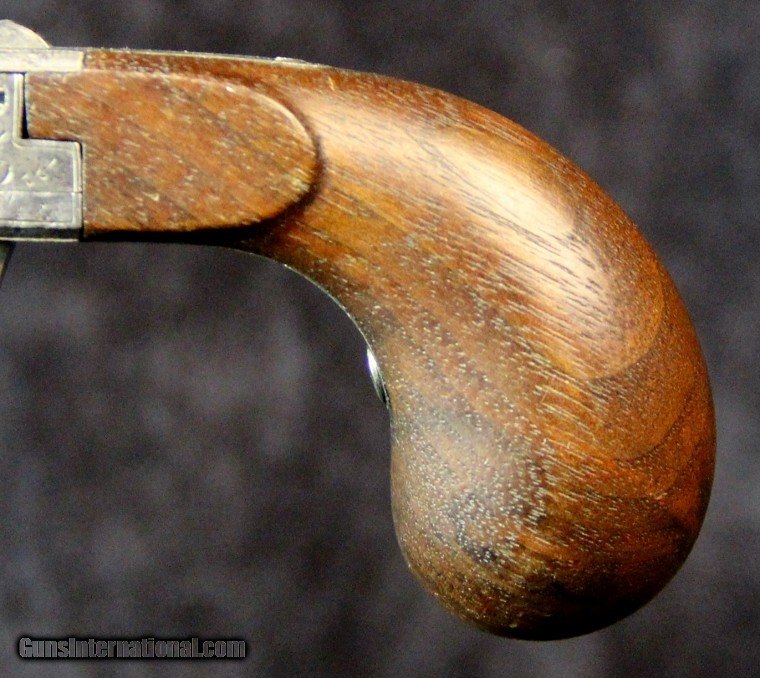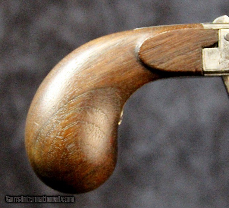 Description: .45 cal, 2 inch screw off barrel, silver gray finish, 1 piece "Bag" butt, engraved, 1850's. Condition: smooth bore has black powder oxidation, metal surfaces smooth even silver gray, grips have shrunk slightly, excellent mechanically, very good marks. SOLD Antique: Yes |