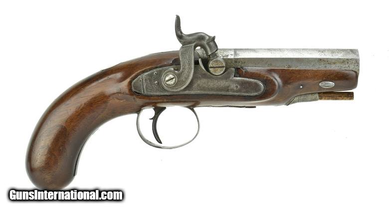 British Percussion Pistol by Bishop & Tonks. Made circa 1830. .65 Caliber with a 4” barrel. Nice sharp gun with a gray patina that has scattered pitting. Stock is good with some repairs. Action works well.