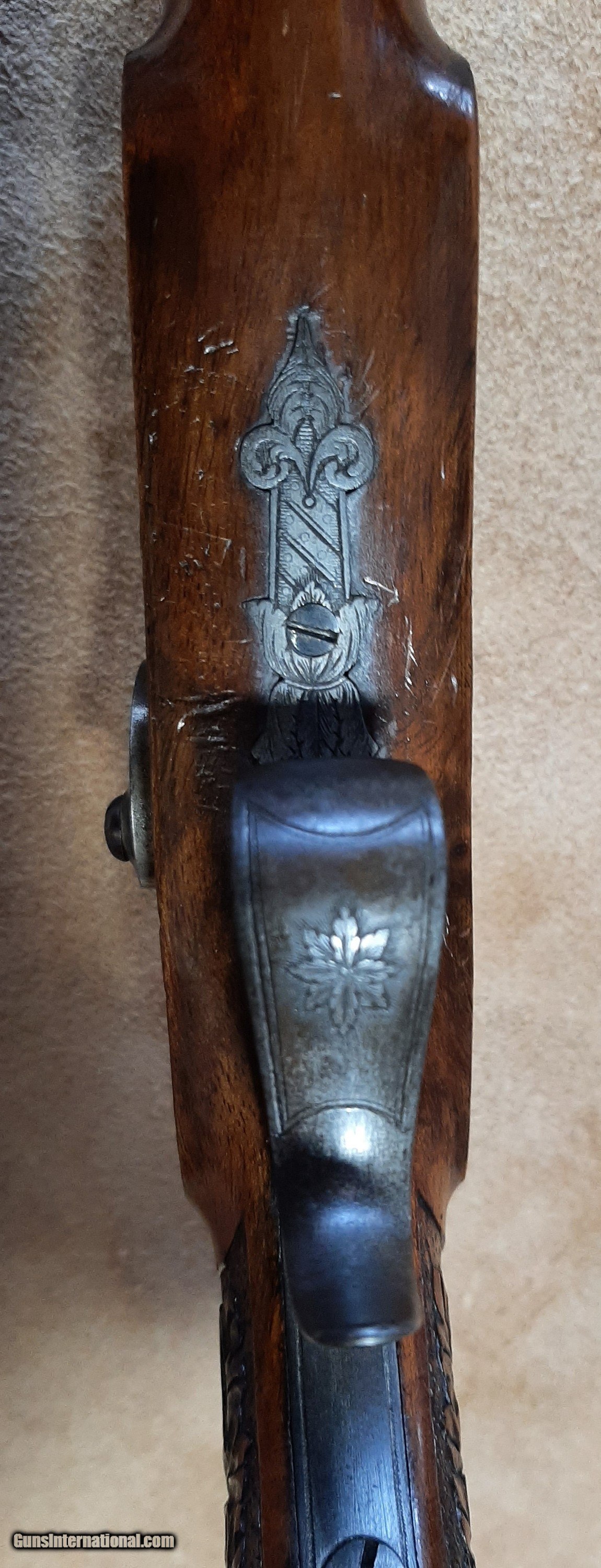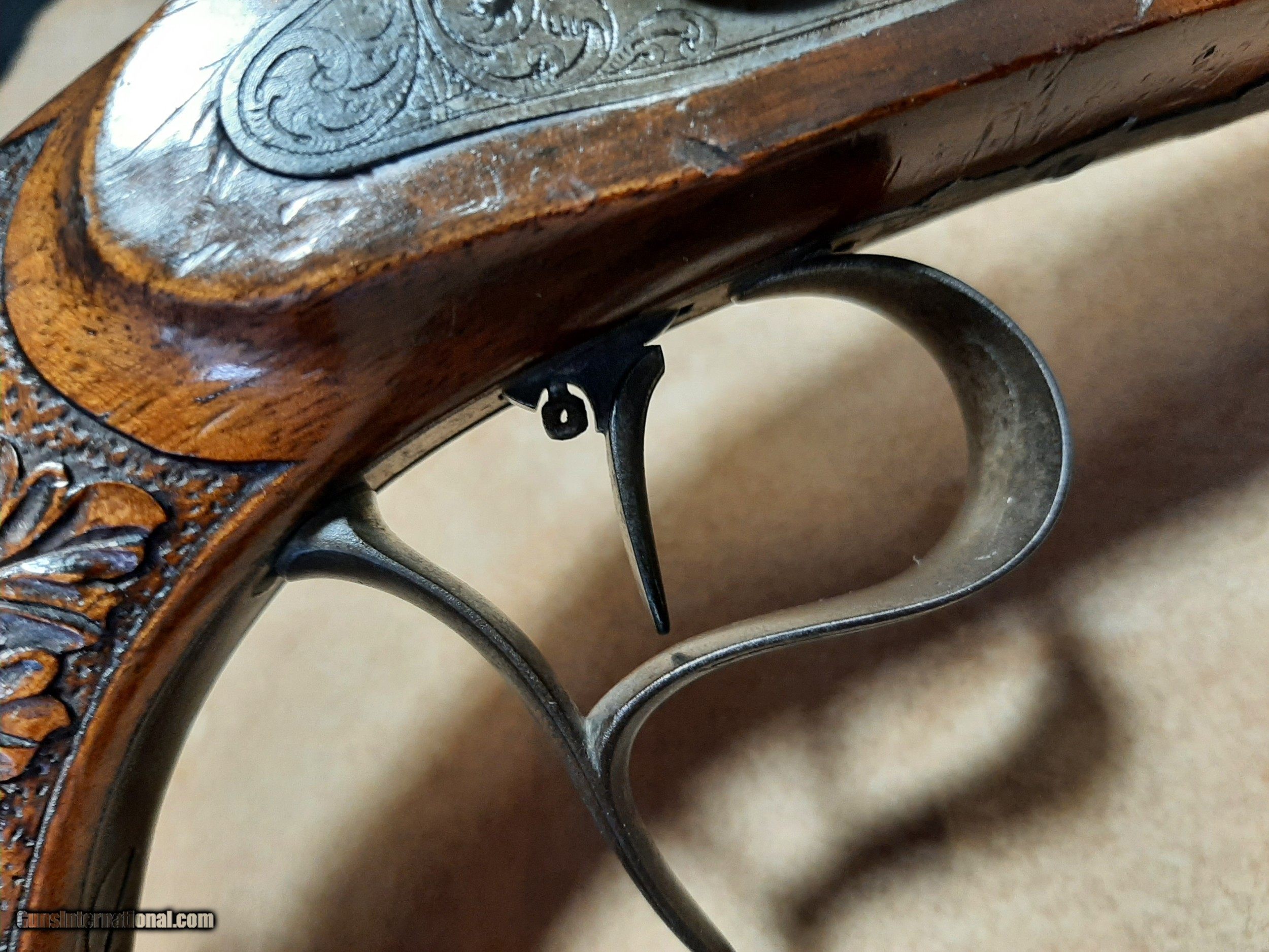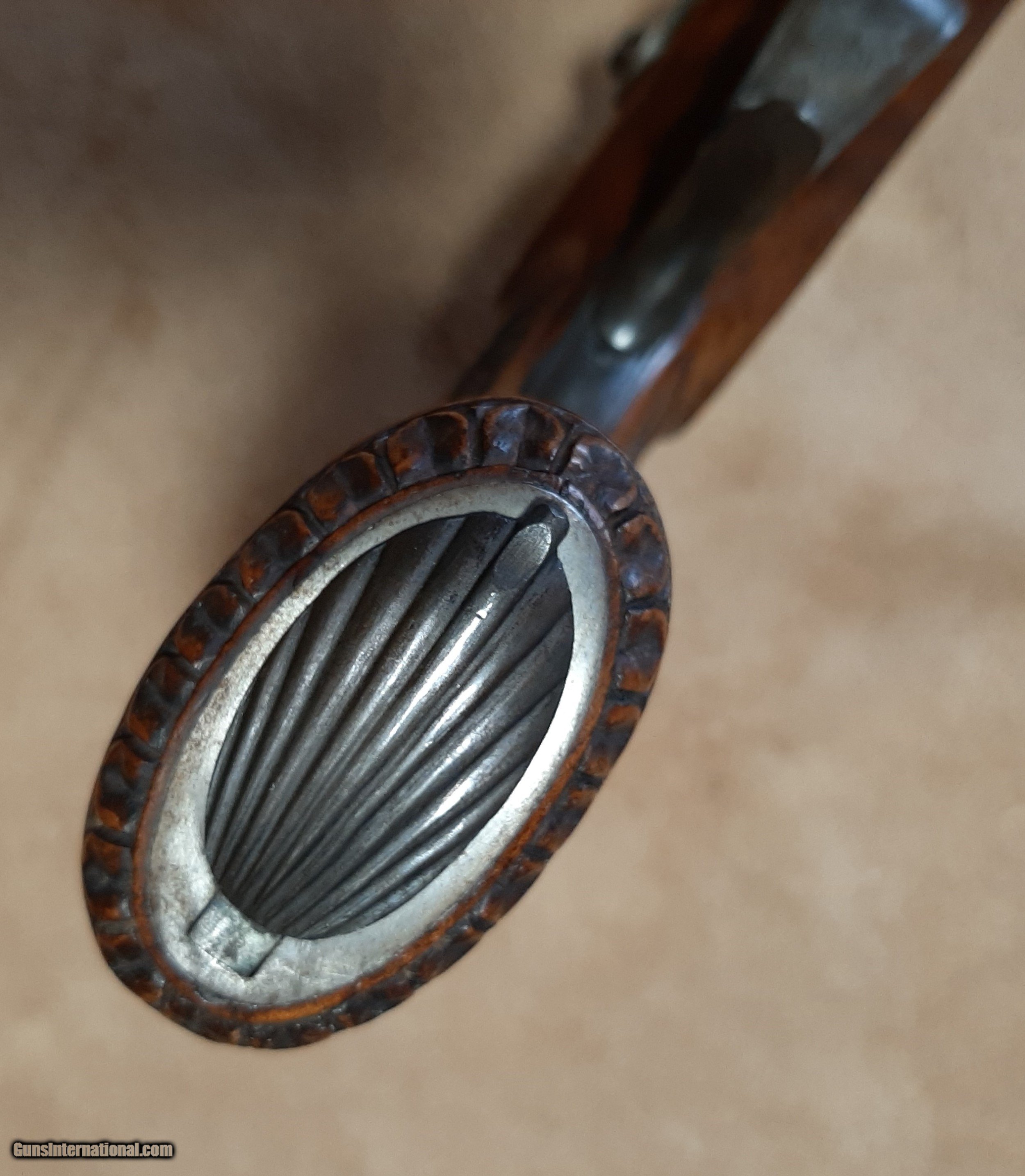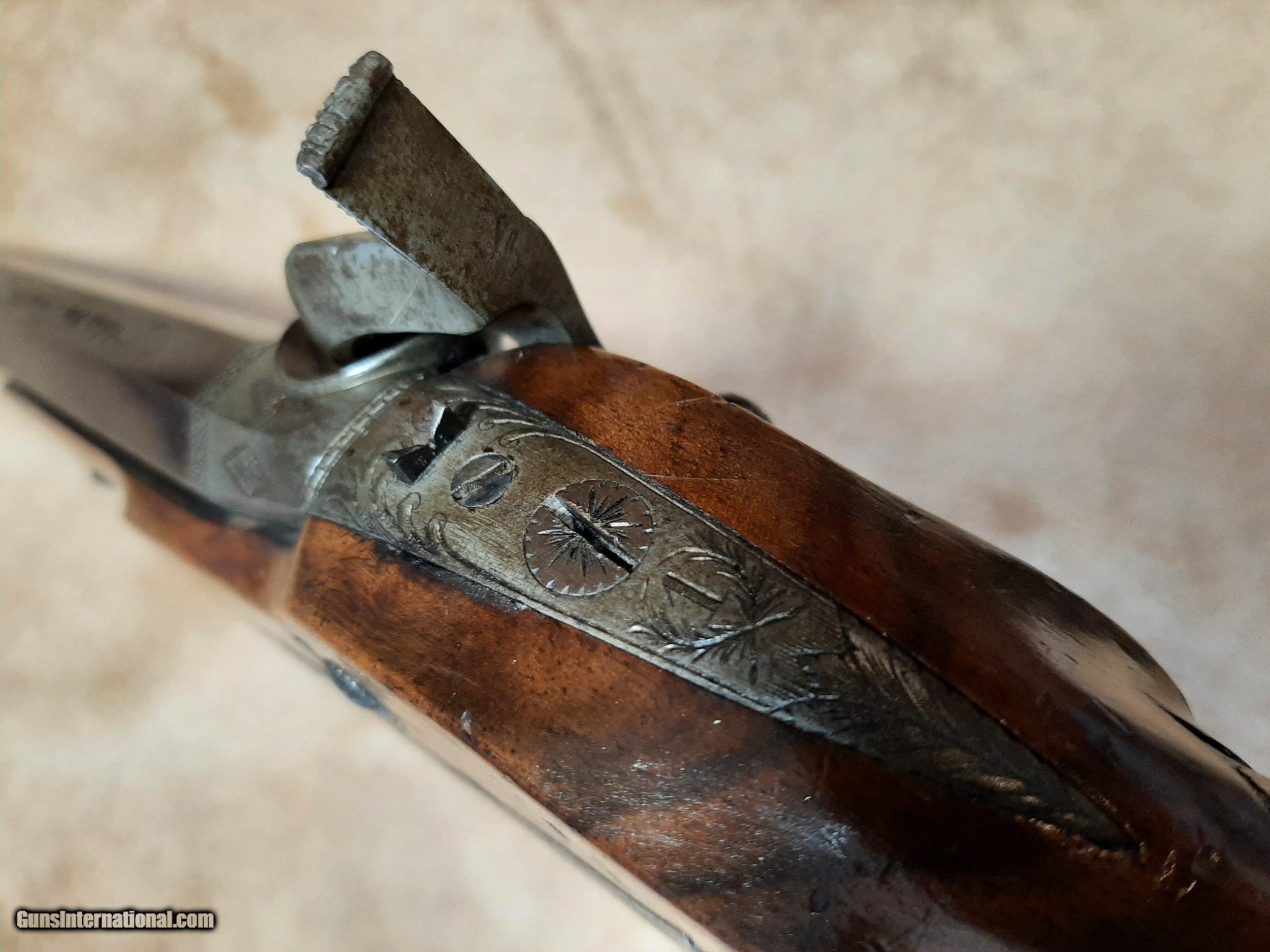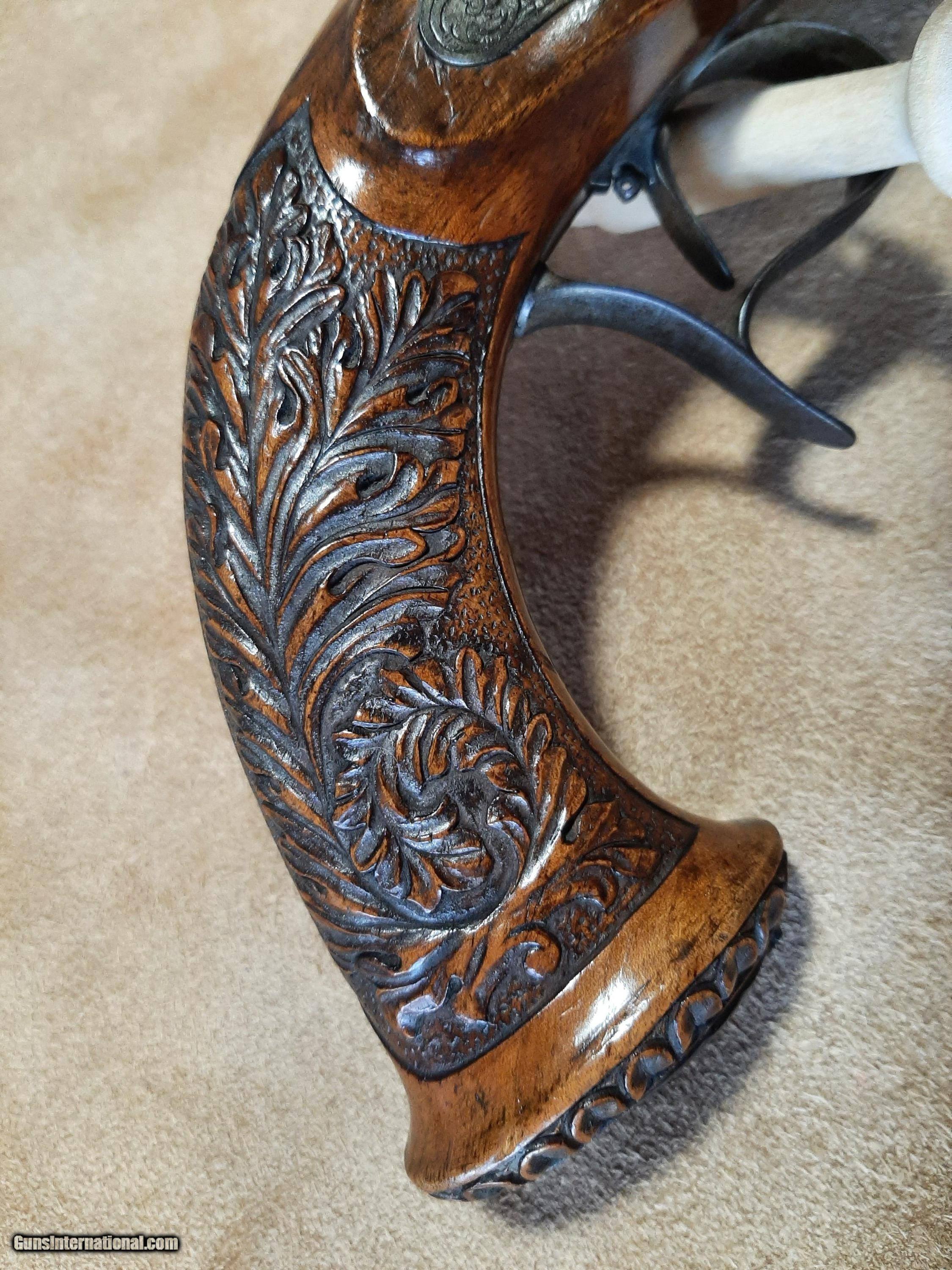 Description: We are pleased to present an extremely rare “Traveler’s” percussion pistol from the mid 1800’s. The piece was designed and built by Carl Pestalozzi and bears his signature on the left silver side-plate. Mr. Pestalozzi was obviously a master craftsman in his gun-making abilities as exhibited in this true work of art! Based on his last name one would assume he was Italian! The pistol was marketed in Zurich Switzerland by “Caslimir Wagner” which was one of Europe’s leading firearms dealers comparable to Abercrombie & Fitch in the US. The top of the barrel is signed “Zurich” and dated 1850 by Caslimir Wagner. This is most likely as mint as you could expect to find a piece of 1850! The leaf carved furniture is absolutely exquisite. The action is crisp as new and features an adjustable trigger pull. The bore is .44 cal and exhibits strong rifling but needs a good cleaning. The barrel length is 8 1/2” and the overall length is 15”. Features a “V” rear sight and blade front sight. Hardware is pleasantly scroll engraved and retains a rich patina of almost 175 years of the aging process. I consider myself to be very particular and can’t really find anything to pick at on this piece. With the purchase of this piece you will most likely own “one of a kind” pistol. Pre 98’ arms are skyrocketing in value because of their unique designs, quality of construction and rarity. Once they are absorbed in the collector’s market they are basically “GONE”. Hard assets are the wave of the future. Being a antique it will require no ATF paper work for the transaction. For payment I will accept personal checks, money orders, certified check or cashiers’ check, all major credit cards. Credit cards are acceptable with a 4% up-charge for processing. Personal checks require 8 business days to clear the bank, all other forms of payment receive same day as received shipment. Price includes Registered USP shipping and will be fully insured. You are responsible for any state and local laws. By purchase of this item, you release the seller from any liability that may arise due to use or misuse of this firearm. Thanks for looking and if you have any questions give me a call or text 931-303-6739. Thank you for your time and attention to our products. We are pleased to present an extremely rare “Traveler’s” percussion pistol from the mid 1800’s. The piece was designed and built by Carl Pestalozzi and bears his signature on the left silver side-plate. Mr. Pestalozzi was obviously a master craftsman in his gun-making abilities as exhibited in this true work of art! Based on his last name one would assume he was Italian! The pistol was marketed in Zurich Switzerland by “Caslimir Wagner” which was one of Europe’s leading firearms dealers comparable to Abercrombie & Fitch in the US. The top of the barrel is signed “Zurich” and dated 1850 by Caslimir Wagner. This is most likely as mint as you could expect to find a piece of 1850! The leaf carved furniture is absolutely exquisite. The action is crisp as new and features an adjustable trigger pull. The bore is .44 cal and exhibits strong rifling but needs a good cleaning. The barrel length is 8 1/2” and the overall length is 15”. Features a “V” rear sight and blade front sight. Hardware is pleasantly scroll engraved and retains a rich patina of almost 175 years of the aging process. I consider myself to be very particular and can’t really find anything to pick at on this piece. With the purchase of this piece you will most likely own “one of a kind” pistol. Pre 98’ arms are skyrocketing in value because of their unique designs, quality of construction and rarity. Once they are absorbed in the collector’s market they are basically “GONE”. Hard assets are the wave of the future. Being a antique it will require no ATF paper work for the transaction. For payment I will accept personal checks, money orders, certified check or cashiers’ check, all major credit cards. Credit cards are acceptable with a 4% up-charge for processing. Personal checks require 8 business days to clear the bank, all other forms of payment receive same day as received shipment. Price includes Registered USP shipping and will be fully insured. You are responsible for any state and local laws. By purchase of this item, you release the seller from any liability that may arise due to use or misuse of this firearm. Thanks for looking and if you have any questions give me a call or text 931-303-6739. Thank you for your time and attention to our products. SOLD Antique: Yes Handgun Caliber: .44 Manufacturer: Carl Pestalozzi Model: 1850 Serial Number: None Barrel Length: 8.5 Bore: .44 Condition: Minty Metal Condition: Excellent Wood Condition: Perfect Bore Condition: Very Good Action: Perfect Triggers: Adjustable Manufacture Date: 1850 Engraving: Superb Extras: Wood Carved & Metals Engraved Item Location: Tennessee USA |