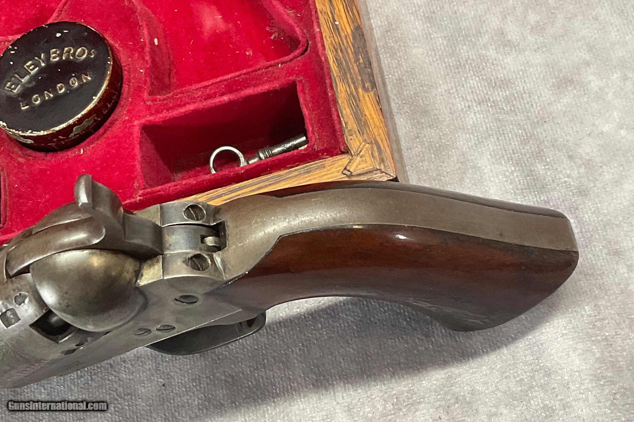 CASED FRENCH FITTED 1849 POCKET COLT with LONDON ADDRESS IRON BACK STRAP and TRIGGER GUARD #10215 METAL POWDER FLASK
