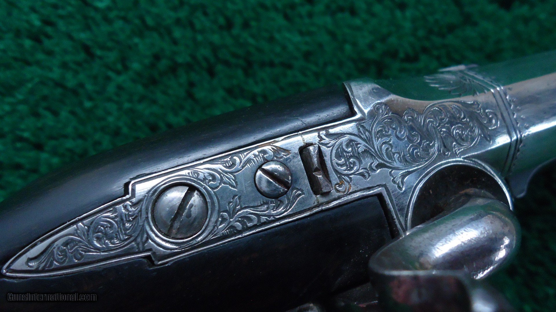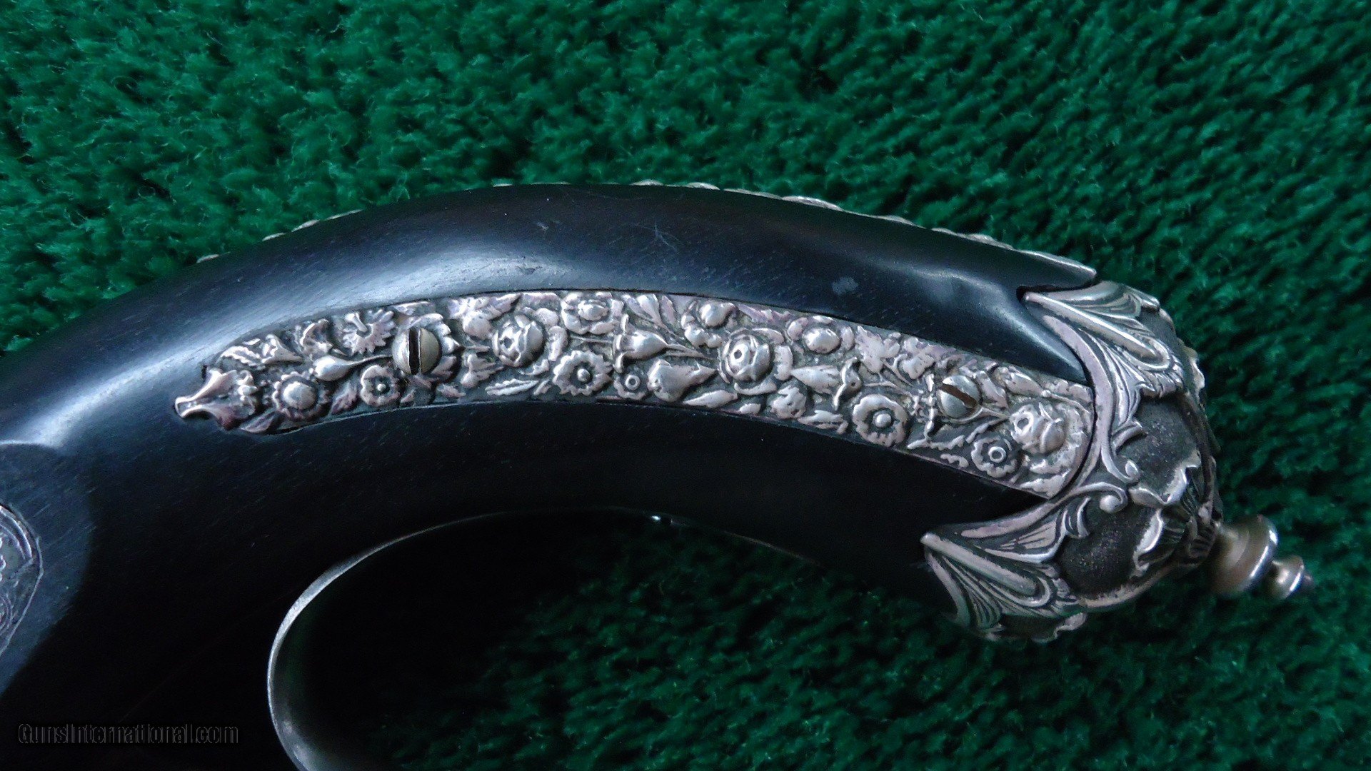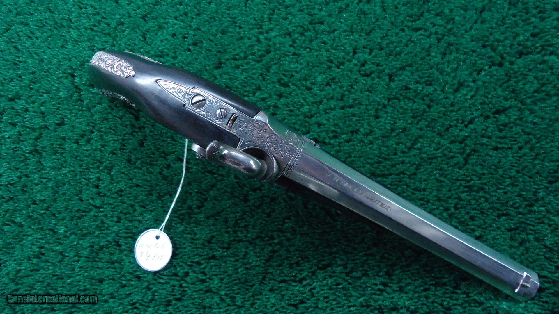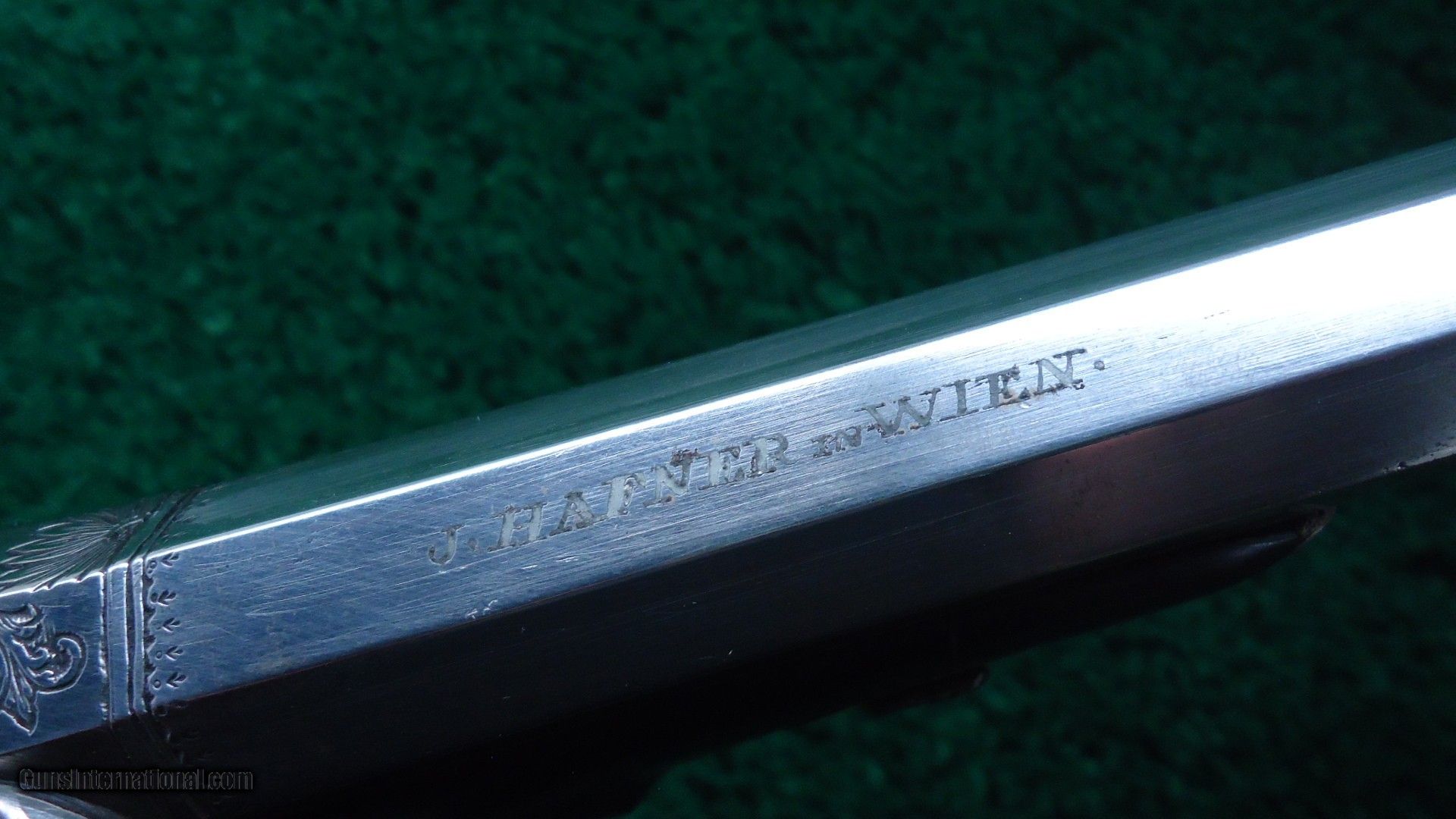 Description: The top barrel flat is marked "J. HAFNER in WIEN." Scroll engraving is featured on the breech plug, barrel tang, hammer and lock plate. The spur trigger guard has a border engraving. The silver butt-cap has an ornate chiseled engraved pattern. Traces of case color on the trigger guard. Action works fine. Bore is heavily rifled. The sides and top of the grip have strips of silver that feature a chiseled floral pattern. The leather bound case is lined with red velvet and contains all the accoutrements. This is a very decorative piece. Leroy Merz Antique Firearms specializes in antique and vintage Winchesters and other fine American firearms. Since 1965 Mr. Merz has taken part in the world of firearms and has been a contributor to many well known reference books. We have hundreds of additional guns in every price range at our home online. Search for Merz Antiques in google. SOLD Antique: Yes |
