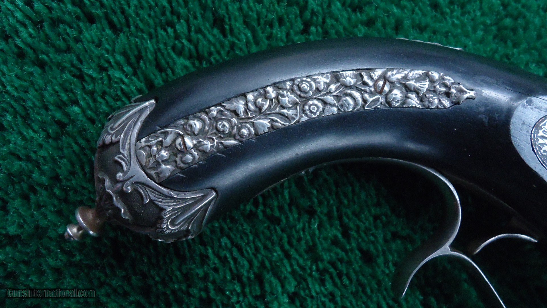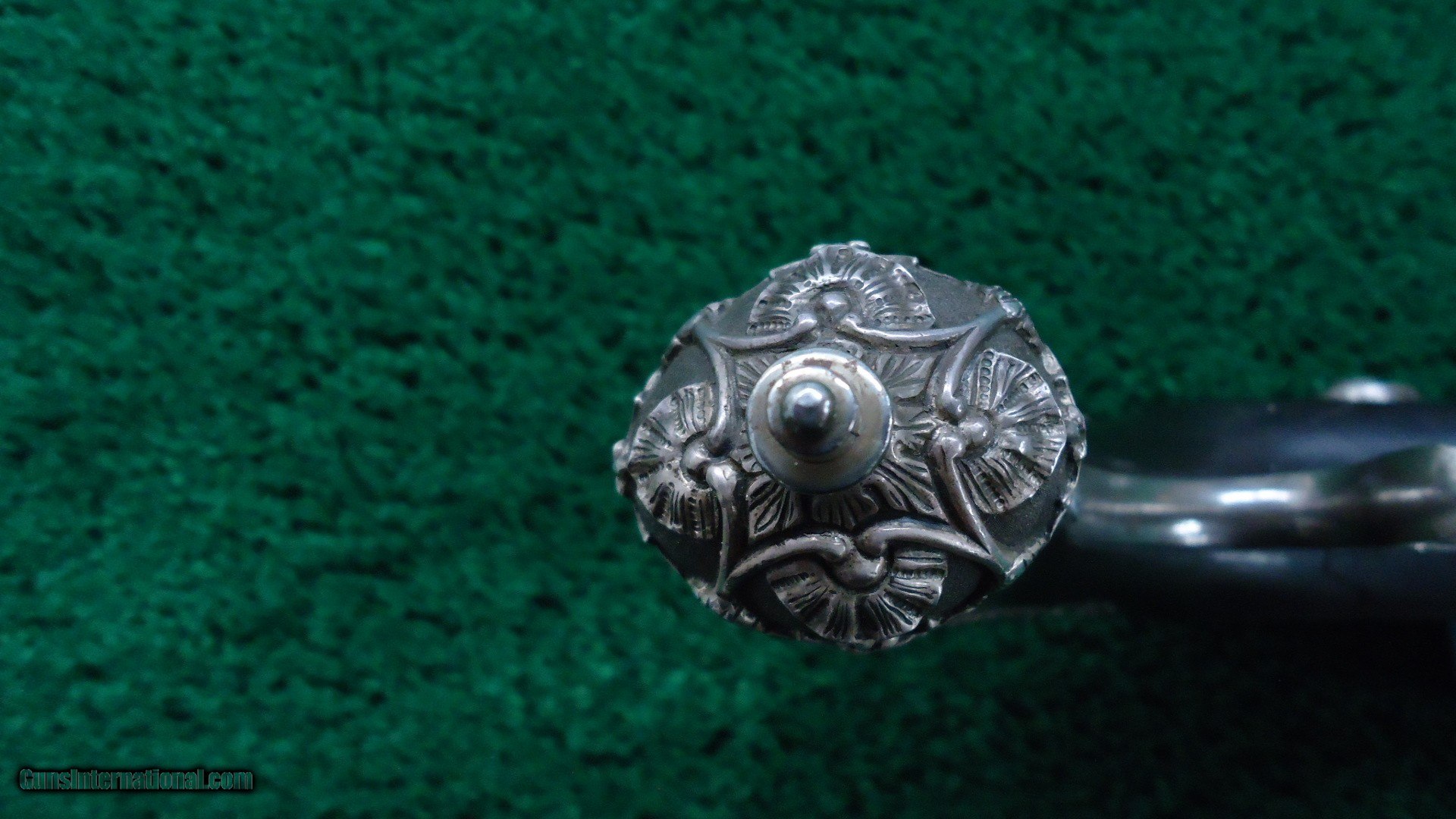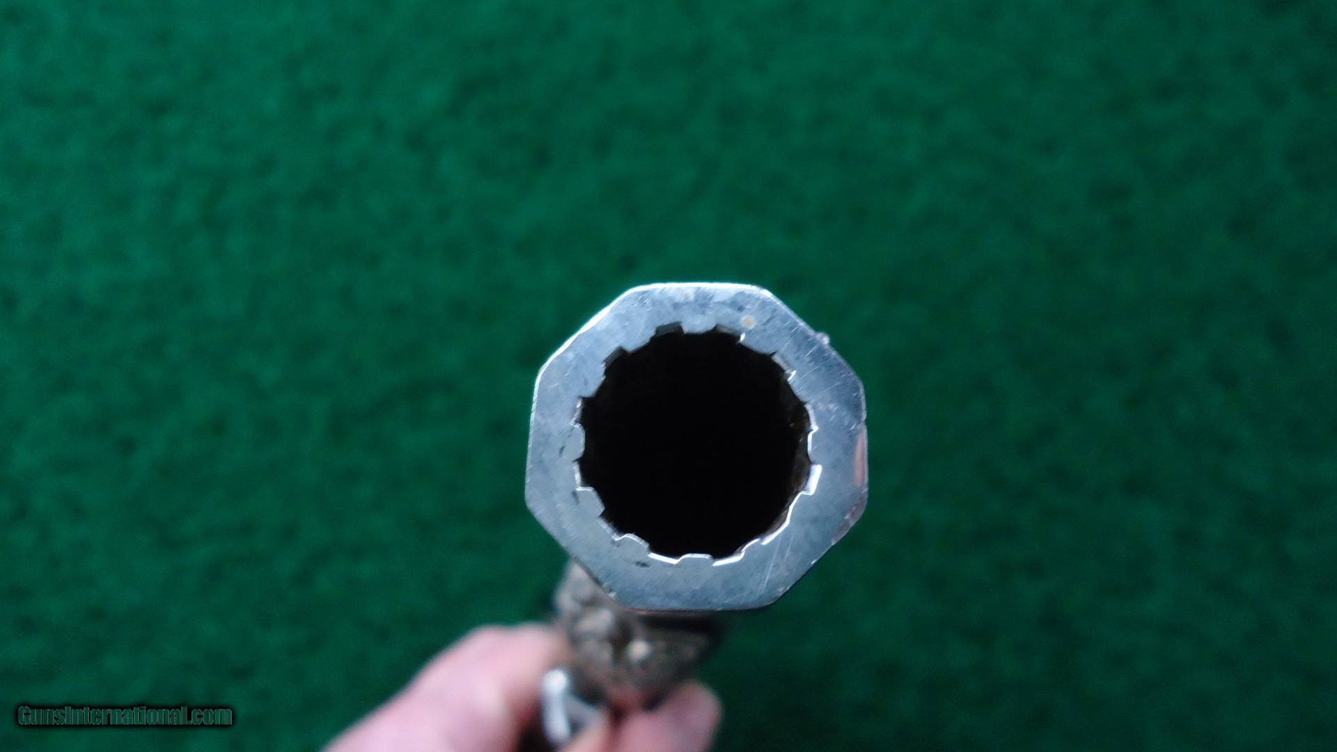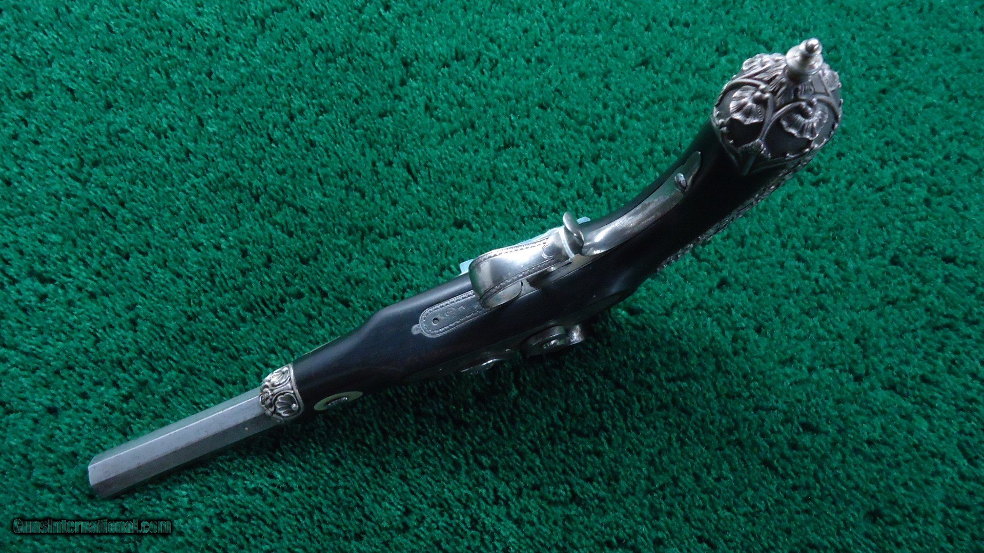 Description: The top barrel flat is marked "J. HAFNER in WIEN." Scroll engraving is featured on the breech plug, barrel tang, hammer and lock plate. The spur trigger guard has a border engraving. The silver butt-cap has an ornate chiseled engraved pattern. Traces of case color on the trigger guard. Action works fine. Bore is heavily rifled. The sides and top of the grip have strips of silver that feature a chiseled floral pattern. The leather bound case is lined with red velvet and contains all the accoutrements. This is a very decorative piece. Leroy Merz Antique Firearms specializes in antique and vintage Winchesters and other fine American firearms. Since 1965 Mr. Merz has taken part in the world of firearms and has been a contributor to many well known reference books. We have hundreds of additional guns in every price range at our home online. Search for Merz Antiques in google. SOLD Antique: Yes |