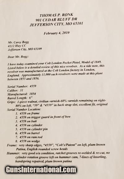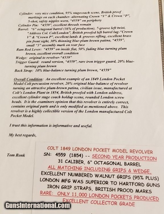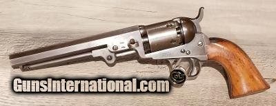 Description: See photos for full details on the revolver. The case is missing the 6" cleaning rod. Someone included a 4" brass (should be steel) rod similar to the correct rod except its handle is completely round rather than flat on one side to fit the case). Non-firing, non-disassembly, 3-day inspection return for a full refund less shipping/ins costs. $3,695.00 plus shipping/Ins via the carrier of your choice. SOLD Antique: Yes Handgun Caliber: .31 |