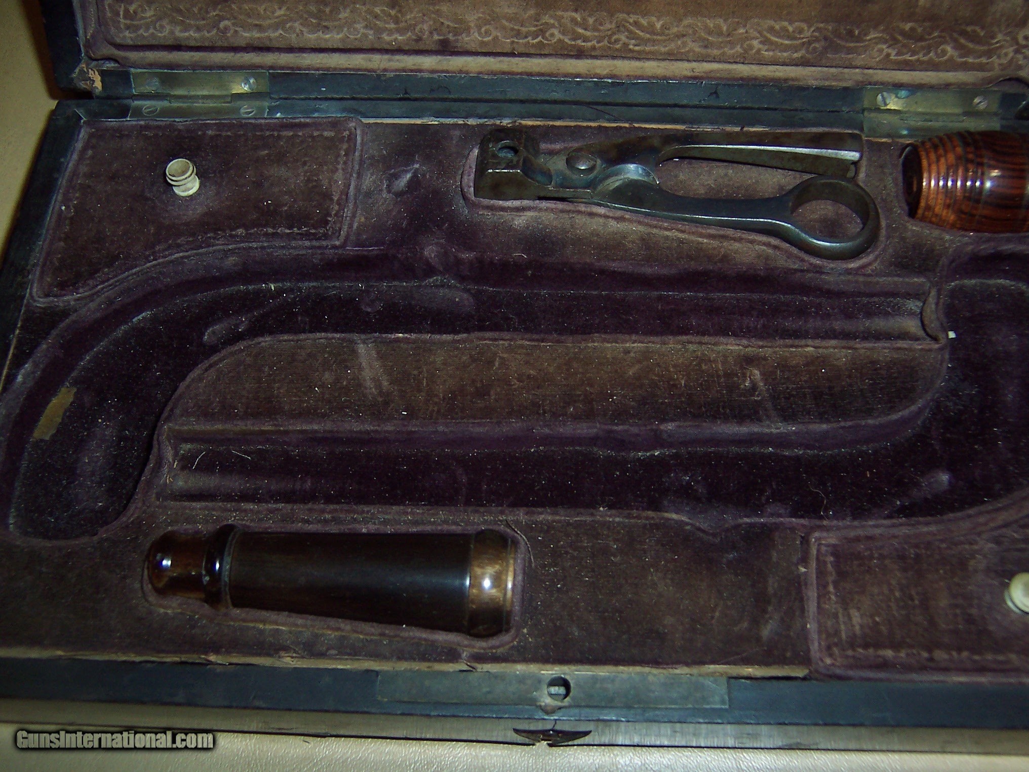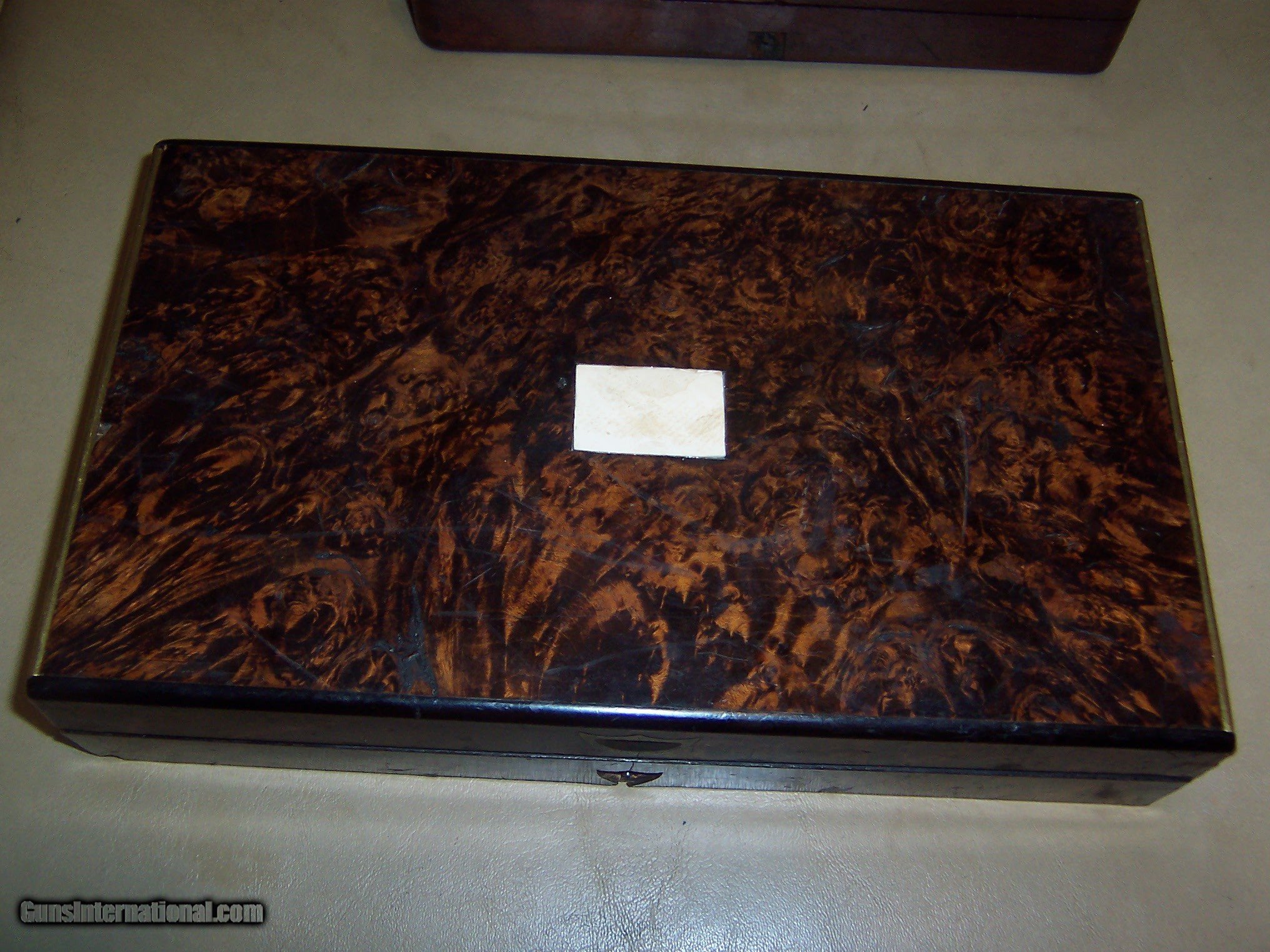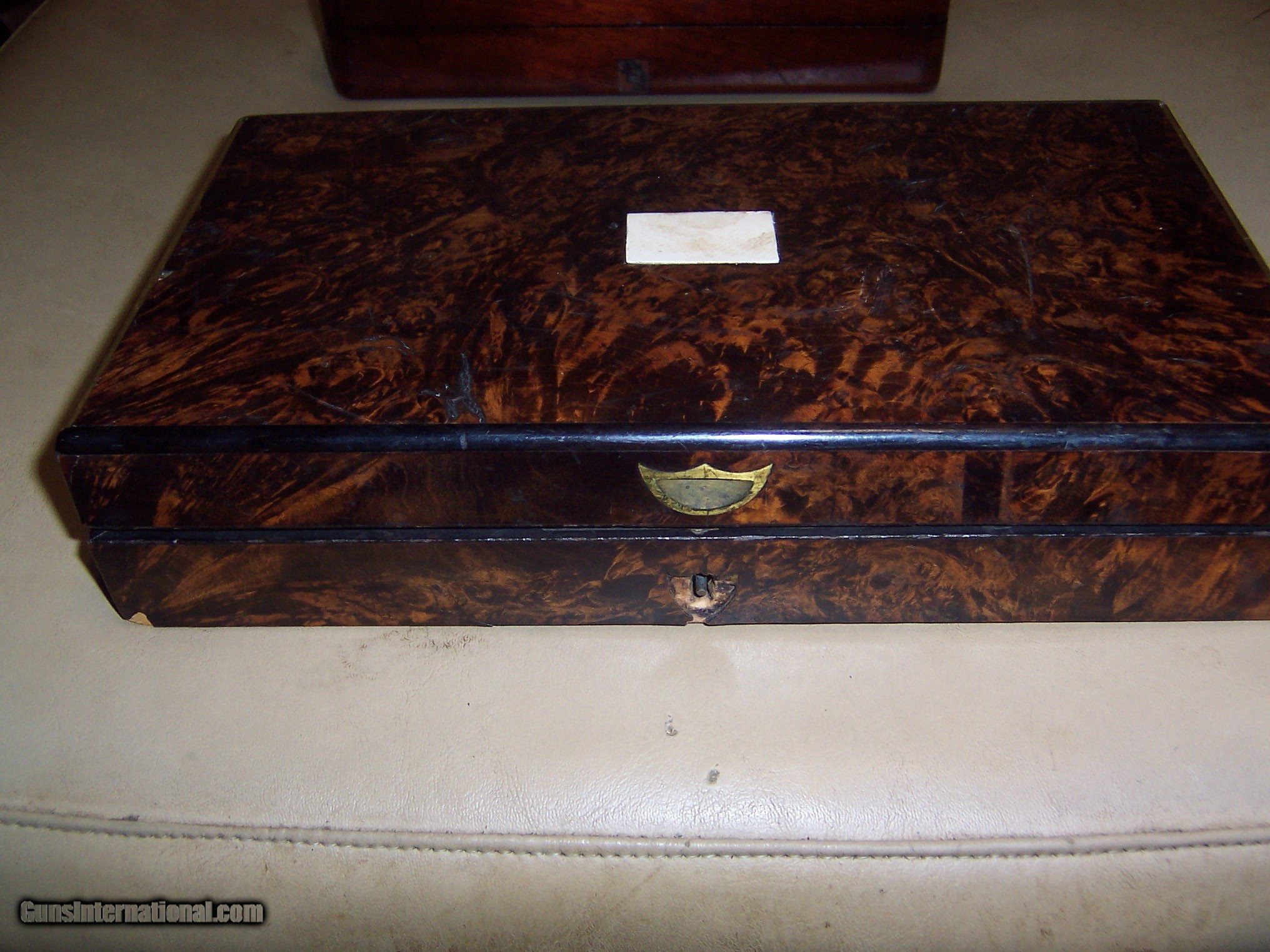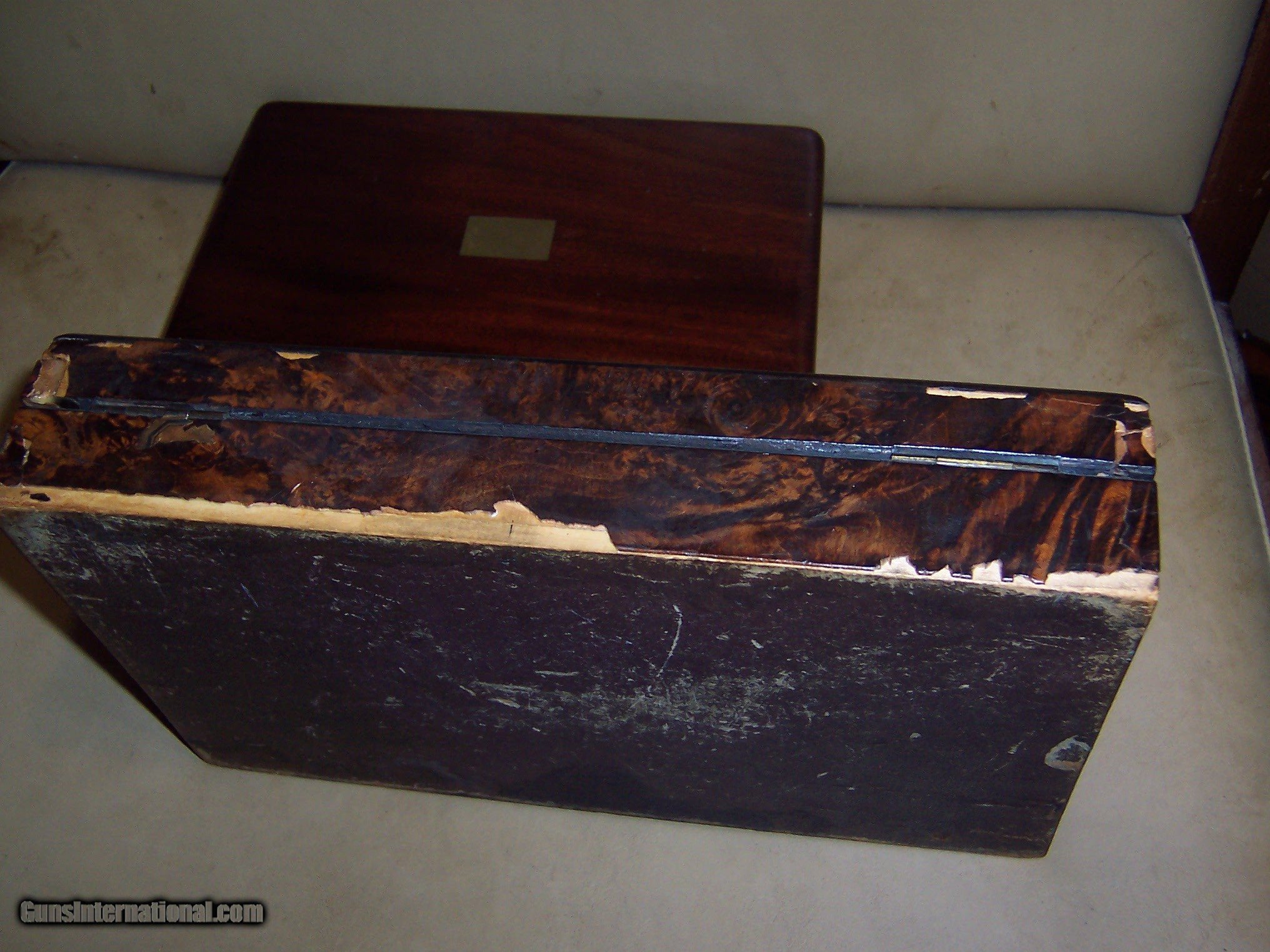 Description: 4 inch smooth bore pistols // 8 inches oa / case has some lost vernier // nice guns probably french //some traces of case on action and browned damascus barrels//actions cock but triggers dont not come down all the way but still fall with a pull on triggers // there is a key but case wont lock // horn powder flask / wood cap box/ nice looking set // cap box in butt of pistols // looks like 1 screw replaced in 1 pistol// $50 sh SOLD Antique: Yes |