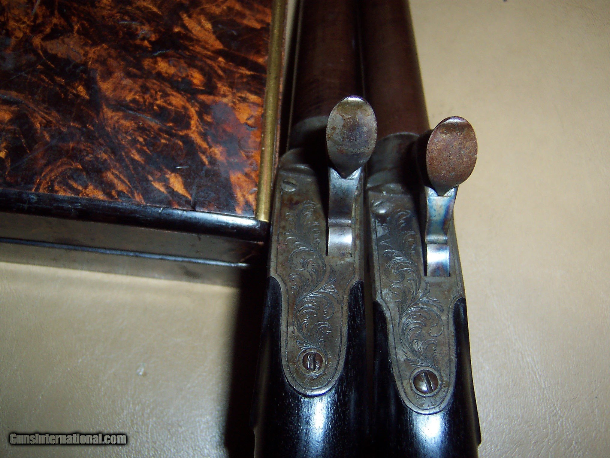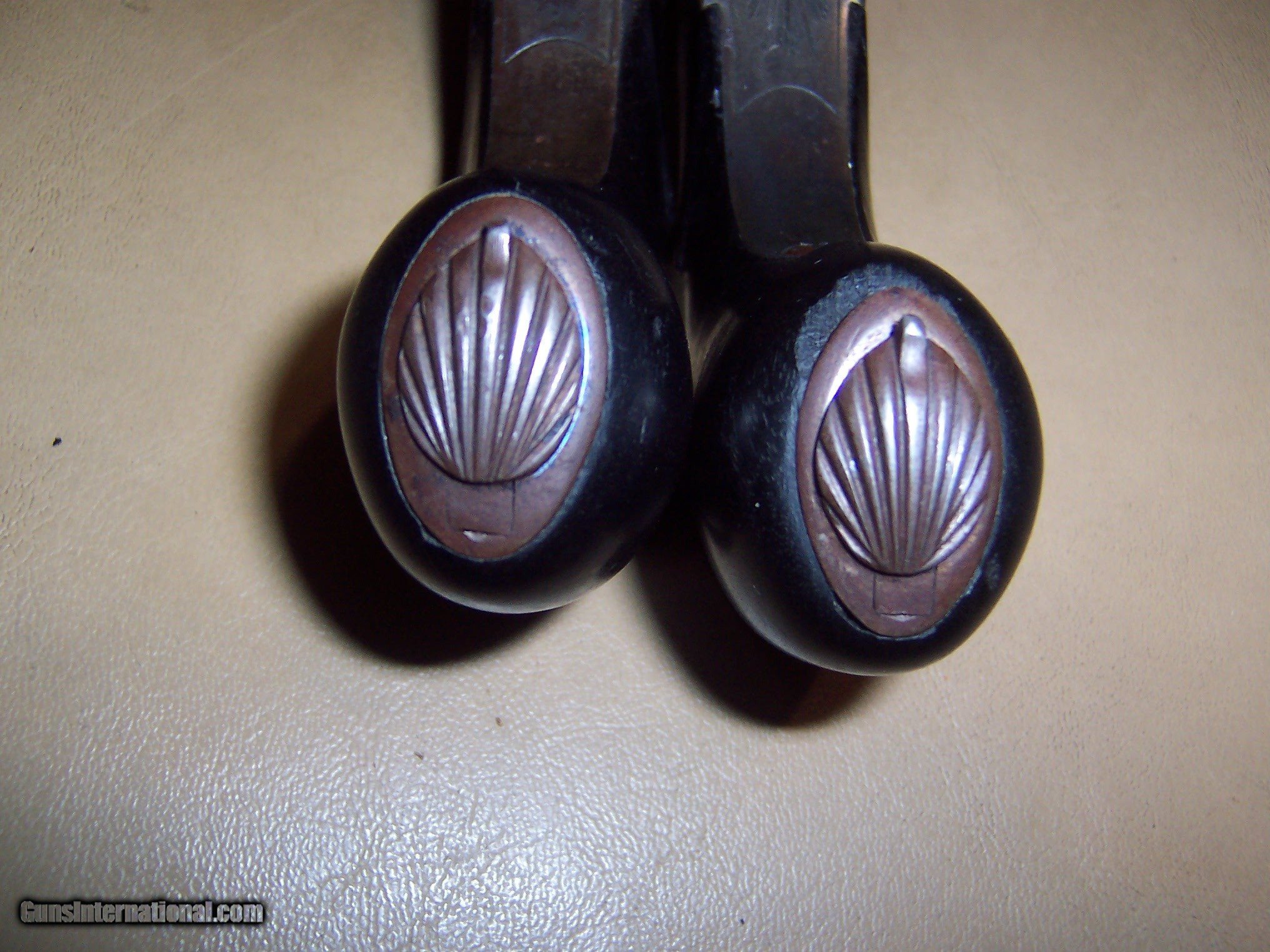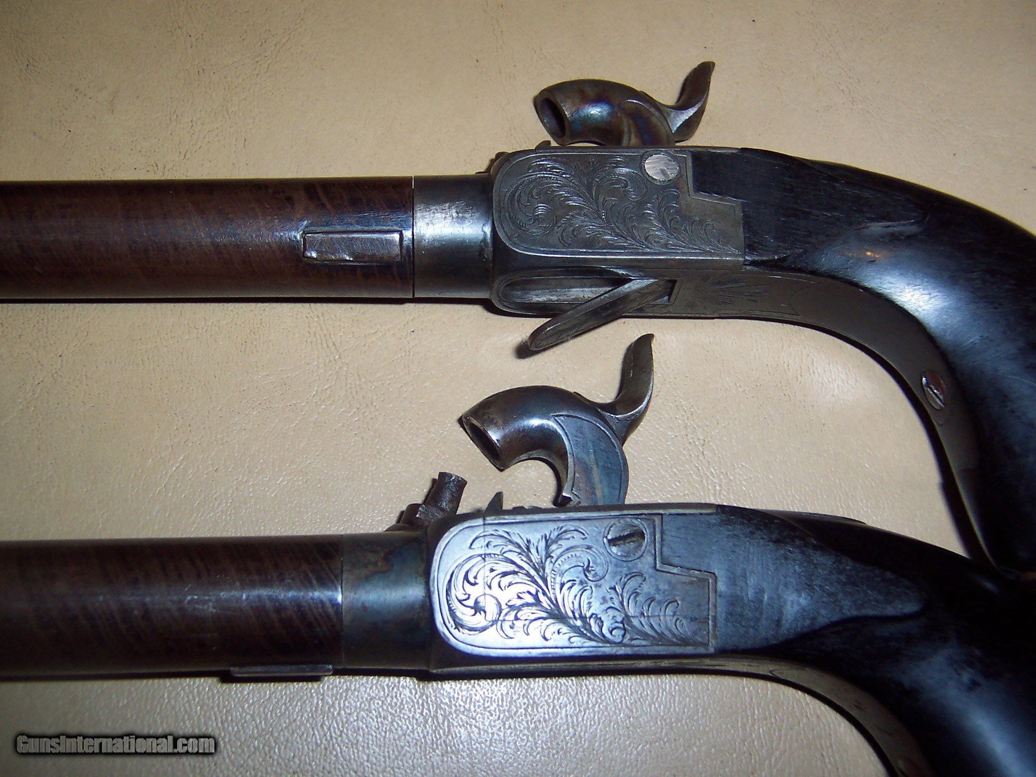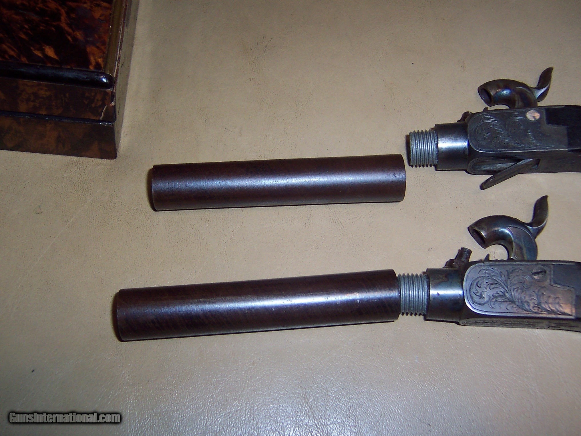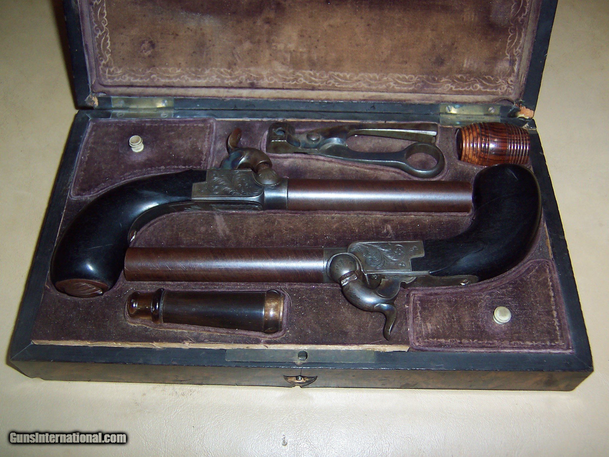Description: 4 inch smooth bore pistols // 8 inches oa / case has some lost vernier // nice guns probably french //some traces of case on action and browned damascus barrels//actions cock but triggers dont not come down all the way but still fall with a pull on triggers // there is a key but case wont lock // horn powder flask / wood cap box/ nice looking set // cap box in butt of pistols // looks like 1 screw replaced in 1 pistol// $50 sh SOLD Antique: Yes |