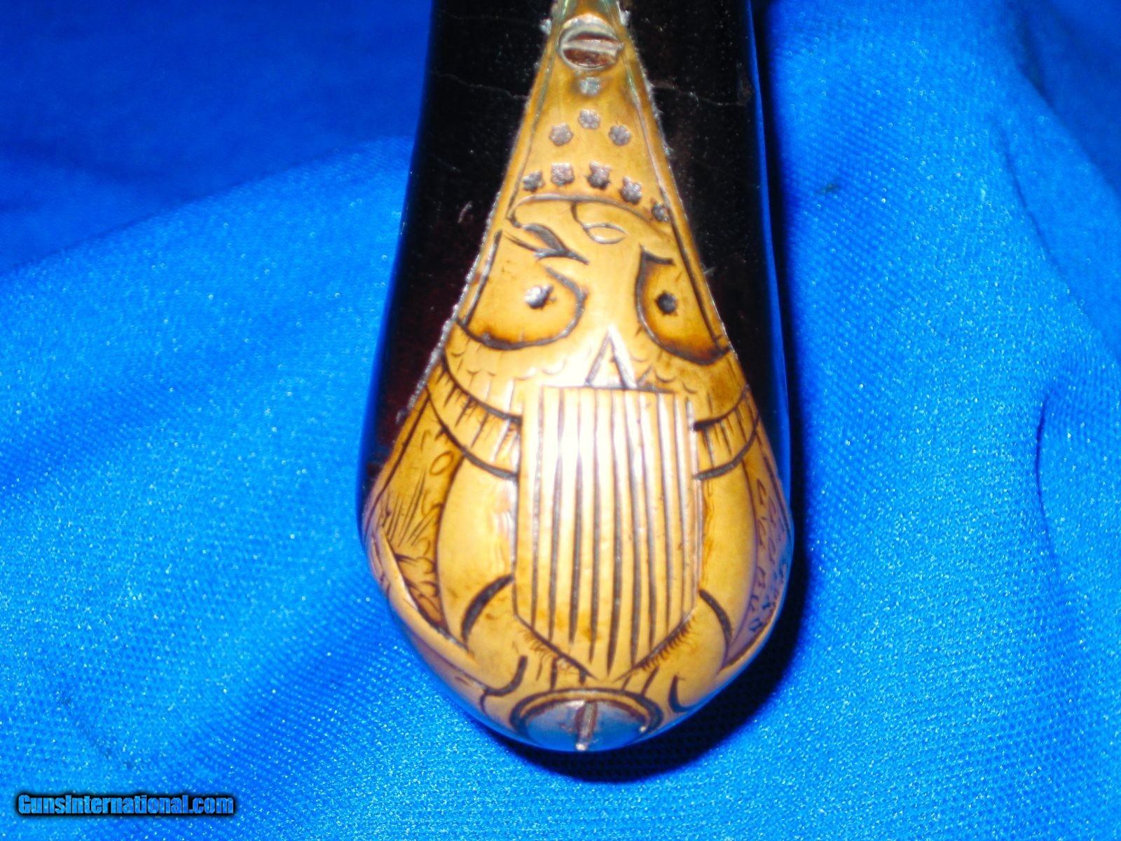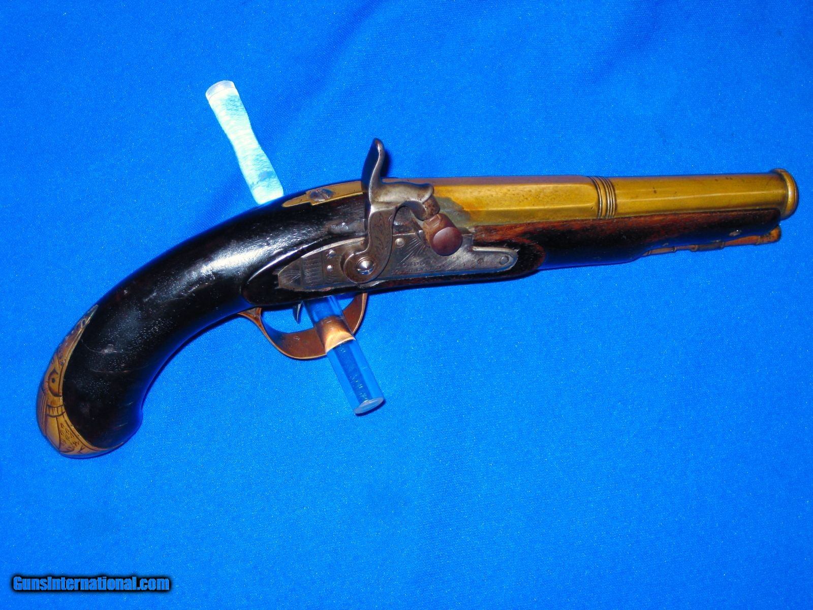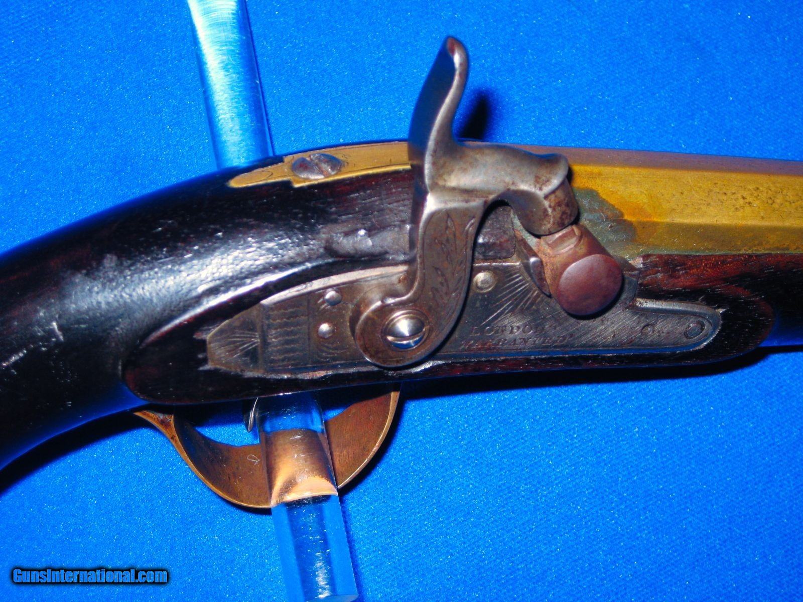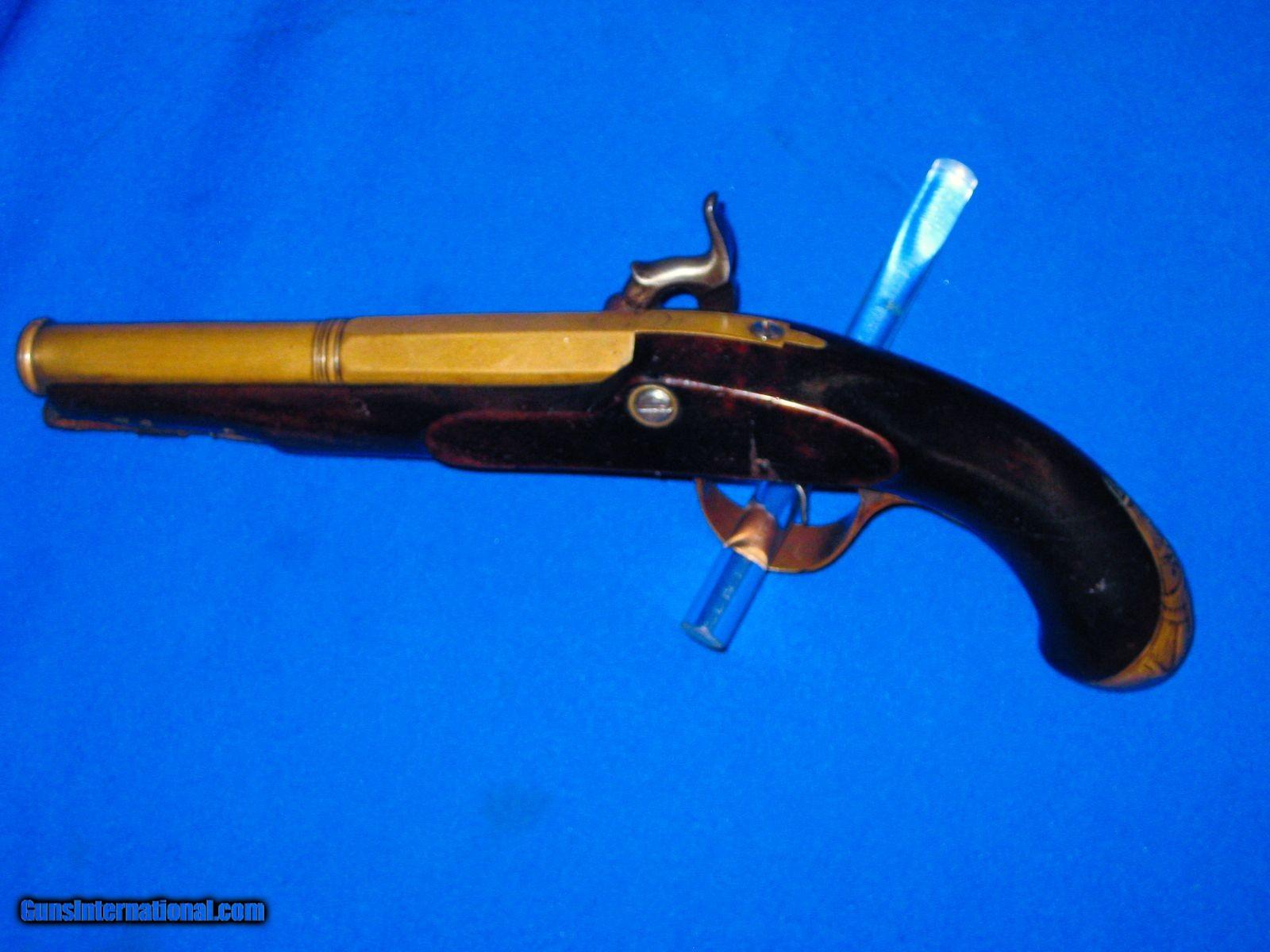 Description: A Very rare Civil War American made "Halbach & Sons, Baltimore" Single Shot Brass Barreled Percussion Pistol With A Brass Eagle & Shield Butt Plate In Fine Untouched Condition. All original and complete. The rare pistol has a fine brass cannon muzzle end on the barrel, a brass eagle & shield butt plate, a brass trigger guard, and two brass finials holding the brass tipped ramrod. The engraved lock and hammer were imported by "Halbach & Sons" and are marked "LONDON/WARRANTED". All of the brass & iron on the pistol are fine and untouched with a nice even patina on them. The Brass Eagle & Shield Butt Plate were a trade mark Of "HALBACH & SONS". The wood on the pistol is fine throughout with a wonderful natural dark color to it. The pistol has a fine action in it. The pistol measures 12 inches in length and has a 7 inch barrel on it. This Is A Very Fine Example Of A Very Early & Scarce "Halbach & Sons" Civil War Single Shot Brass Cannon Barreled Pistol. These Percussion Pistols Are Very Hard To Come By! DISCLAIMER: All firearms are sold as collector’s items only – we did not accept responsibility as to the shooting safety or reliability of any antique firearm. All firearms as described as accurately as possible, given the restraints of a catalog listing length. We want satisfied customers and often under describe the weapons. Any city or state regulations regarding owning antique firearms are the responsibility of the purchaser. All firearms are mechanically perfect unless noted, but again are NOT warranted as safe to fire. We do not sell or ship any Antique Guns or Antique Ammo to anywhere in New York State. SOLD Antique: Yes Manufacturer: Halbach & Sons Model: Single Shot Pistol Condition: Fine Untouched Condition |