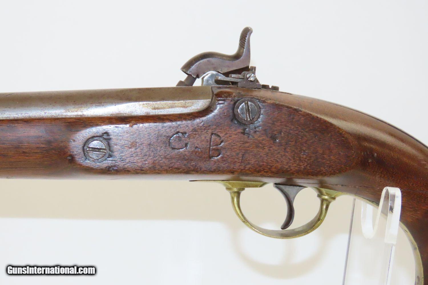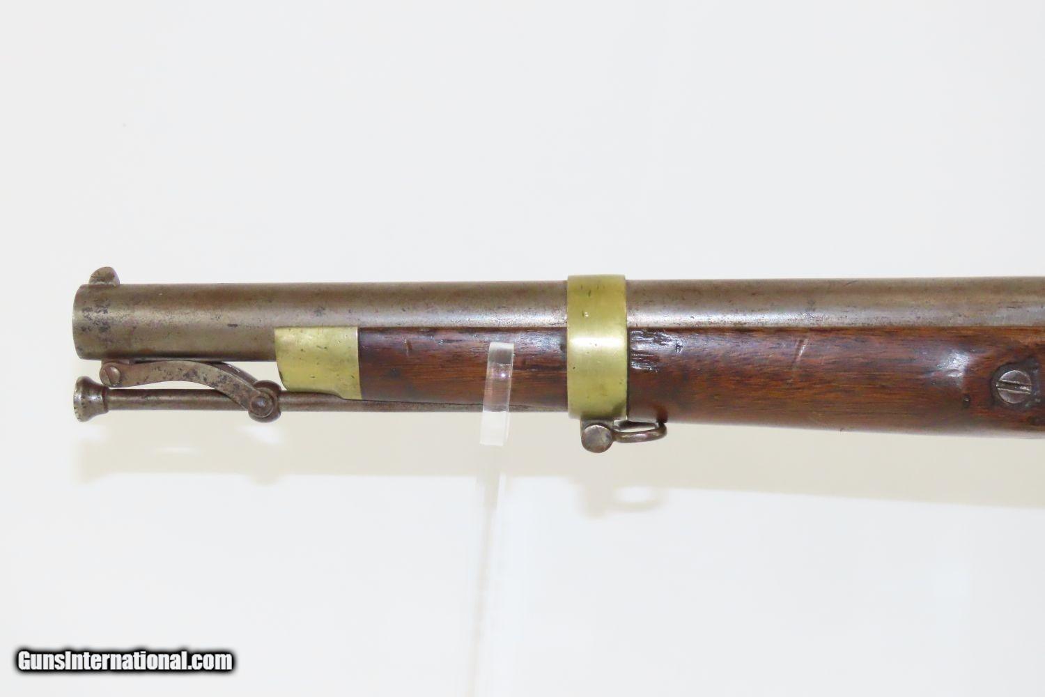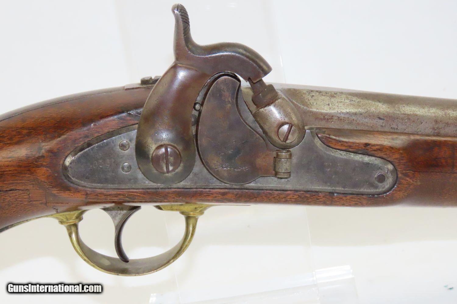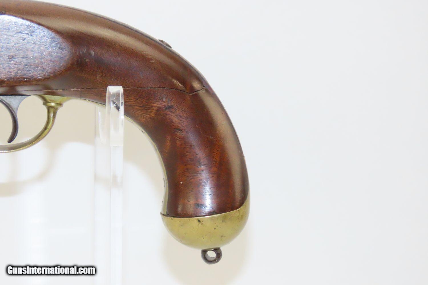 Description: CIVIL WAR Antique US SPRINGFIELD M1855 MAYNARD Percussion Pistol-Carbine 1 of ONLY 4,021 Made at SPRINGFIELD for CAVALRY Here we present an antique Springfield Armory Model 1855 Pistol Carbine, made in the second production year of 1856, five years prior to the outbreak of the American Civil War. Only 4,021 of these were made, making them very rare, especially considering that many would have been lost during the war. The concept was for all U.S. Army troops to have a common caliber, so that logistics would be simplified, and have a (massive) pistol that cavalry could use while mounted, with an attachable stock for use when on foot. The chosen caliber was .58, and it utilized the cutting-edge cone-shaped Minié ball with the hollow base instead of ball. Also, relatively new and short-lived was the Maynard tape priming system, to which Springfield had purchased the rights. Instead of directly priming the nipple by hand for each shot, the user would simply install a roll of paper percussion caps, and a single cap would be exposed, sheared, and carried by the hammer to detonate on the nipple. Of course, the standard rifle percussion caps could also be used. The ramrod is captive on a swivel, so that it was not easily lost in the field, with a hollow tip for pushing the Minié ball. All of these features were included in this compact package to be issued to Cavalry and some Artillery, and it sounded like a brilliant idea. Then U.S. Secretary of War Jefferson Davis (soon to be President of the Confederate States of America) approved the adoption and production of the entire Model 1855 line of rifles, carbines, and pistol carbines. However, reports from the field painted the pistol carbines as rather unwieldy, the tape primer system unreliable, and the carbine stock a detriment to accuracy. By this time, Colt had developed lines of very handy and reliable 6-shot revolvers and a plethora of breech-loading cartridge fed carbines would bring a swift end to production. Nevertheless, these remarkably interesting weapons were very much utilized on both sides during the Civil War and are highly valued in the collector’s market today. The Model 1855 is otherwise distinctive in U.S. Military firearms history for being the last single shot percussion pistol issued, as well as the only pistol other than the Model 1911 made in significant numbers by Springfield Armory. The overall condition is good. The action is strong. The bore is in good shape. There is a crack in the grip of the stock. There is a little movement in this area but it is held by the hardware. The left side of the stock reads “C.B.” while the lock is dated “1856”. The lock is also engraved U.S./SPRINGFIELD”. The barrel tang is dater “1855”. An enormous pistol or a small carbine for the horse soldier in the years leading up to the American Civil War! Own the original! This is a legitimate antique and not a reproduction. Barrel is 12 inches. Caliber: .58 Overall condition as seen in photos. Very Fast. Very Safe. FREE SHIPPING WORLDWIDE. Delivered directly to your door by express mail! Guaranteed AUTHENTIC & Includes CERTIFICATE OF AUTHENTICITY. ancestryguns $1950 #20153 SOLD Antique: Yes |