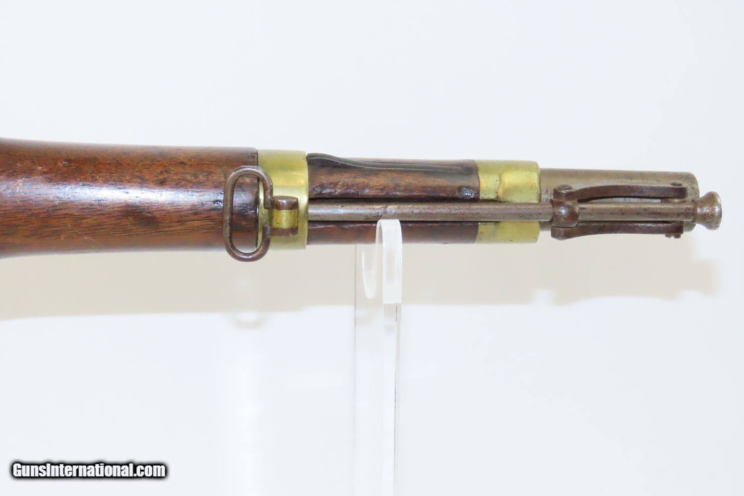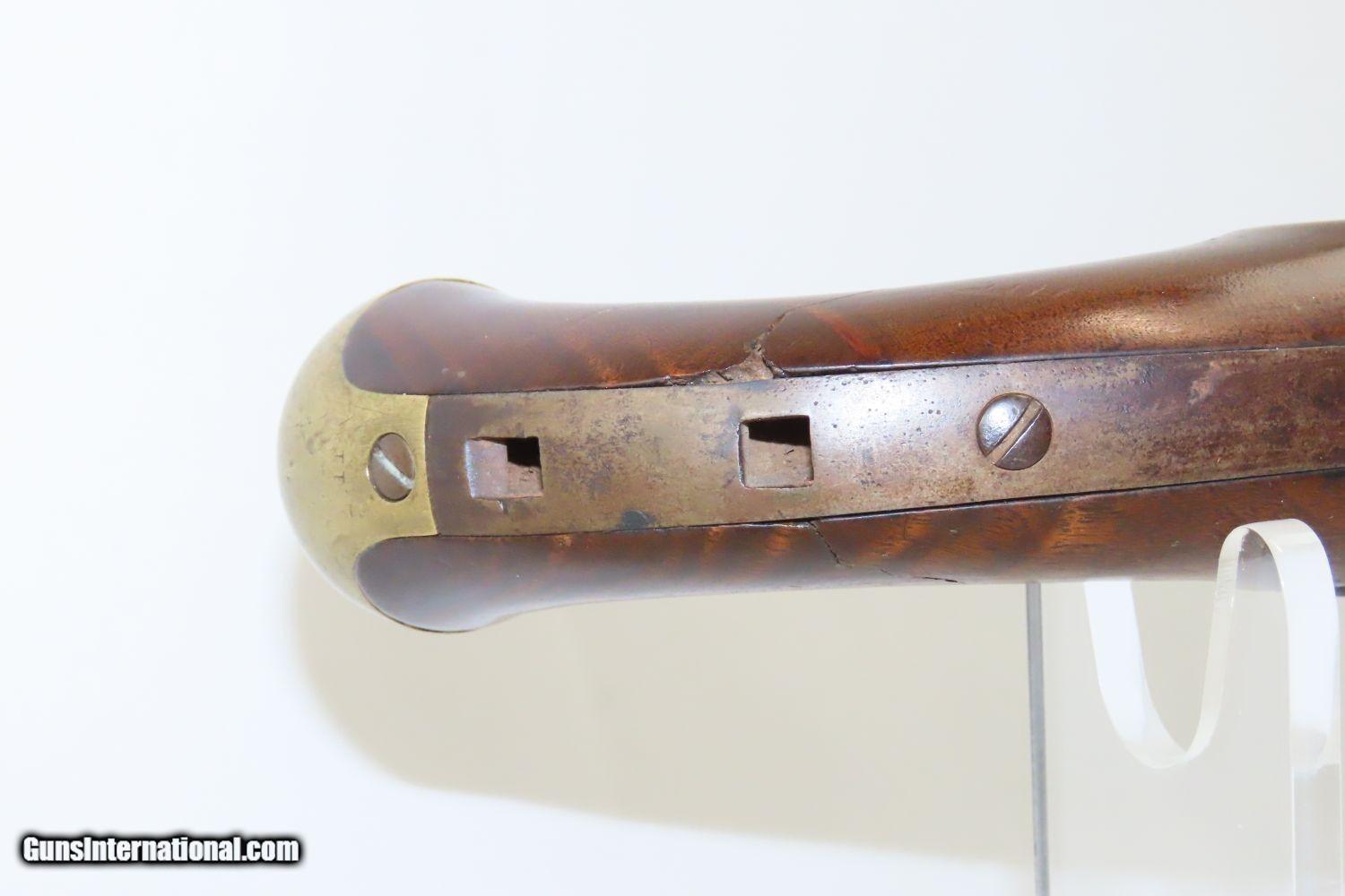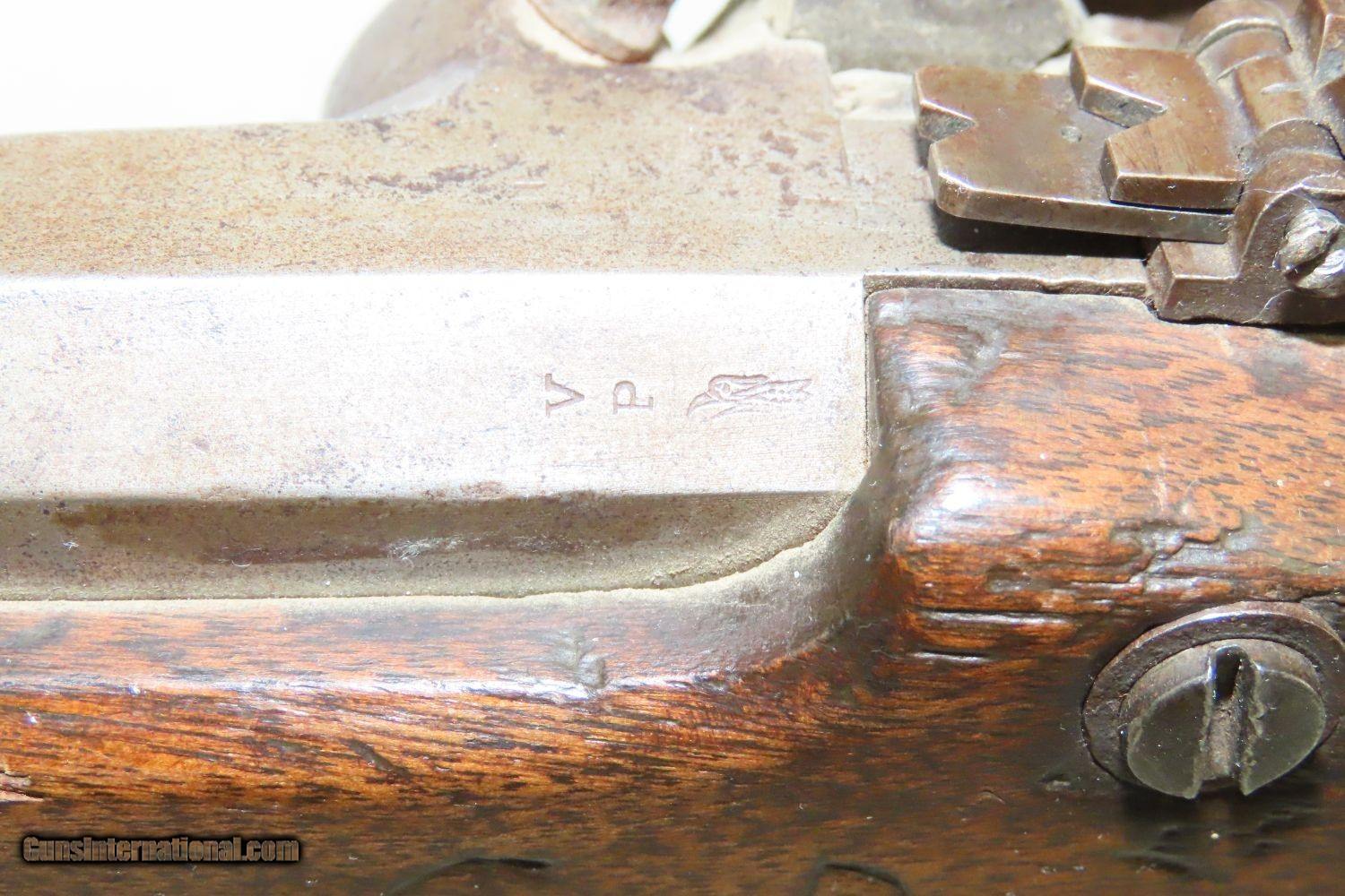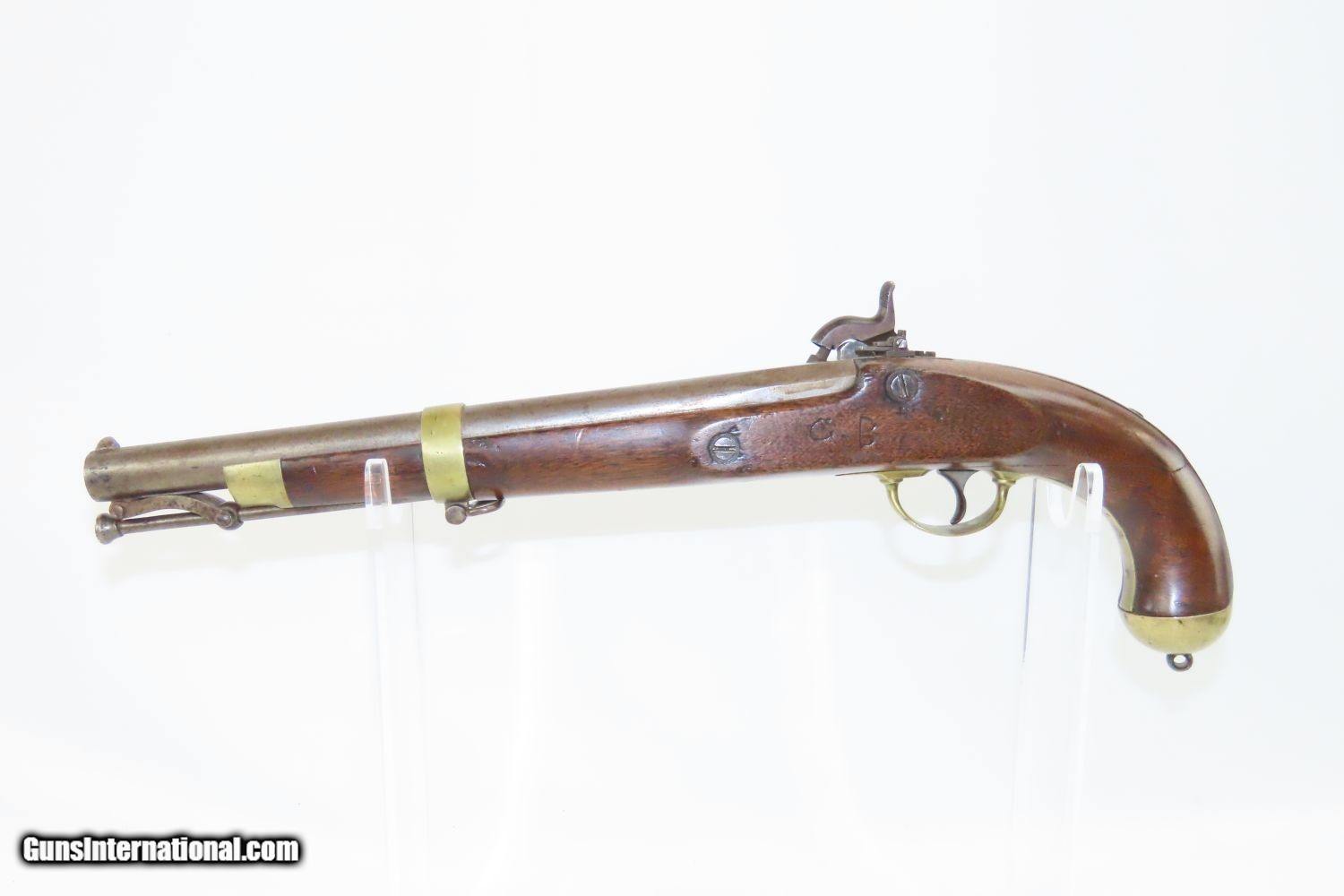 Description: CIVIL WAR Antique US SPRINGFIELD M1855 MAYNARD Percussion Pistol-Carbine 1 of ONLY 4,021 Made at SPRINGFIELD for CAVALRY Here we present an antique Springfield Armory Model 1855 Pistol Carbine, made in the second production year of 1856, five years prior to the outbreak of the American Civil War. Only 4,021 of these were made, making them very rare, especially considering that many would have been lost during the war. The concept was for all U.S. Army troops to have a common caliber, so that logistics would be simplified, and have a (massive) pistol that cavalry could use while mounted, with an attachable stock for use when on foot. The chosen caliber was .58, and it utilized the cutting-edge cone-shaped Minié ball with the hollow base instead of ball. Also, relatively new and short-lived was the Maynard tape priming system, to which Springfield had purchased the rights. Instead of directly priming the nipple by hand for each shot, the user would simply install a roll of paper percussion caps, and a single cap would be exposed, sheared, and carried by the hammer to detonate on the nipple. Of course, the standard rifle percussion caps could also be used. The ramrod is captive on a swivel, so that it was not easily lost in the field, with a hollow tip for pushing the Minié ball. All of these features were included in this compact package to be issued to Cavalry and some Artillery, and it sounded like a brilliant idea. Then U.S. Secretary of War Jefferson Davis (soon to be President of the Confederate States of America) approved the adoption and production of the entire Model 1855 line of rifles, carbines, and pistol carbines. However, reports from the field painted the pistol carbines as rather unwieldy, the tape primer system unreliable, and the carbine stock a detriment to accuracy. By this time, Colt had developed lines of very handy and reliable 6-shot revolvers and a plethora of breech-loading cartridge fed carbines would bring a swift end to production. Nevertheless, these remarkably interesting weapons were very much utilized on both sides during the Civil War and are highly valued in the collector’s market today. The Model 1855 is otherwise distinctive in U.S. Military firearms history for being the last single shot percussion pistol issued, as well as the only pistol other than the Model 1911 made in significant numbers by Springfield Armory. The overall condition is good. The action is strong. The bore is in good shape. There is a crack in the grip of the stock. There is a little movement in this area but it is held by the hardware. The left side of the stock reads “C.B.” while the lock is dated “1856”. The lock is also engraved U.S./SPRINGFIELD”. The barrel tang is dater “1855”. An enormous pistol or a small carbine for the horse soldier in the years leading up to the American Civil War! Own the original! This is a legitimate antique and not a reproduction. Barrel is 12 inches. Caliber: .58 Overall condition as seen in photos. Very Fast. Very Safe. FREE SHIPPING WORLDWIDE. Delivered directly to your door by express mail! Guaranteed AUTHENTIC & Includes CERTIFICATE OF AUTHENTICITY. ancestryguns $1950 #20153 SOLD Antique: Yes |