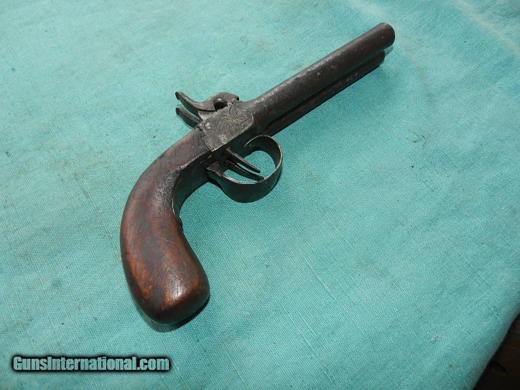 Description: ,,,SOLD>>>A Civil War era double barrel percussion pistol most likely made in Belgium,.This has a 4 1/2 round barrels and strong rifling of the 19th century, no name or ID present as is true of most export guns. Locks work good the left lock however doesn't always catch and can be fired at half cock,I suspect the sear needs the notch recut.Side plates are typcially chisel engraved Left barrel near the breech has an ove, with LEG. The European walnut wood bag grip is good, and has signs of age. The exterior metal is dark brown patina and a few shalow dents along the side of the right barrel. There are patches of very fine pits in places..Check my inventory of rare grips, unusual gun parts, barrels and holsters. Shipping may be higher than stated as shippers raise their prices twice year without notice! When buying a gun always have it examined by a competent gunsmith before shooting. To buy a gun from me you must get a direct email for me, with details, and shipping cost. We don’t have a web site .I prefer money orders or a check. Item ships when funds come in. If you can only pay with a card let me know. I try to keep guns affordable, which means I make less money than most dealers. You won’t get altitude sickness, or nose bleed, with my prices! I consistently have the best selection of older guns If you attempt to buy, you must still contact us for details . Best to email to buy. Sometimes a local person can stop buy and purchase before the gun is removed. Sometimes not home to get calls. Some guns are required shipment to a gun dealer near you for a transfer to you when it arrives. Otherwise many older or black powder guns ship to your door. With the widest selection of older guns at great prices, We don’t have a store, and sell on the internet only. I’m easy to get along with. Thank You. SOLD Antique: Yes |