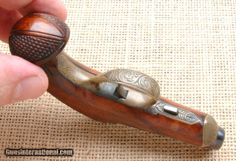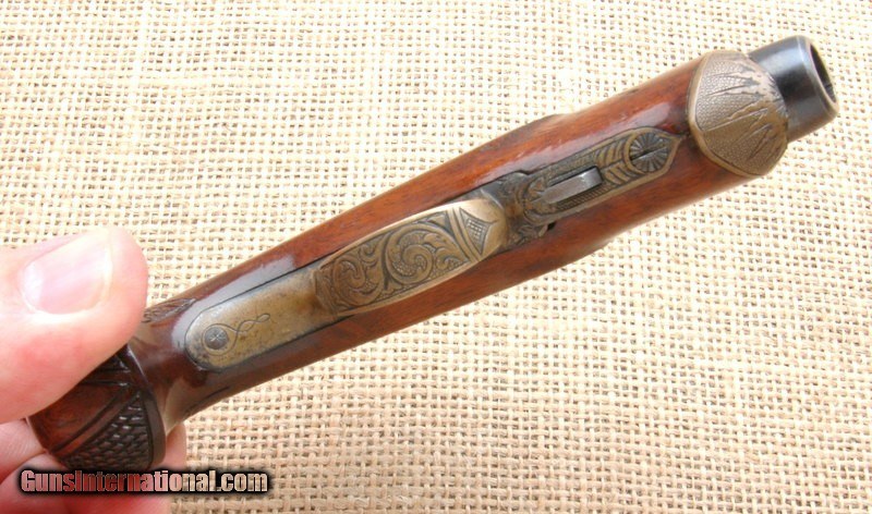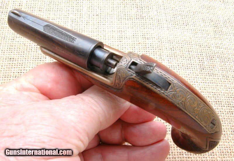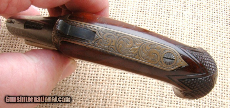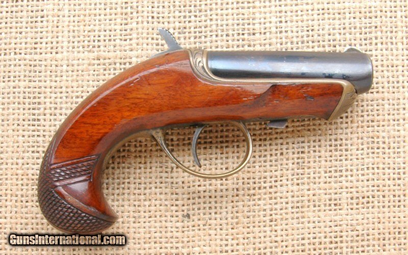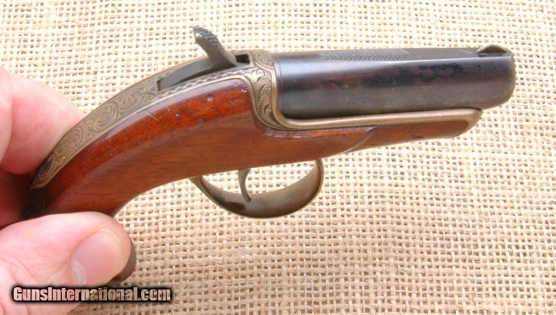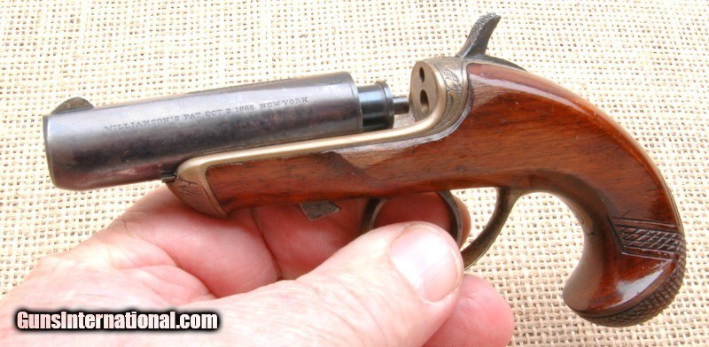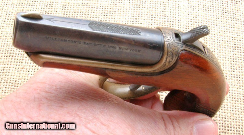 Description: Williamson Derringer. It is believed that less than 10,000 of these small single-shot pistols were manufactured by Moore's Patent Firearms Company and the National Firearms Company of Brooklyn, NY. But this was no ordinary derringer as it had the capability to change ignition system. An auxiliary percussion chamber insert allowed the use of either fixed metallic cartridges or loose powder and ball with a percussion cap. Manufacture Dates: 1866-1870. This a nicer condition one, engraved back strap and trigger guard, works as it should, clean, minty rifled bore. Includes the percussion insert. Stock and checkering is also in overall excellent condition. Sold as is. See the pics for more intel on the condition and appearance. $35 shipping to the lower 48, 3% surcharge for using a CC. If you choose to pay with a personal check, we will hold the item for up to 10 days to make sure that it clears. Please expedite such pymts as we will hold an item on your word for 5 days. SOLD Antique: Yes |