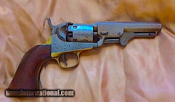 Description: Colt cap and ball pistol commonly referred to as the 1849 Pocket Model Revolver, .31 Caliber Percussion. This personal sidearm, in fine, original condition throughout, bears all matching serial numbers of #144199 indicating a production time in 1858. Action works perfectly. Bore is good. Very good grips with 90-95% original varnish. Gunmetal has faded of original bluing. Revolver is mechanically tight with fine crisp action. This Colt handgun features a four-inch long barrel matched to a .31 caliber, five-shot cylinder that retains a faint roll pressed engraving featuring the ‘stagecoach holdup’ scene. All nipples strong and unbroken. Lockup is tight. All serial numbers match, including loading lever, barrel, cylinder, wedge, frame, triggerguard, and buttstrap. A clear and sharp two-line address “ADDRESS SAML COLT / New York City.” on top flat of barrel. The standard “COLTS / PATENT” visible on the left side of the frame. Sub inspector mark “V” on left shoulder of triggerguard, "M" on frame near upper grip. Screws not buggered up. Called the successor to the Baby Dragoon, the Model 1849 Pocket was a small version of the Model 1851 Navy revolver and proved ever popular through its end of production in 1873. This original Colt .31 caliber Pocket Revolver is a great Civil War time specimen of a very popular percussion firearm. SOLD Antique: Yes Manufacturer: Colt Model: 1849 Serial Number: 141199 Caliber Info: .31 Bore: Good Condition: Good Metal Condition: Good Wood Condition: Very Good Bore Condition: Good |
